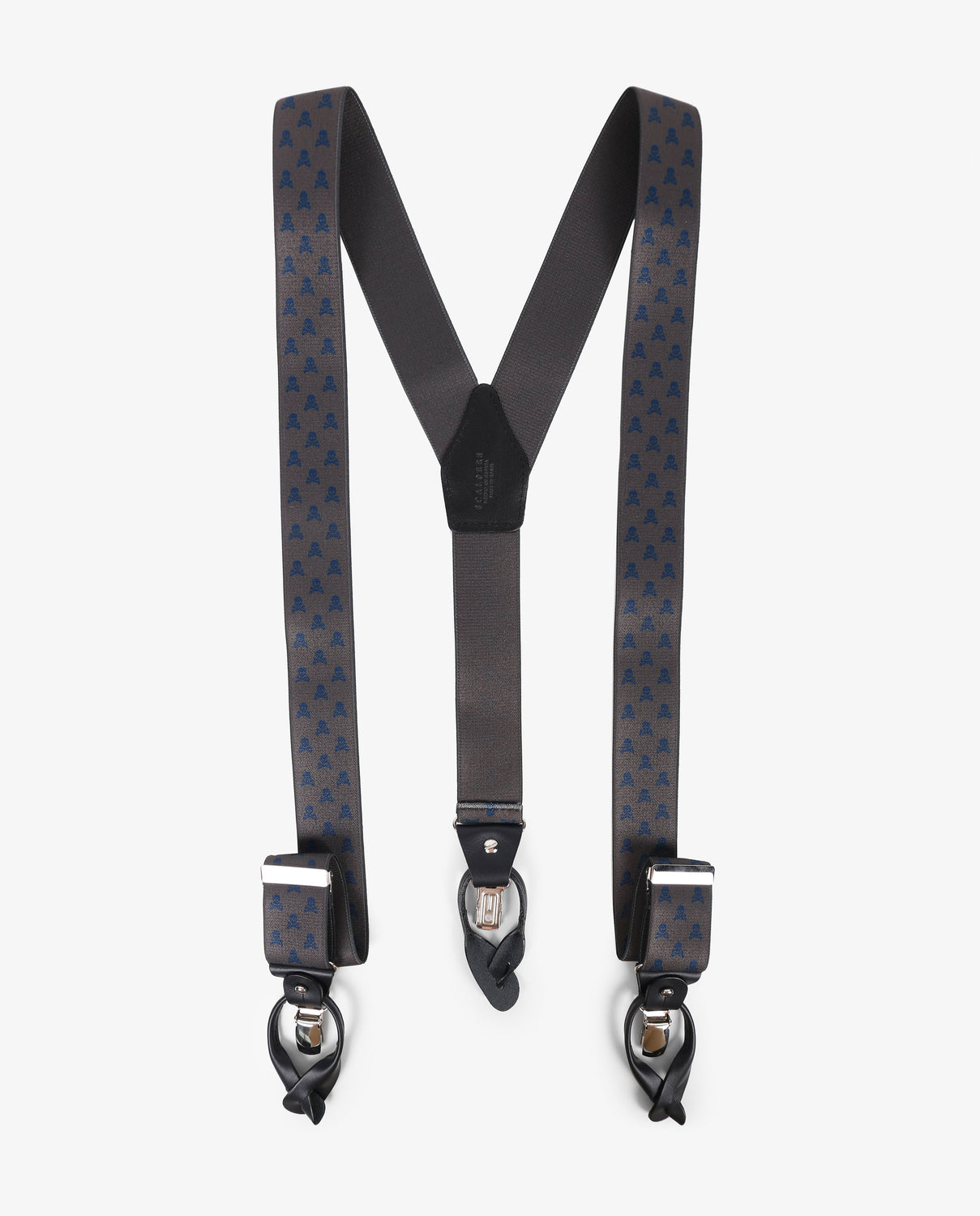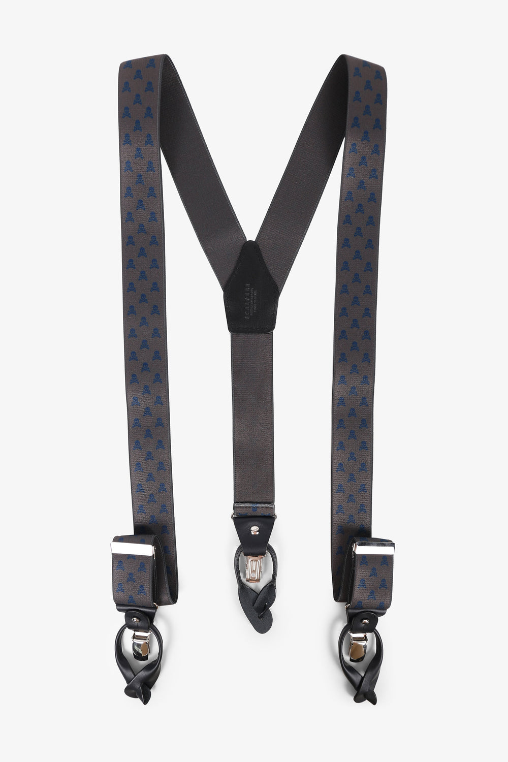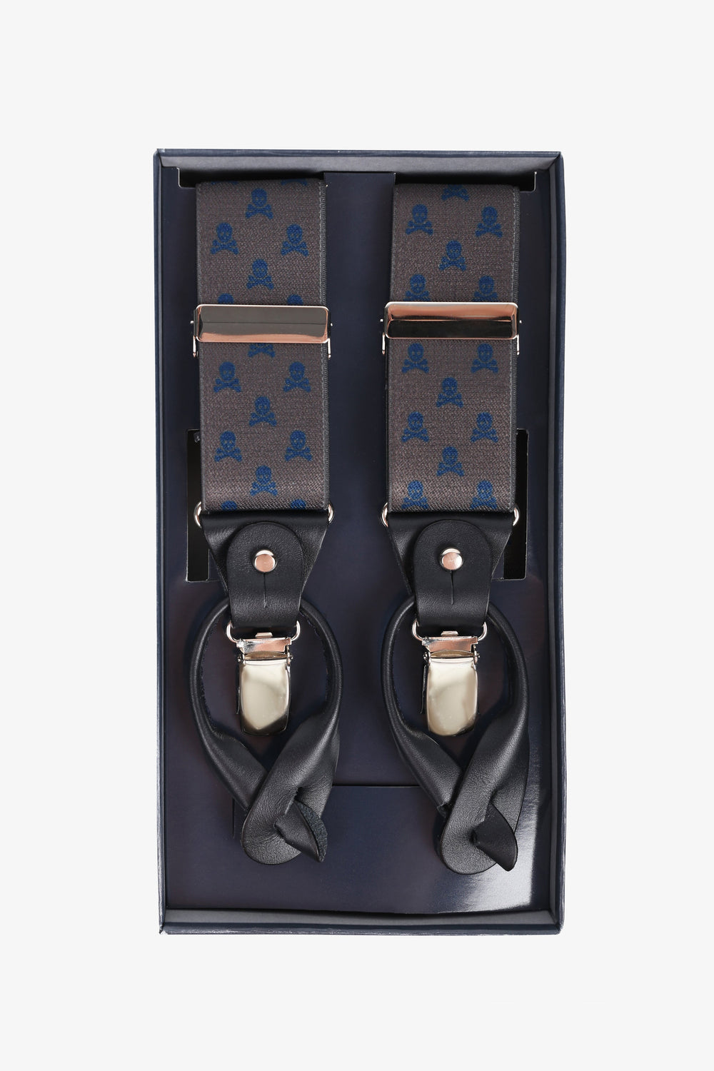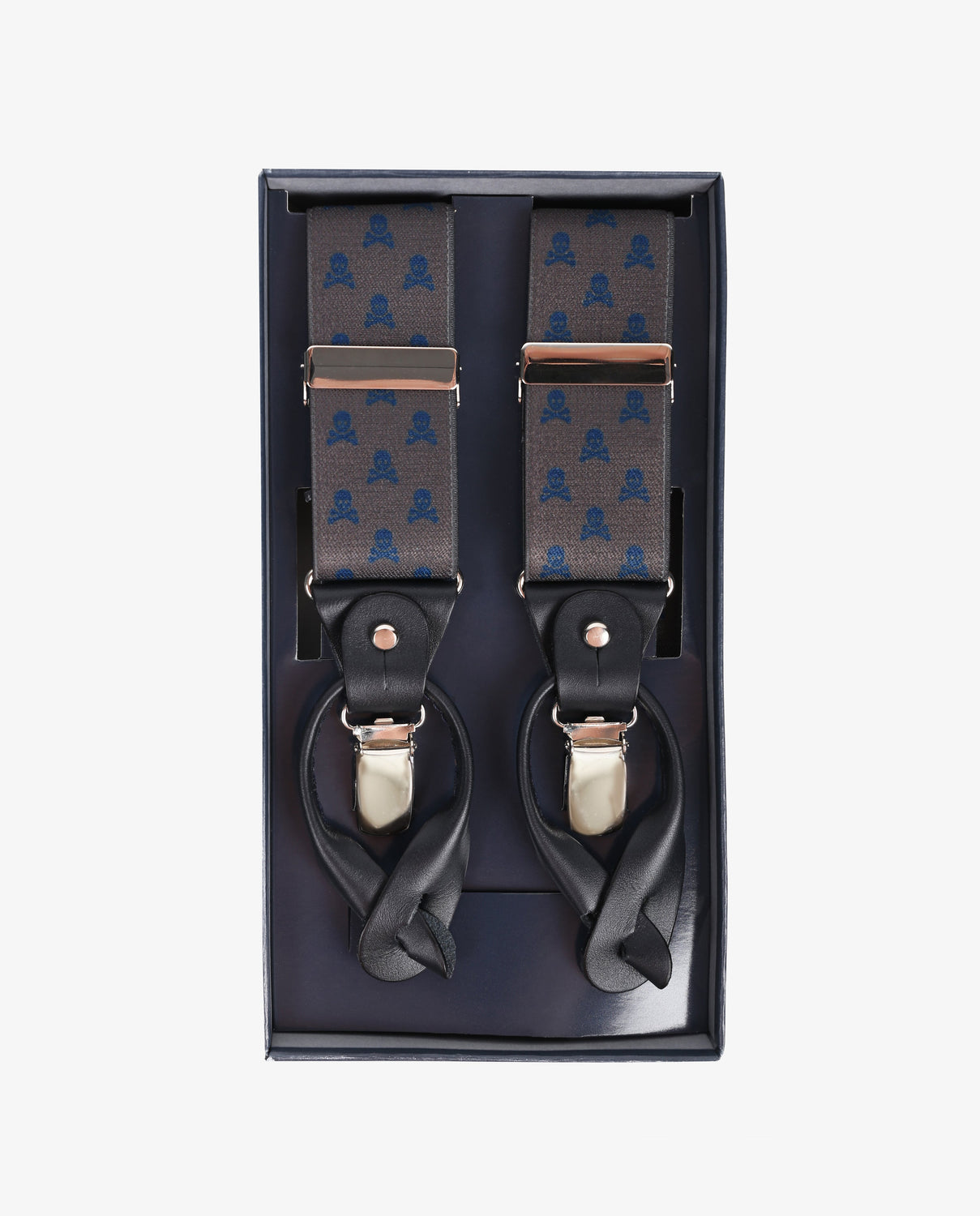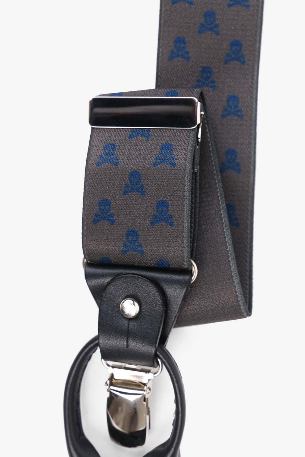 Braces made of a slightly stretchy fabric. Featuring contrast skull print and button loops or clips. The width is 35mm.