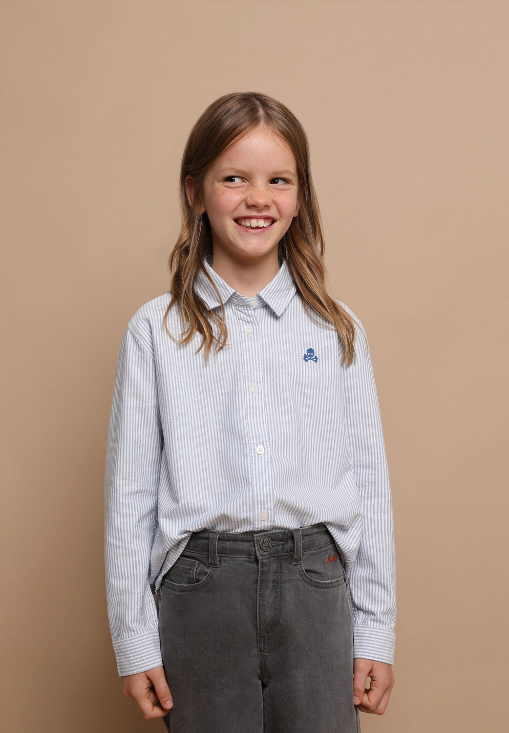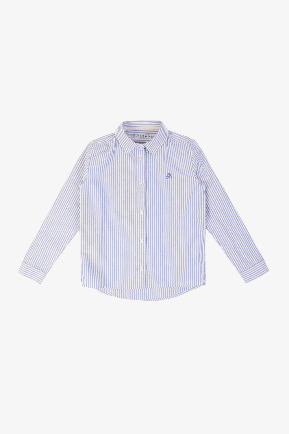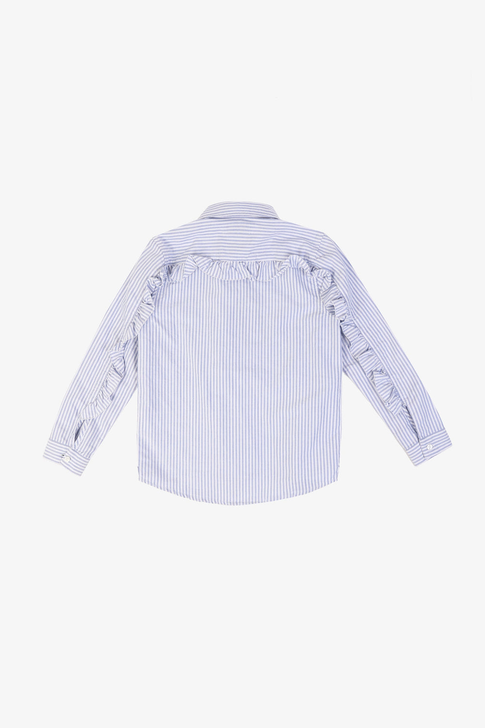 Striped shirt made of 100% cotton. Regular fit, konika collar and button fastening with a placket. Long sleeves with cuffs. Ruffle detail on the sleeves and back and embroidery on the chest.