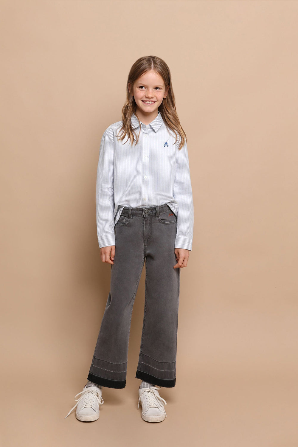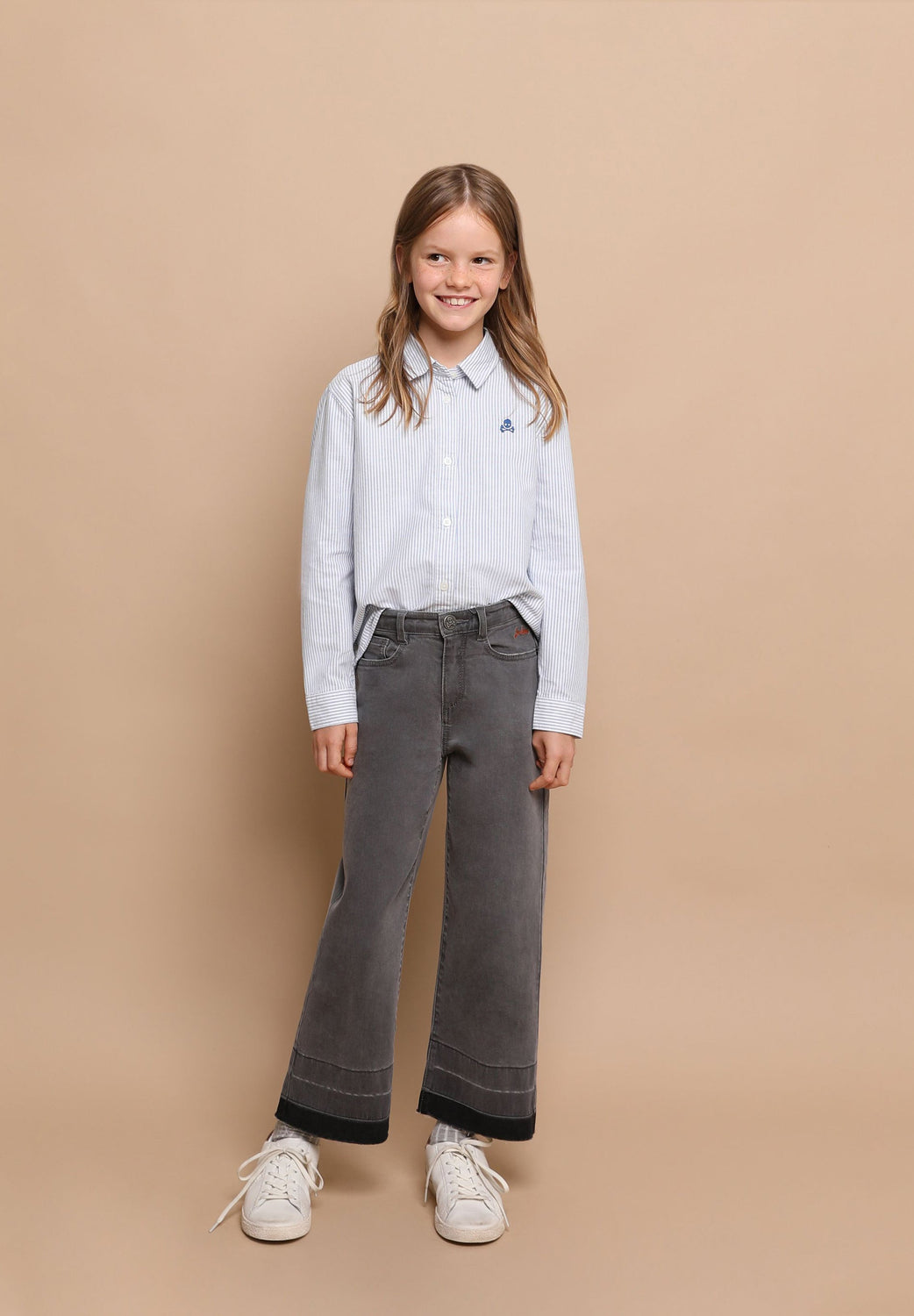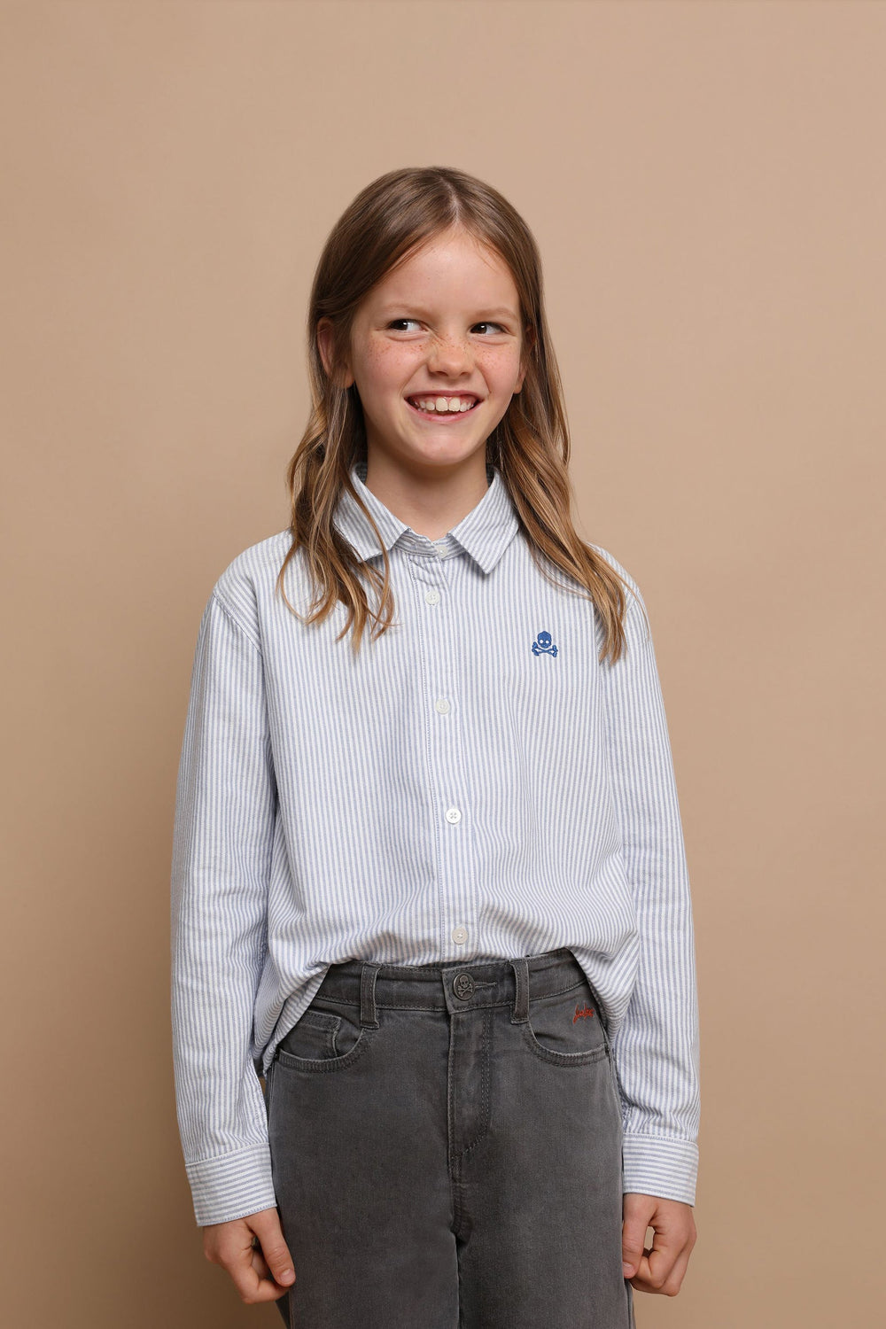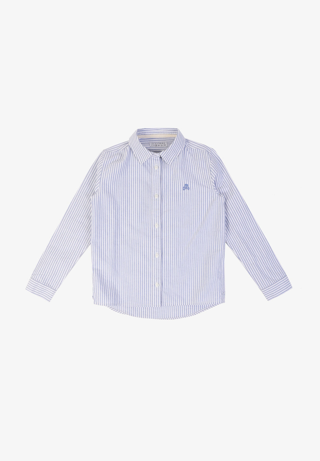 Striped shirt made of 100% cotton. Regular fit, konika collar and button fastening with a placket. Long sleeves with cuffs. Ruffle detail on the sleeves and back and embroidery on the chest.