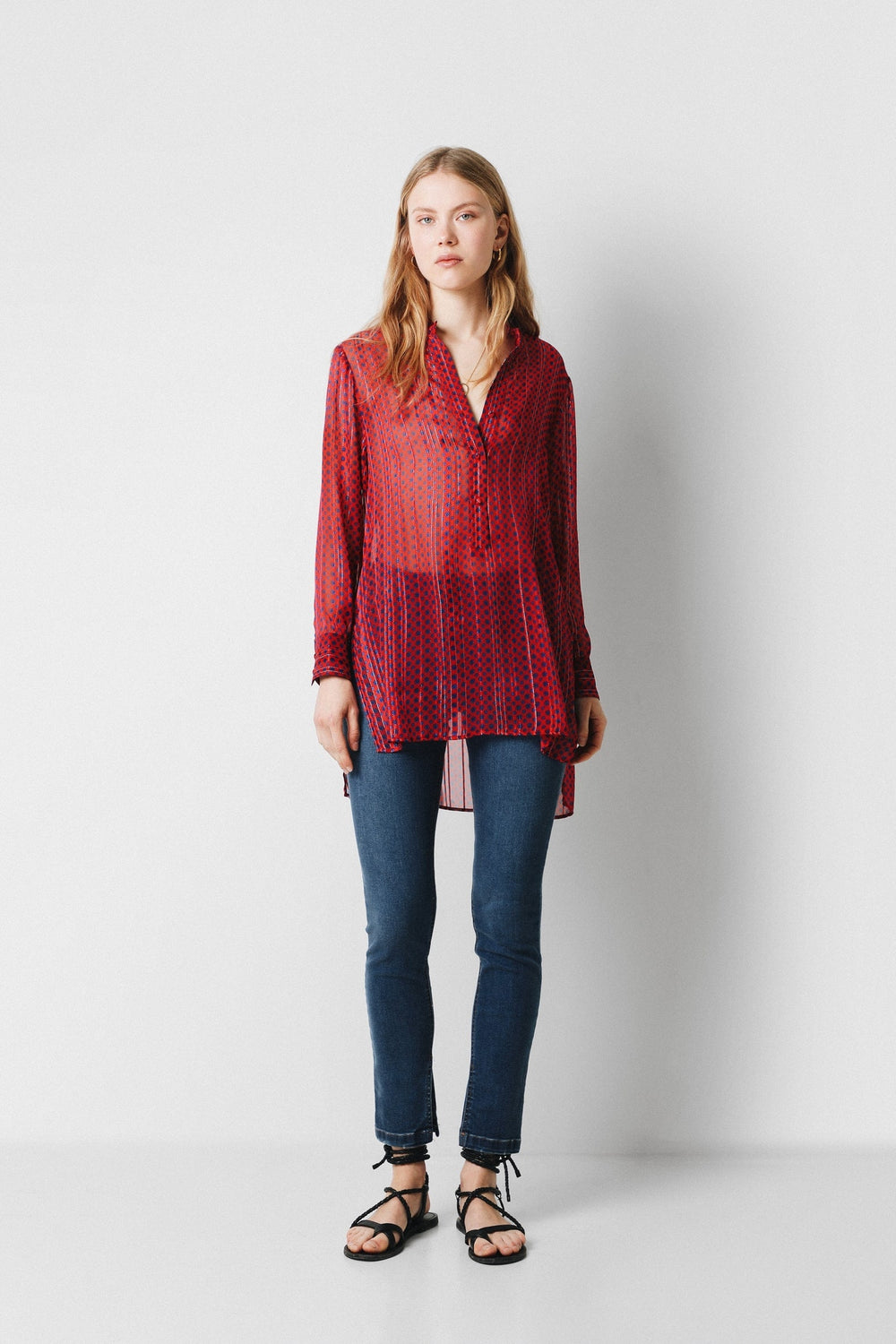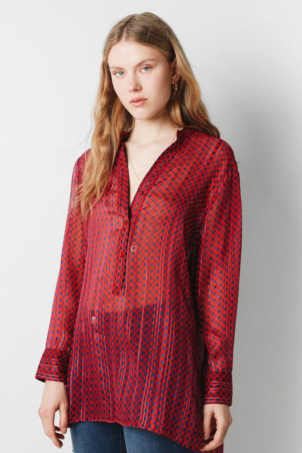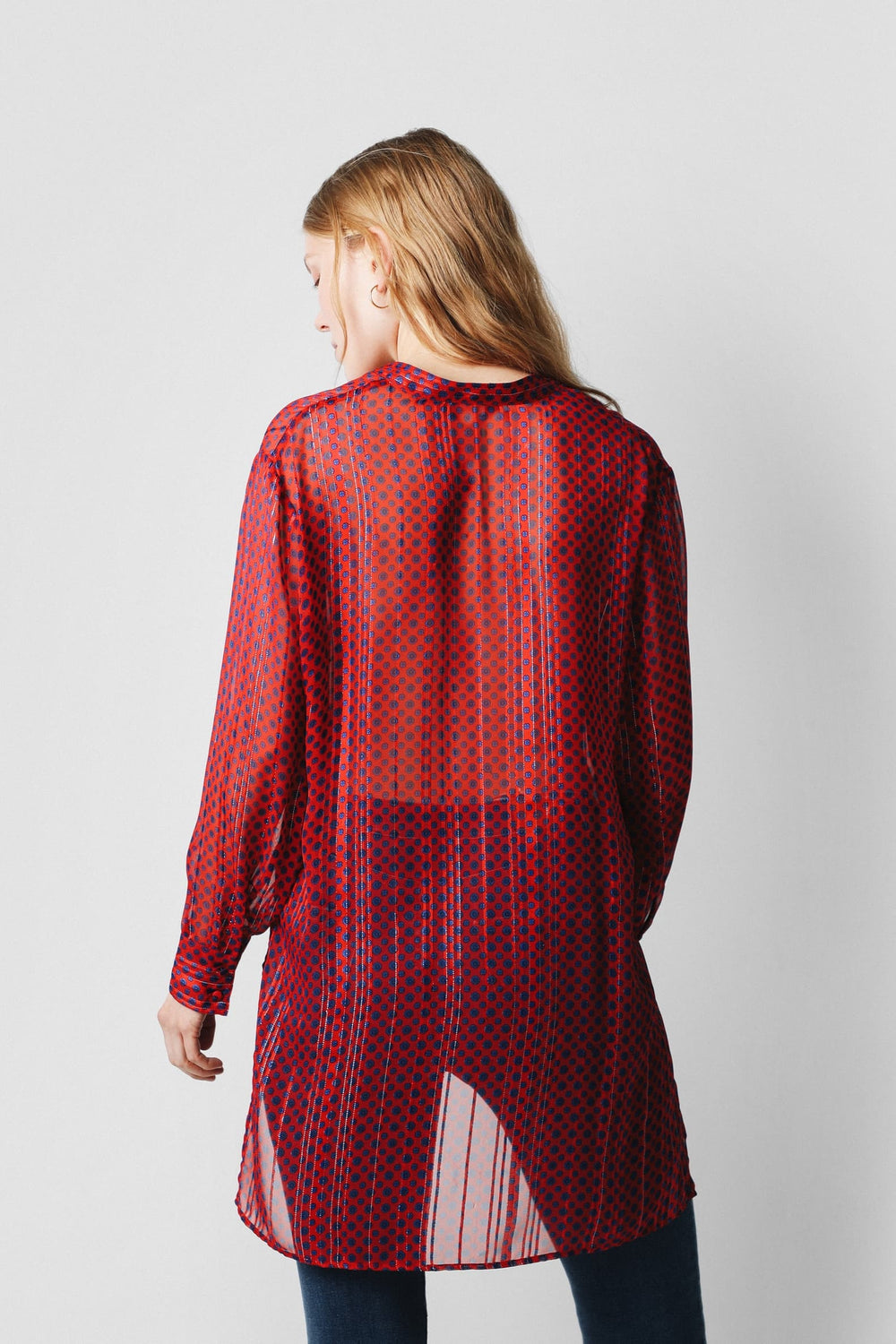 Camisa con estampado de lunares confeccionada en tejido de lurex. Corte oversize, cuello de pico y cierre con botones. Manga larga terminada en puño con botones y bajo asimétrico.