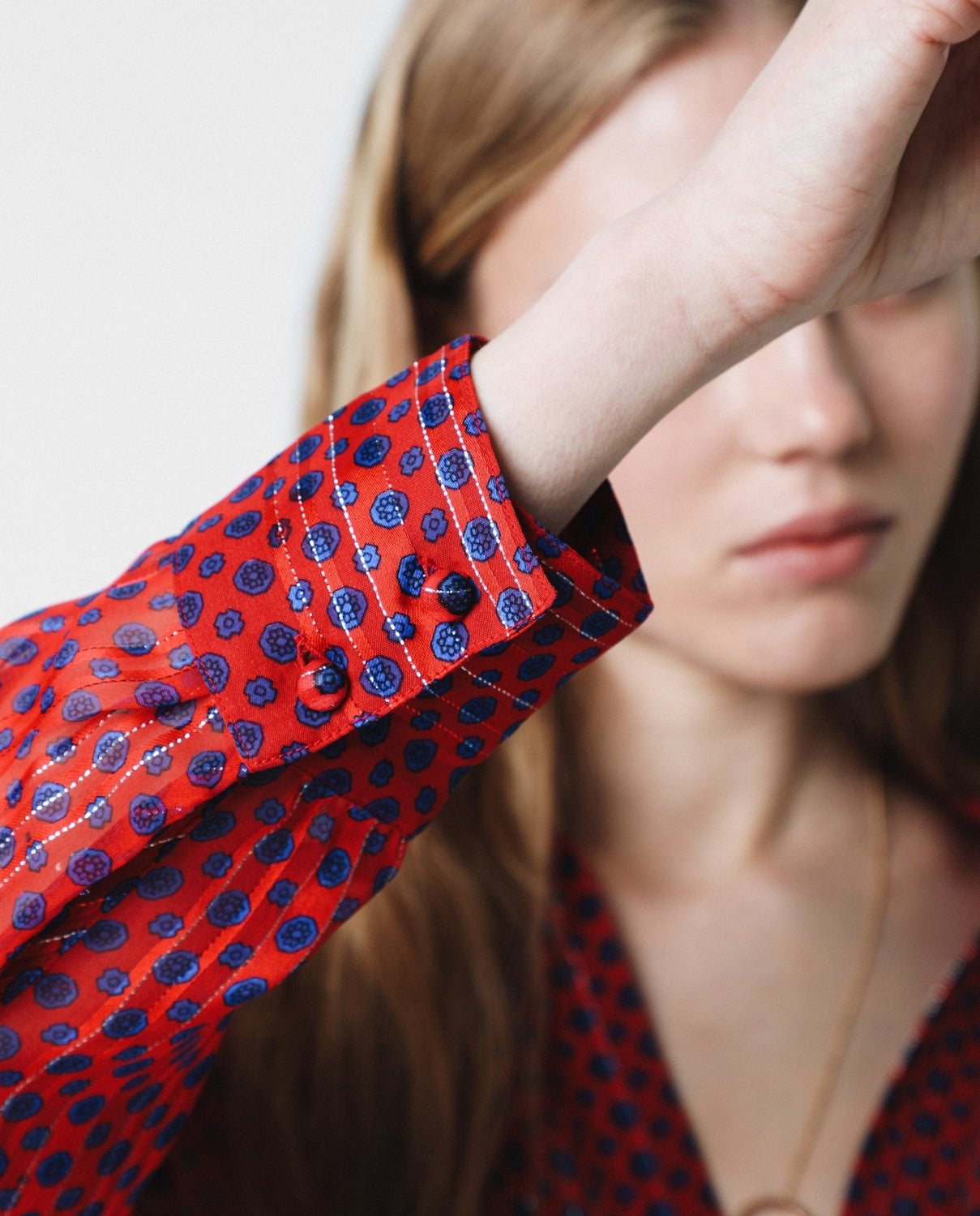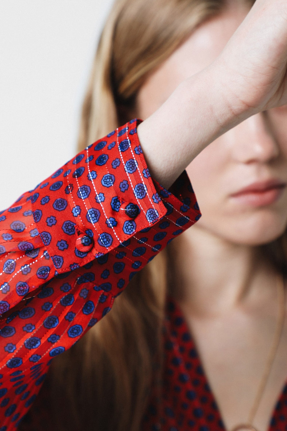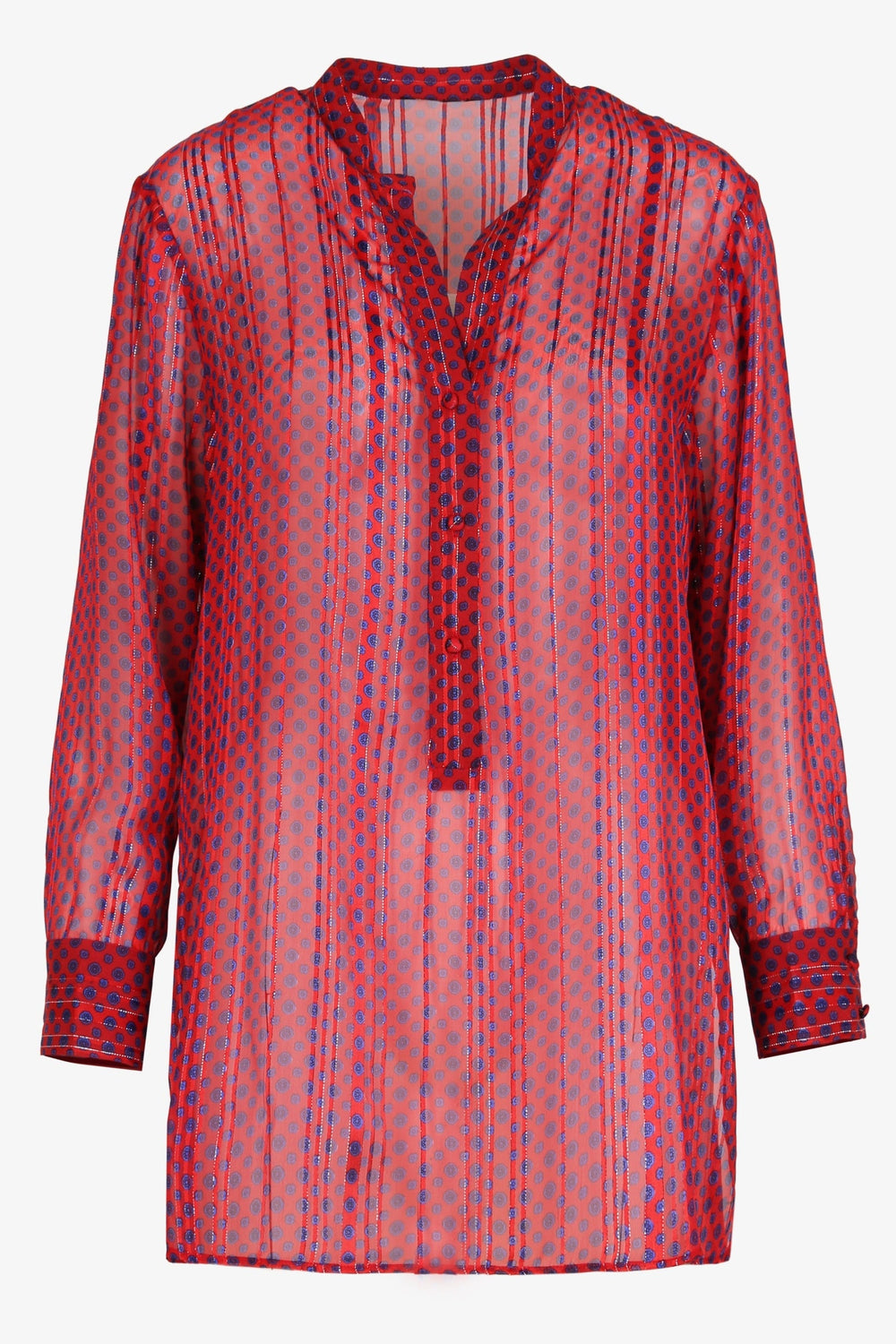 Camisa con estampado de lunares confeccionada en tejido de lurex. Corte oversize, cuello de pico y cierre con botones. Manga larga terminada en puño con botones y bajo asimétrico.