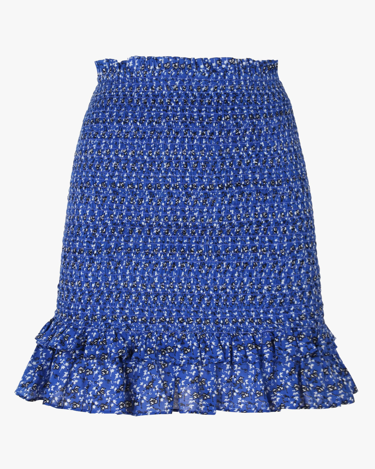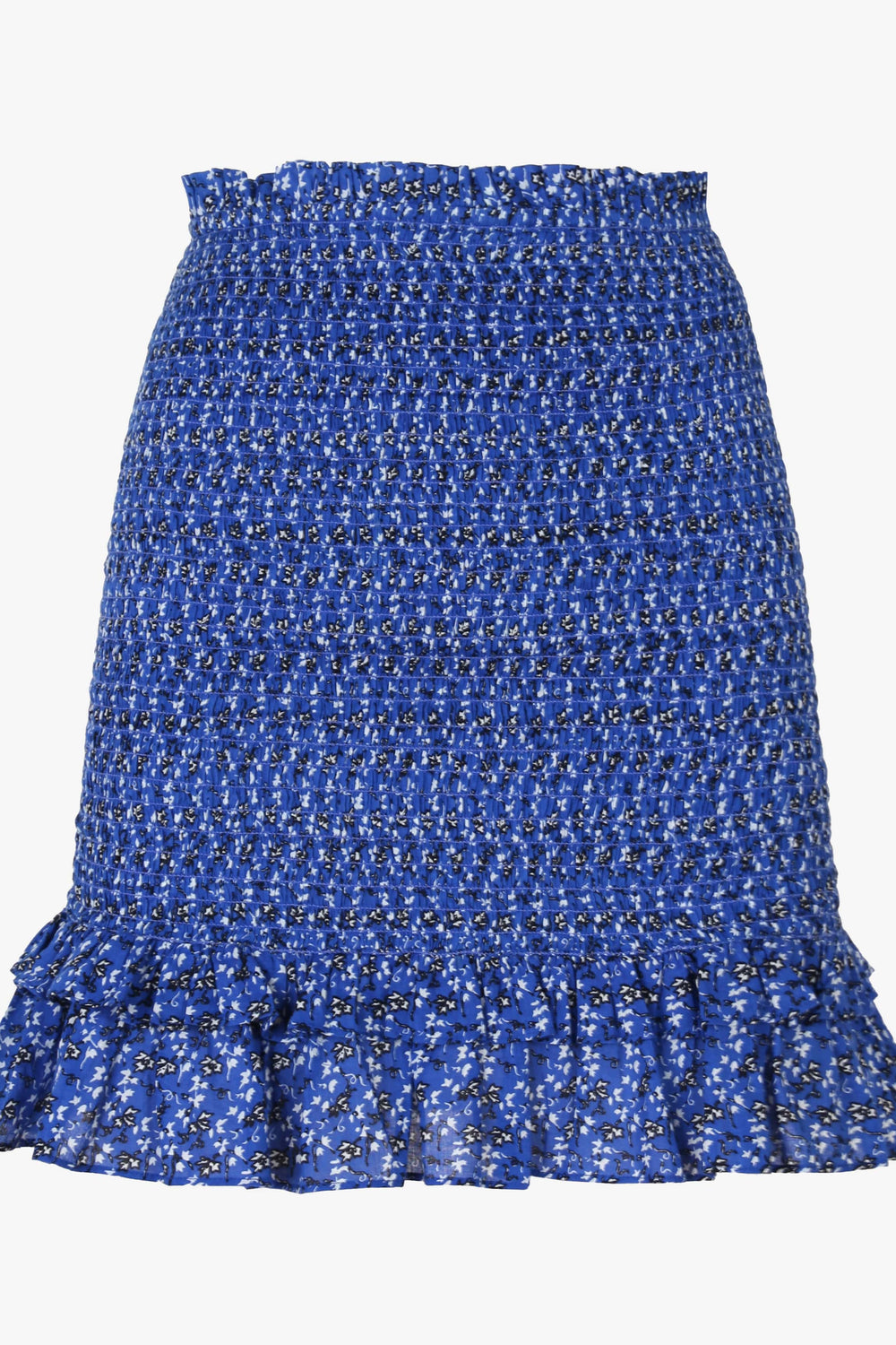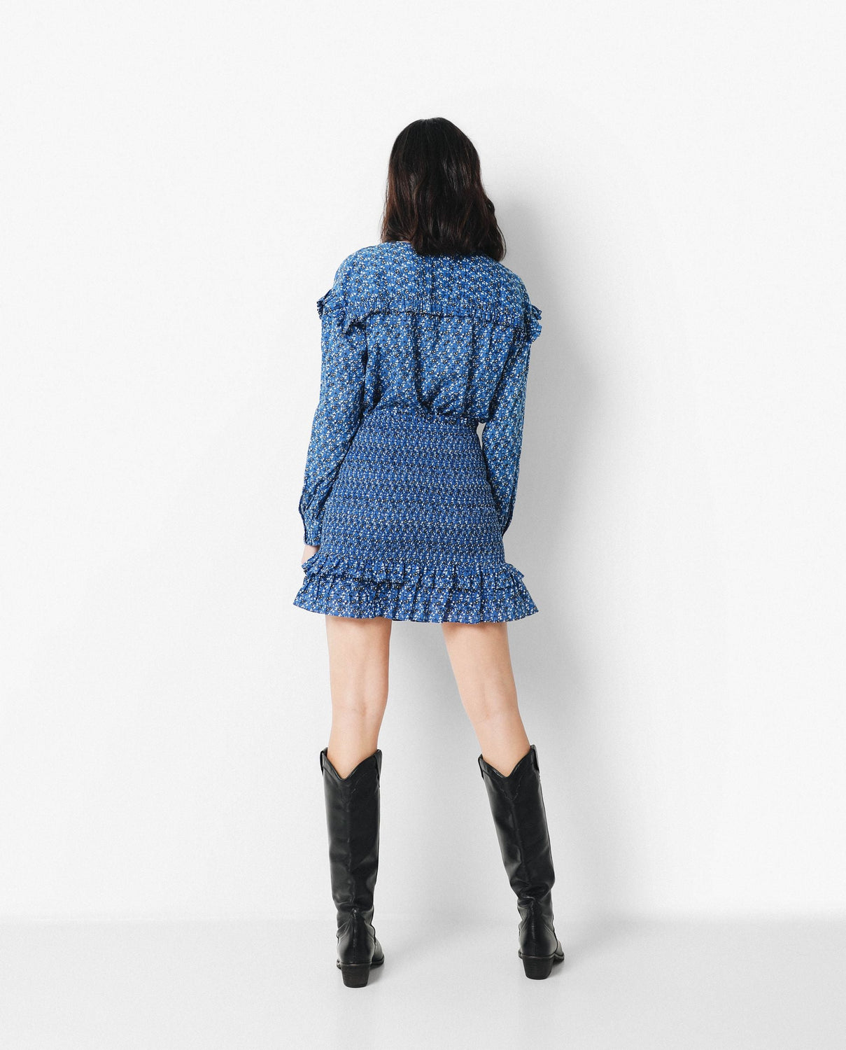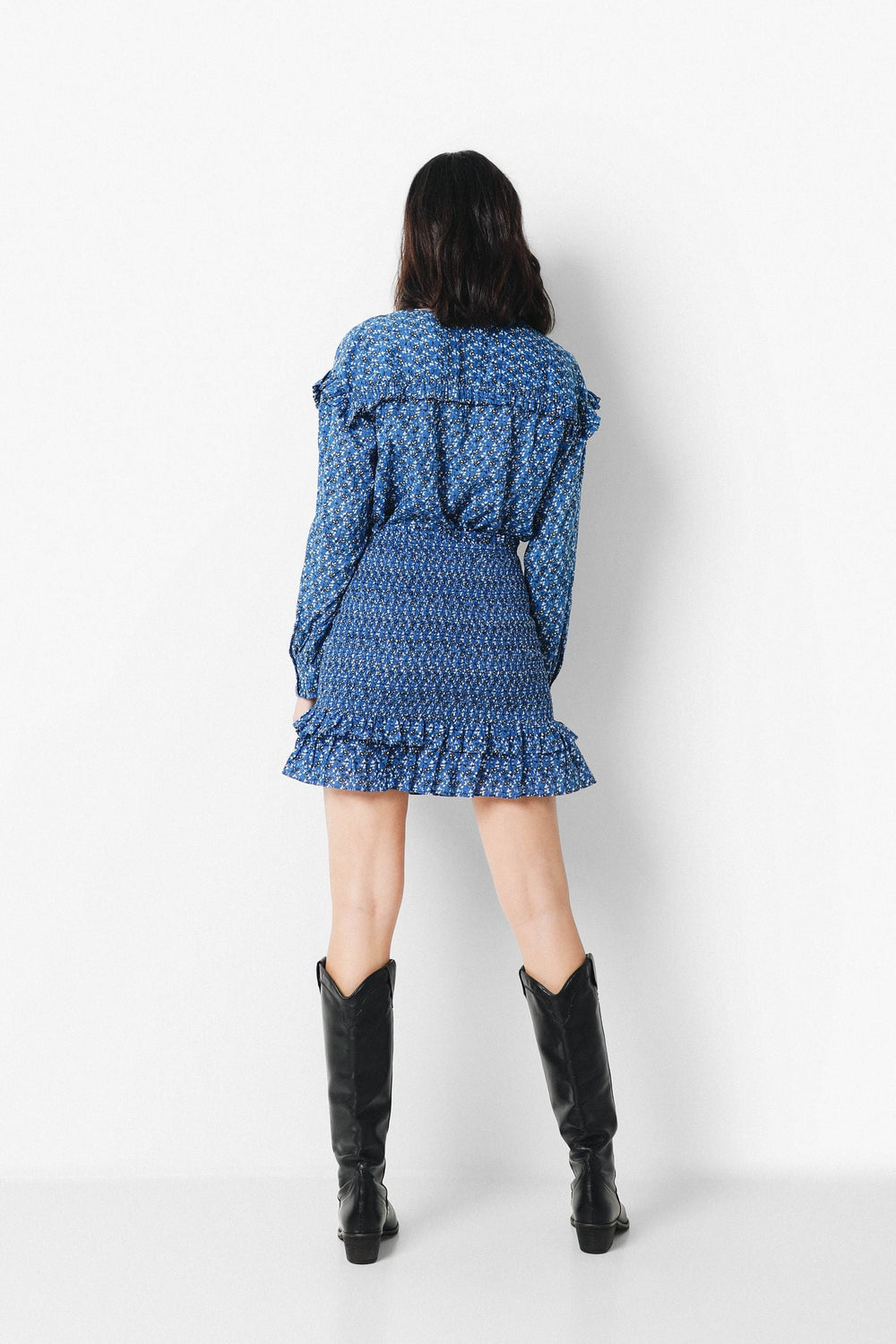 Falda mini de flores confeccionada en tejido 100% algodón. Corte Slim Fit fruncida y detalle de volante en el bajo.