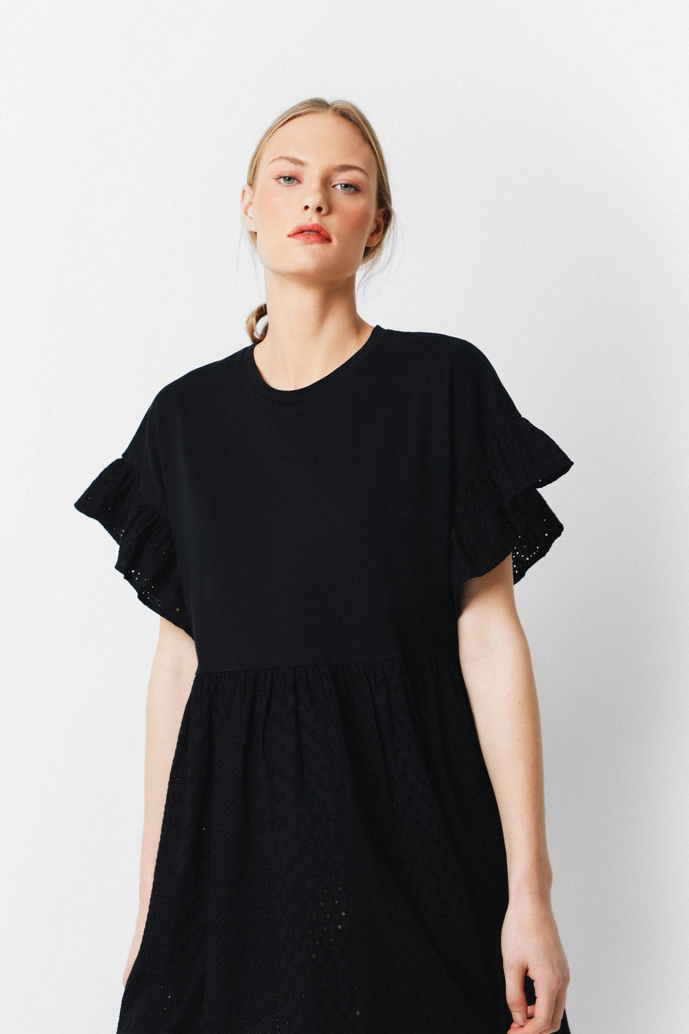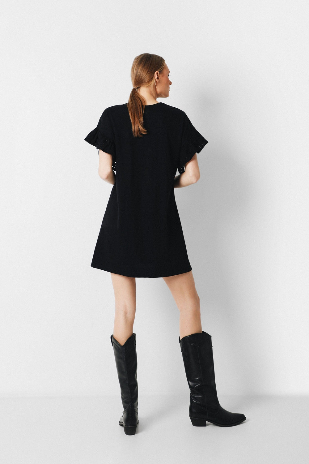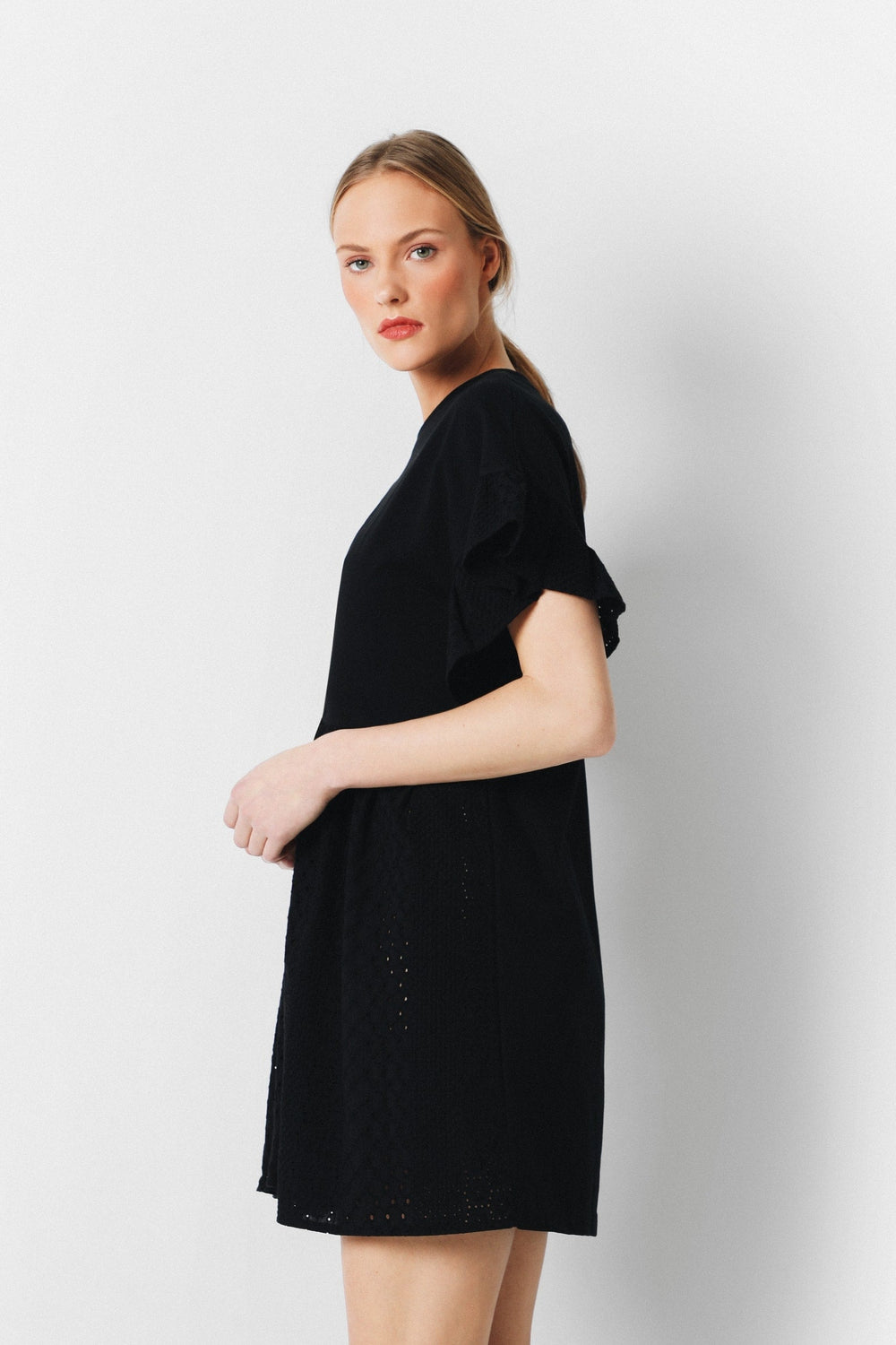 Vestido confeccionado en tejido 100% algodón. Corte oversize, cuello redondo y manga corta. Bordado inglés en mangas y bajo.