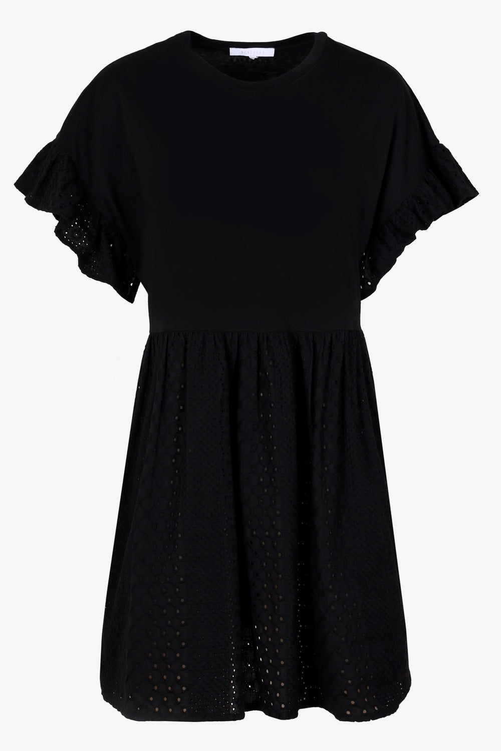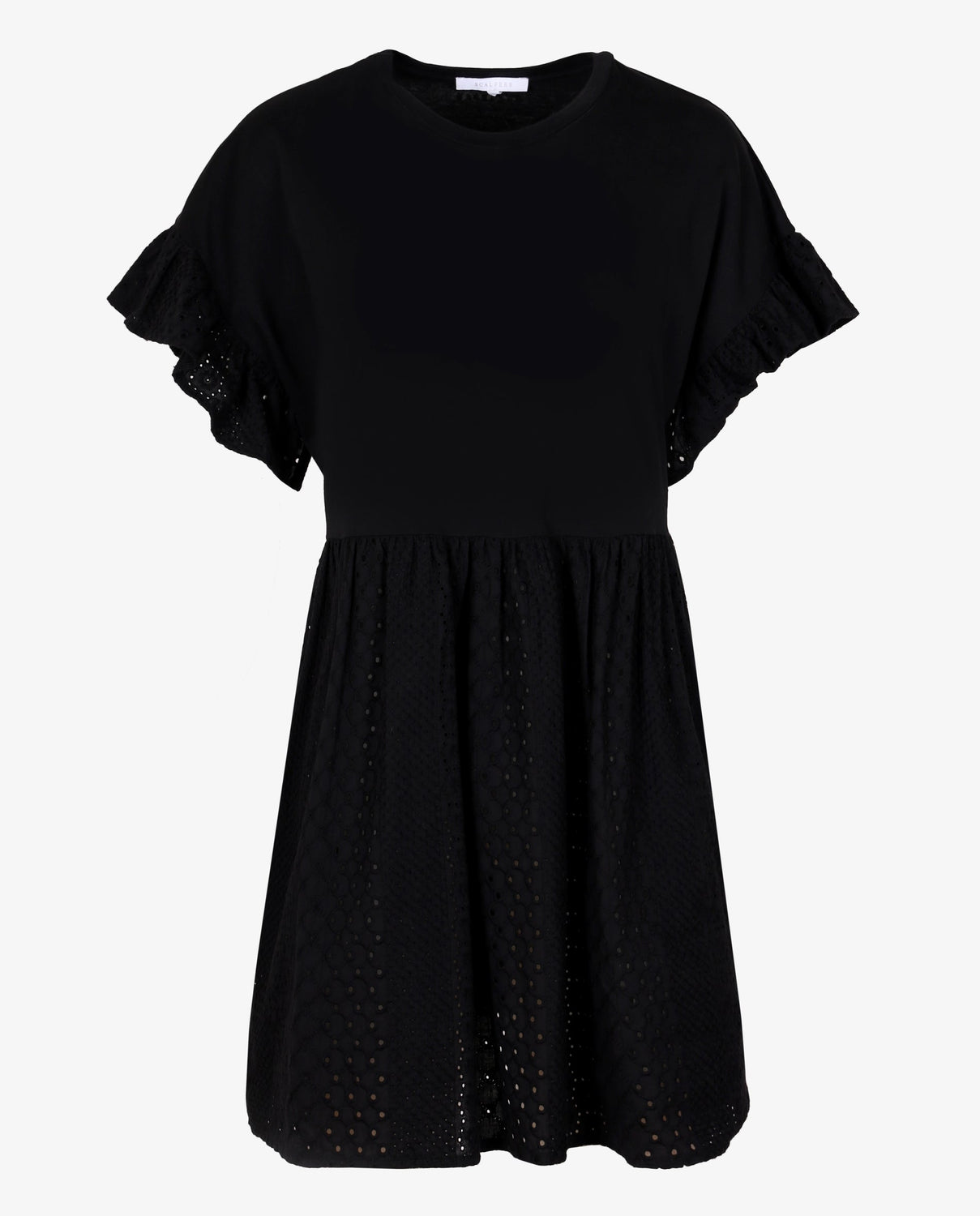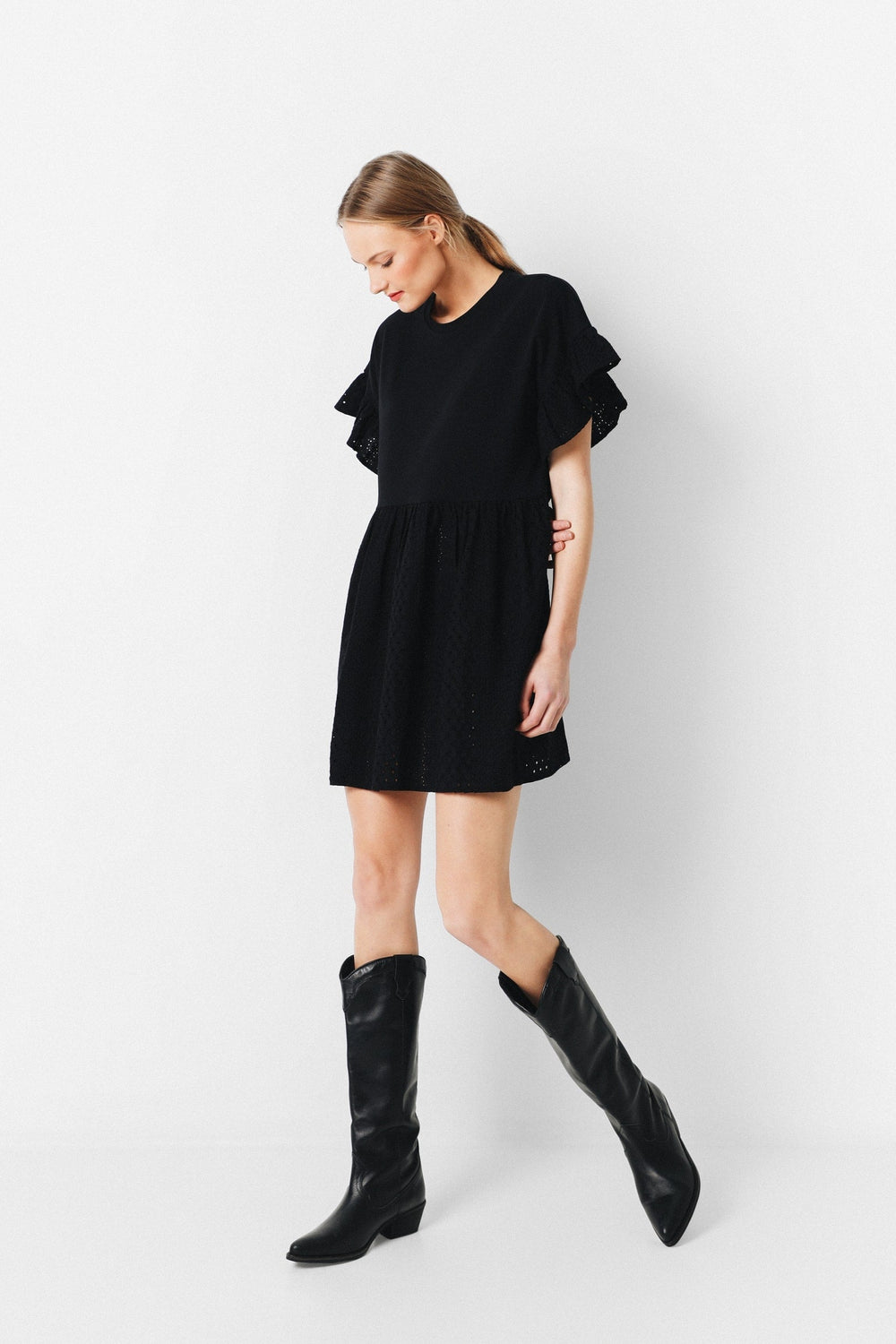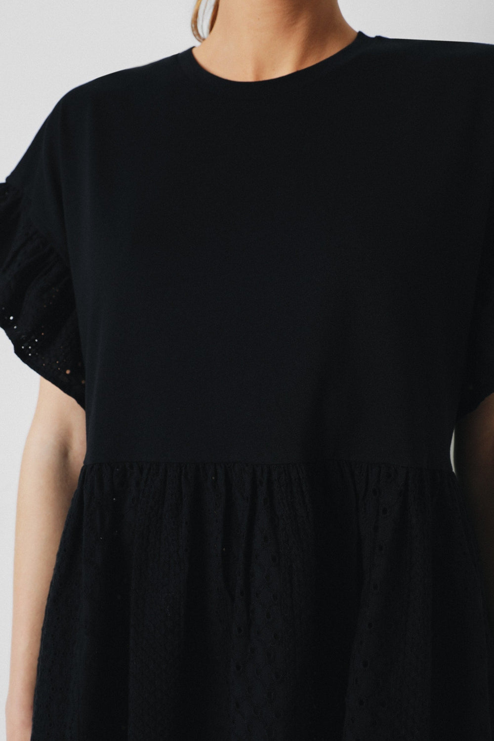 Vestido confeccionado en tejido 100% algodón. Corte oversize, cuello redondo y manga corta. Bordado inglés en mangas y bajo.