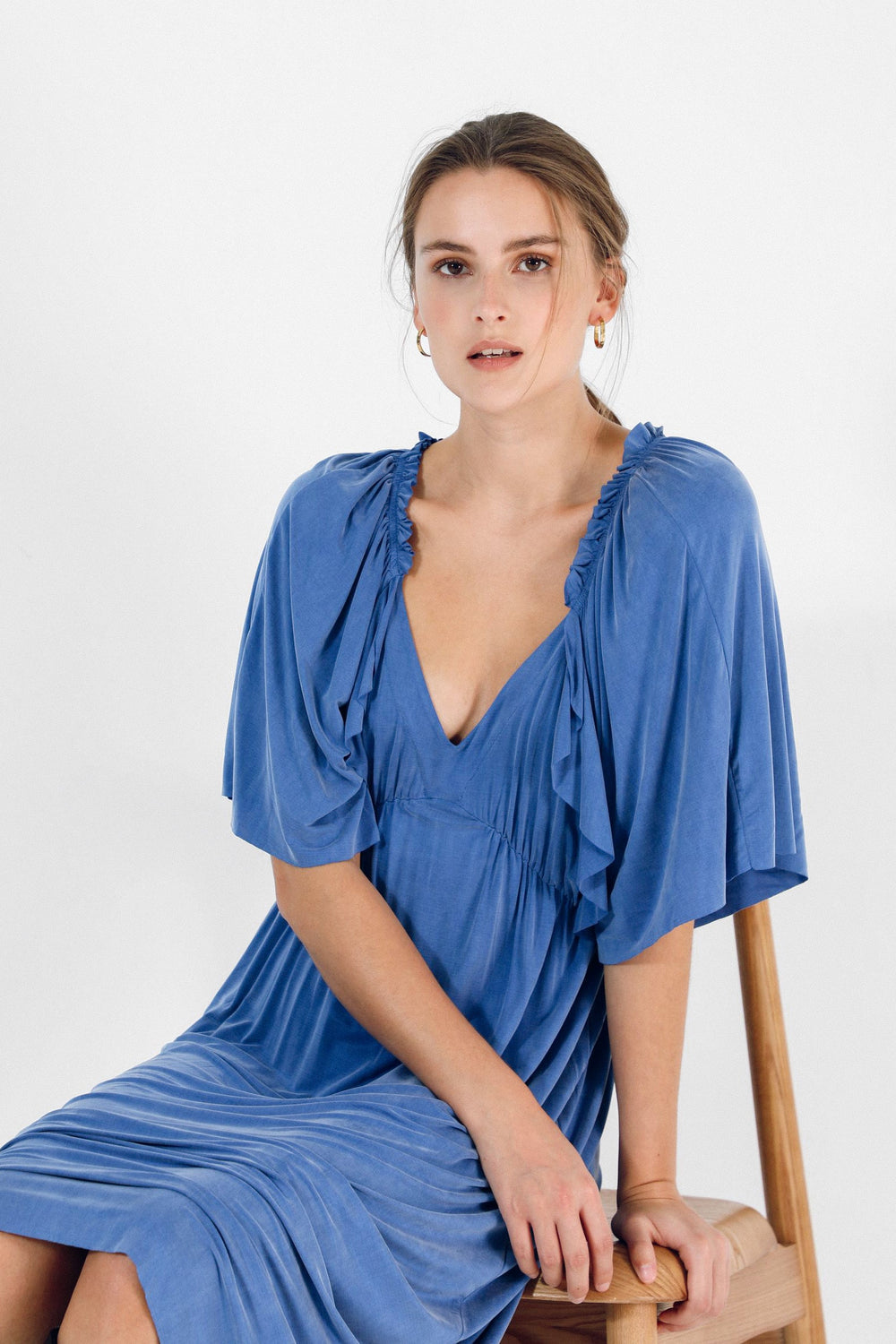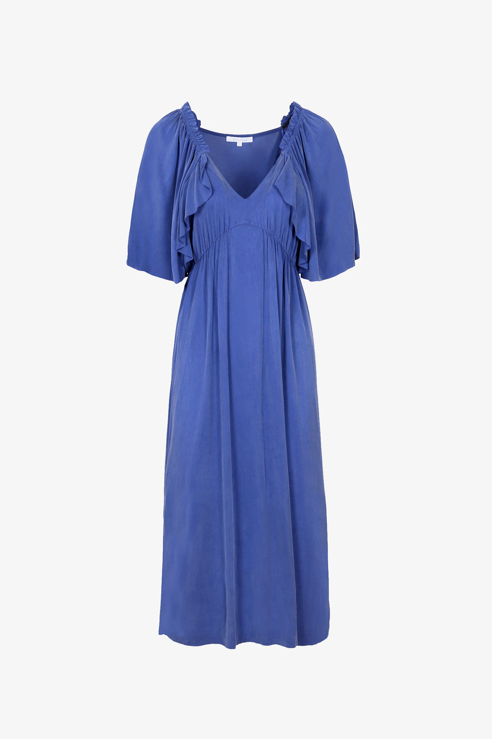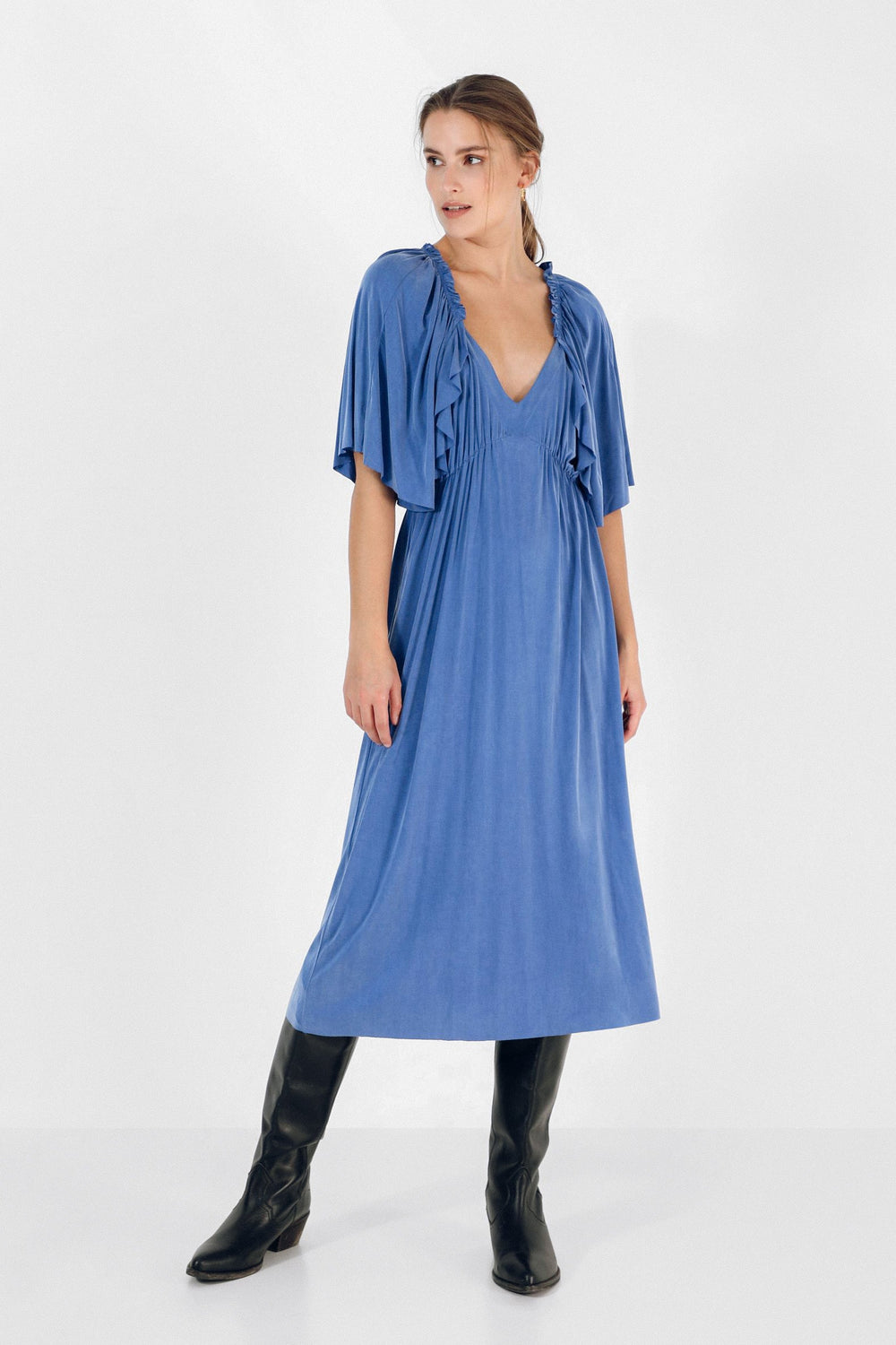 Vestido midi confeccionado en tejido de cupro. Corte en el pecho, cuello con escote de pico y manga corta con detalle de volantes.