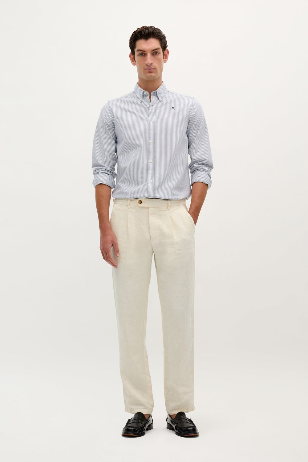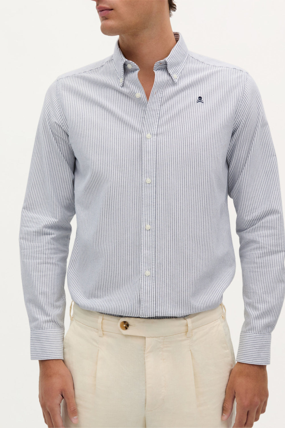 Camisa oxford de rayas con calavera a contraste. Confeccionada en 100% algodón. Corte Regular Fit. Cuello con botones. Cierre con botones. Manga larga terminada en puño simple