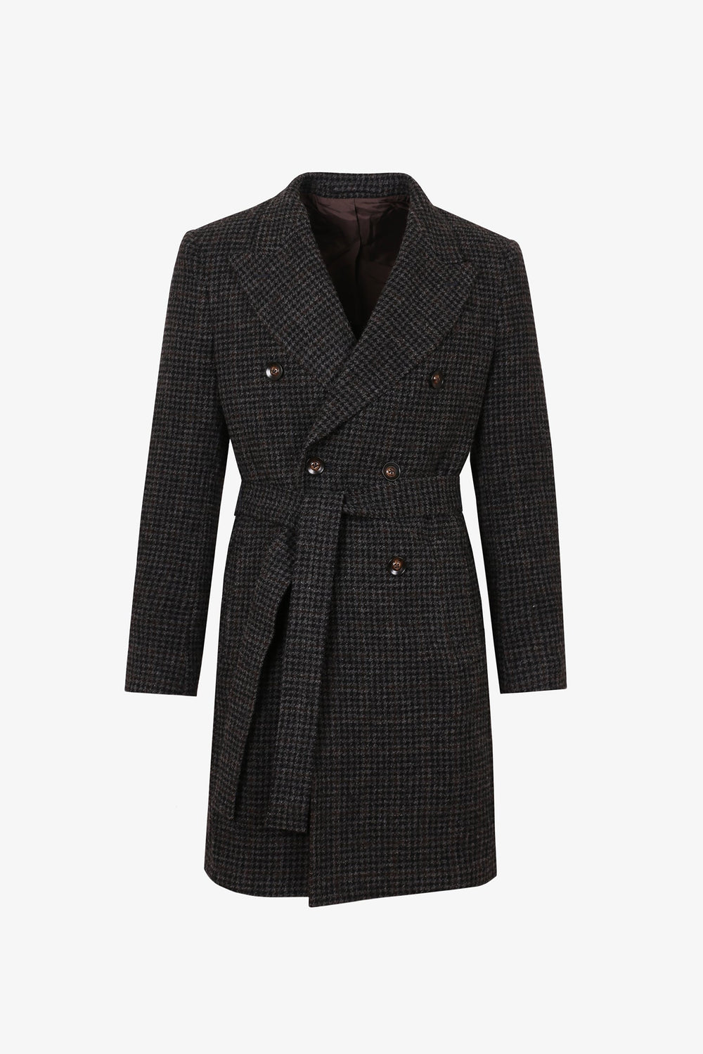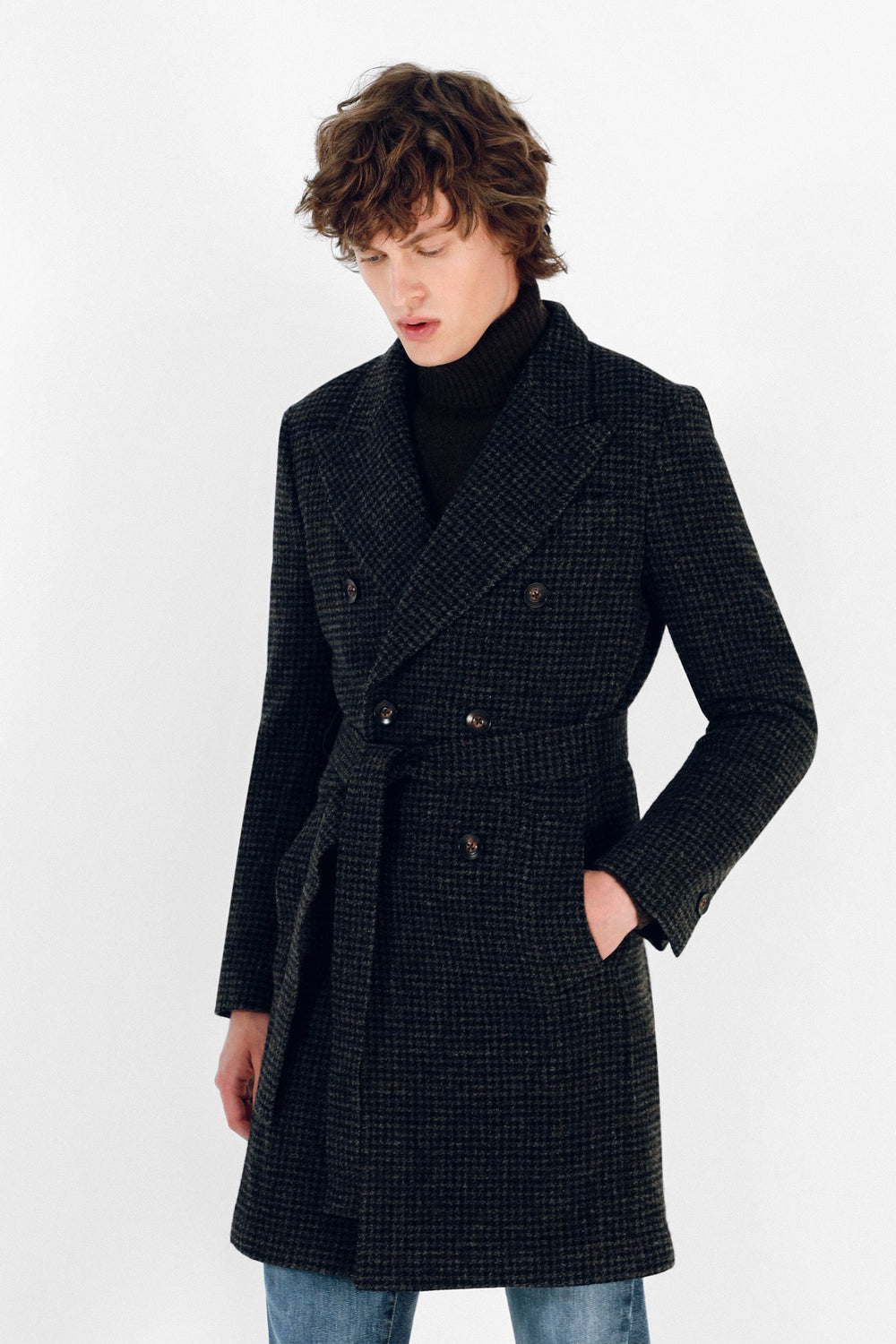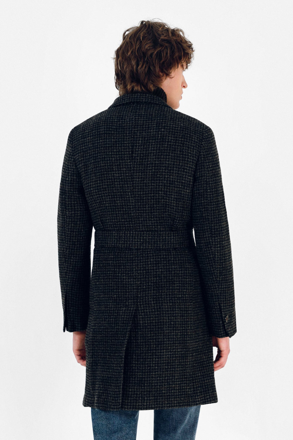 Abrigo de espiga confeccionado en tejido 100% lana. Corte Regular Fit, cuello con solapa de muesca y cierre con botonadura cruzada. Bolsillos laterales insertados y cinturón del mismo tejido.
