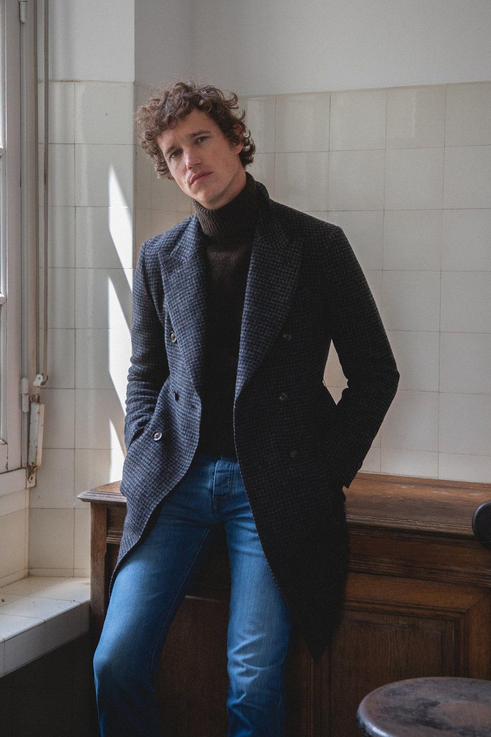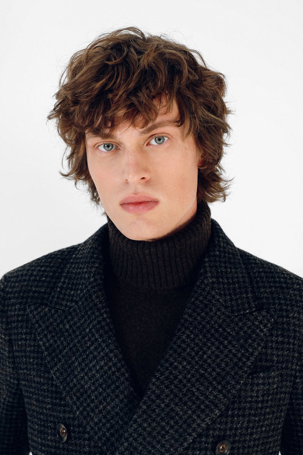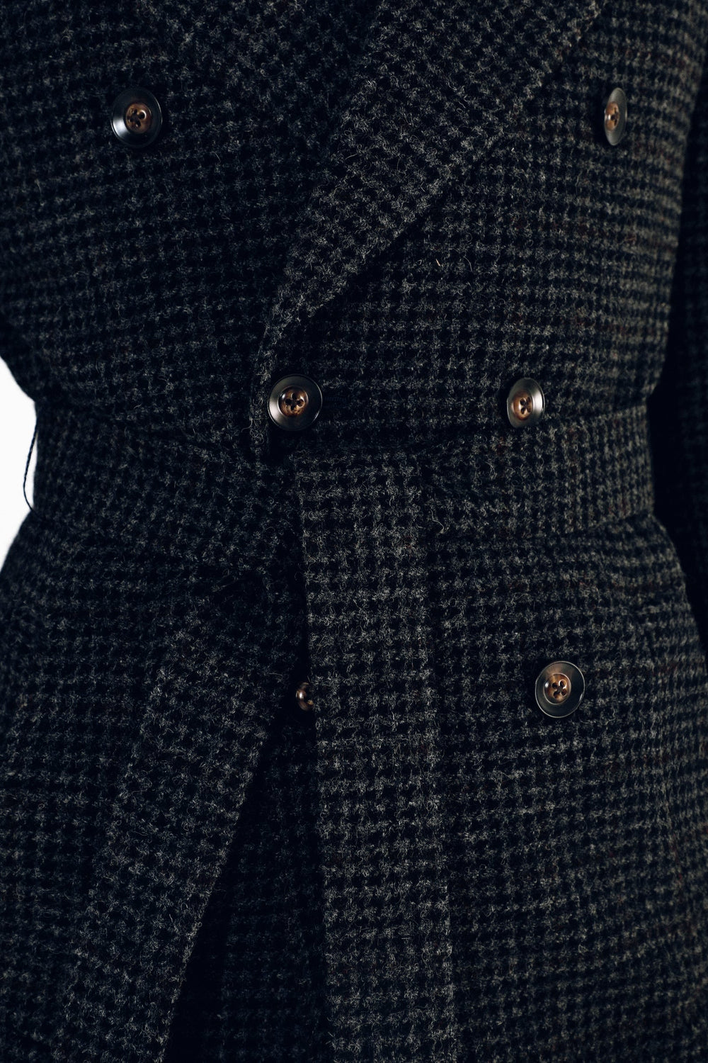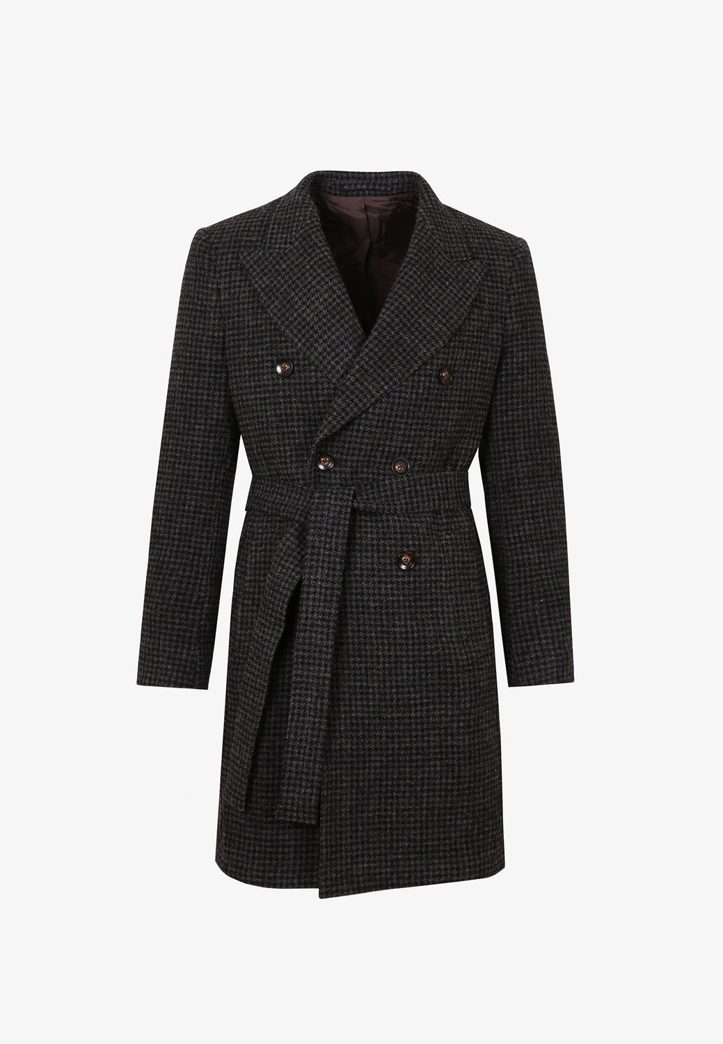 Abrigo de espiga confeccionado en tejido 100% lana. Corte Regular Fit, cuello con solapa de muesca y cierre con botonadura cruzada. Bolsillos laterales insertados y cinturón del mismo tejido.