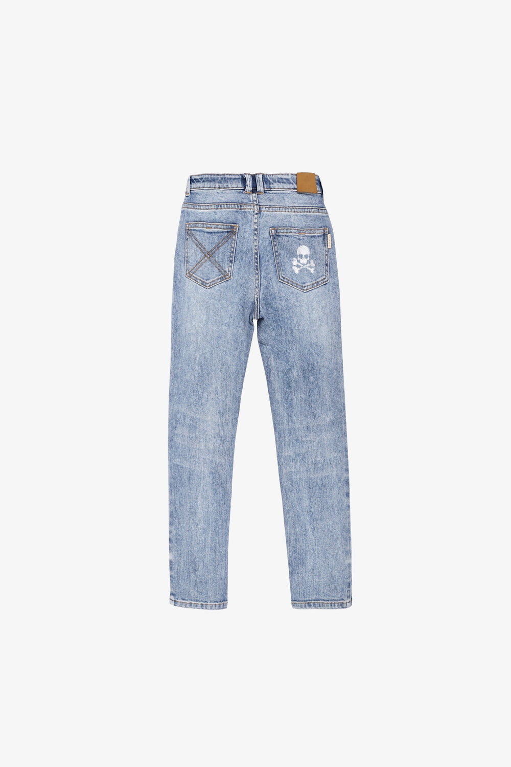 - Detalle de bordado de Scalpers delantero y calavera en print trasero.