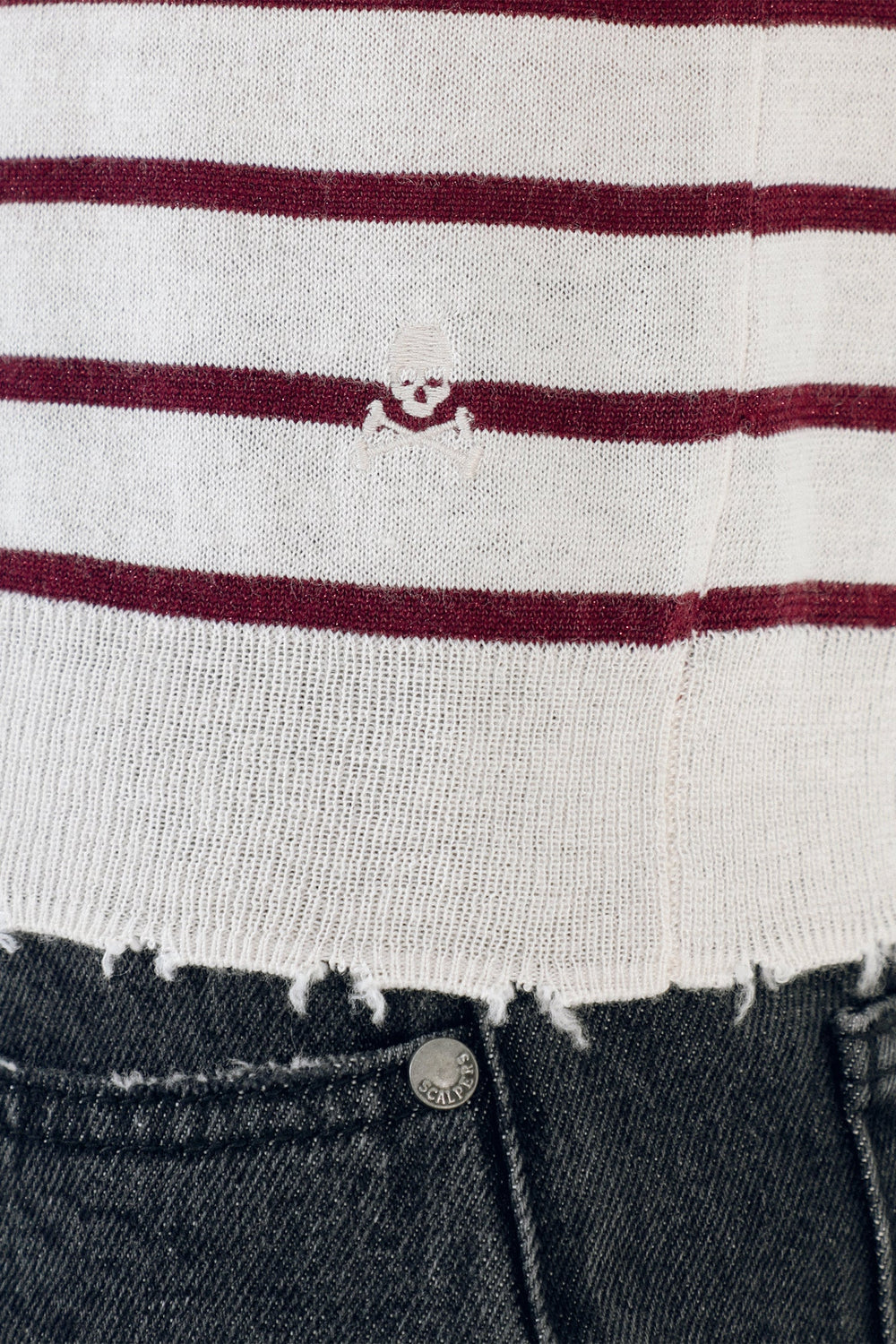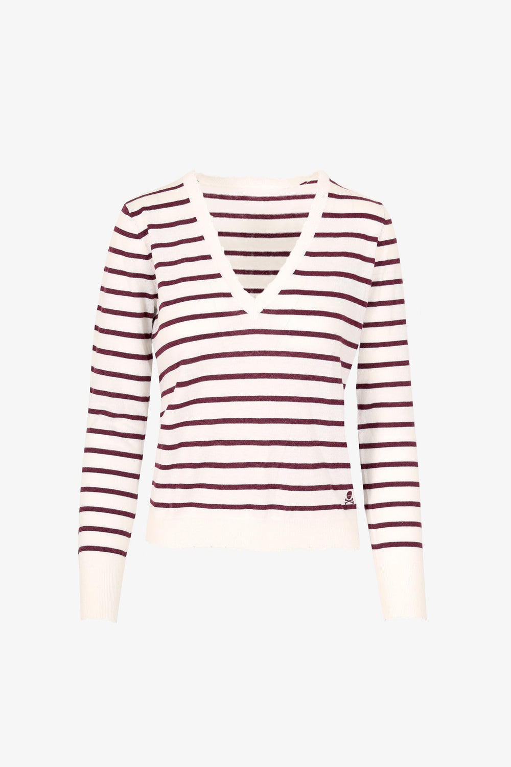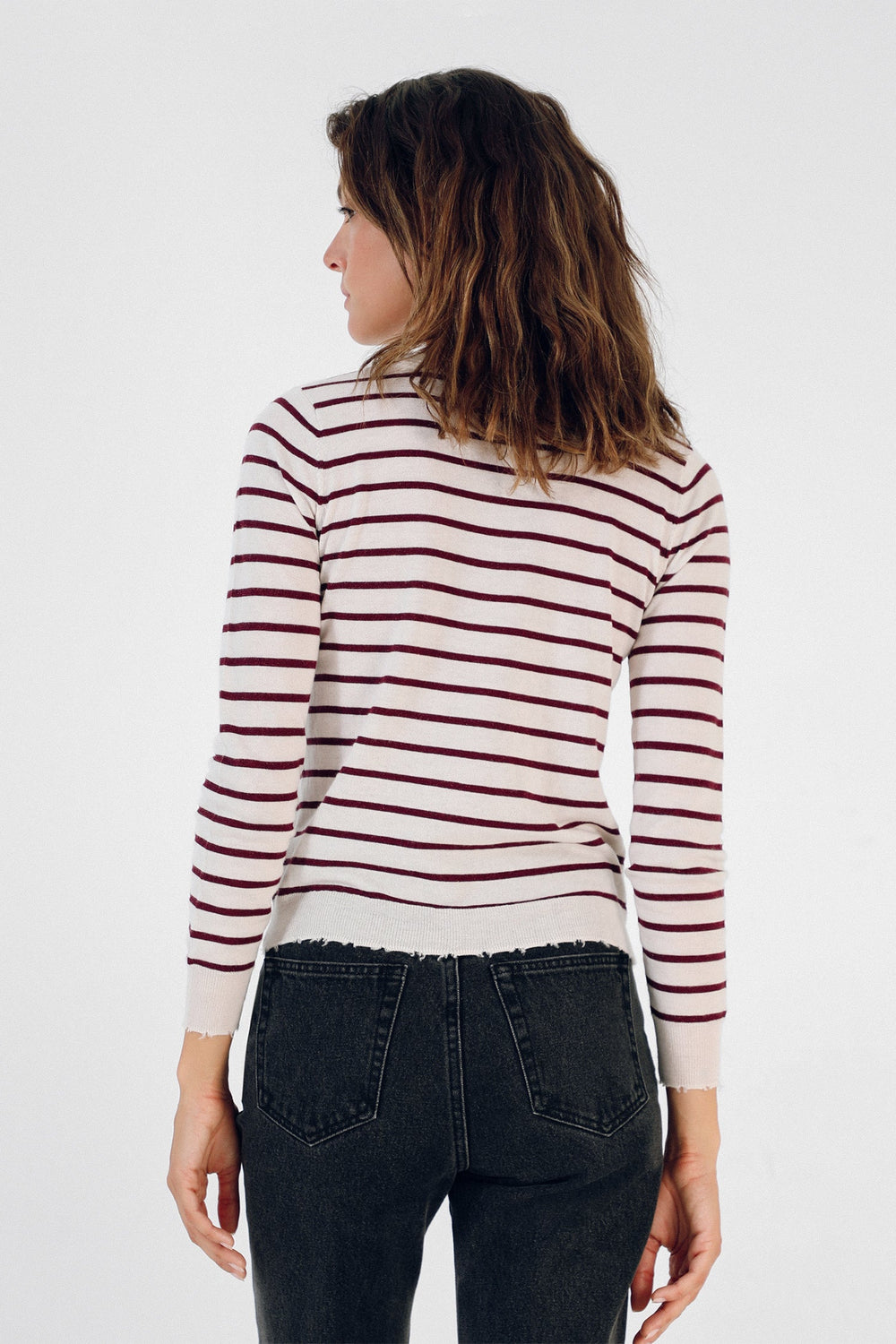 Jersey de rayas metalizadas confeccionado en tejido de lana. Corte Slim Fit, cuello de pico y manga larga terminada en puño.