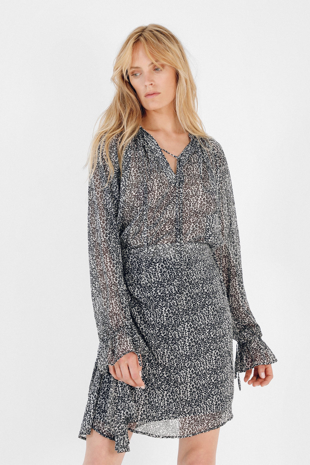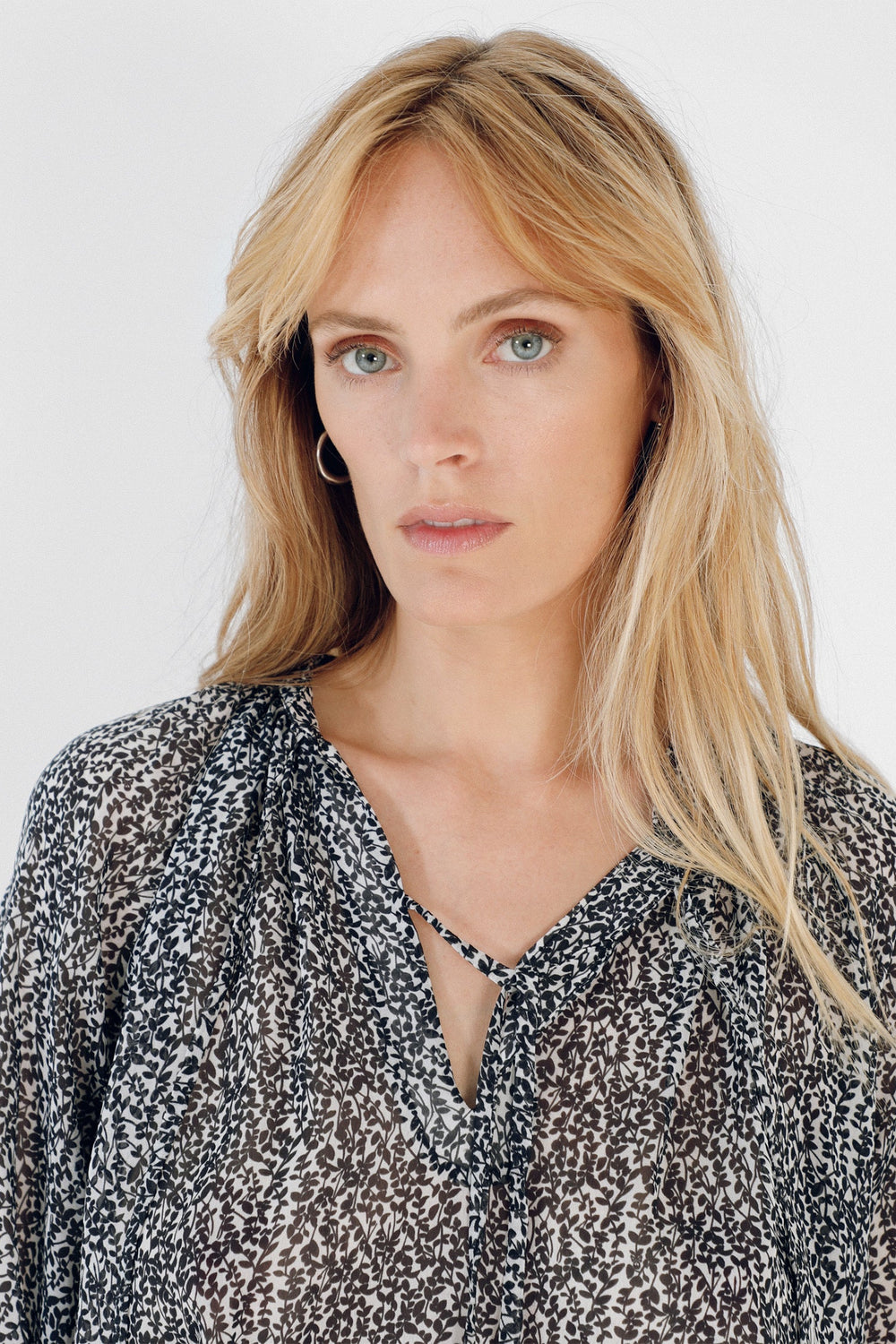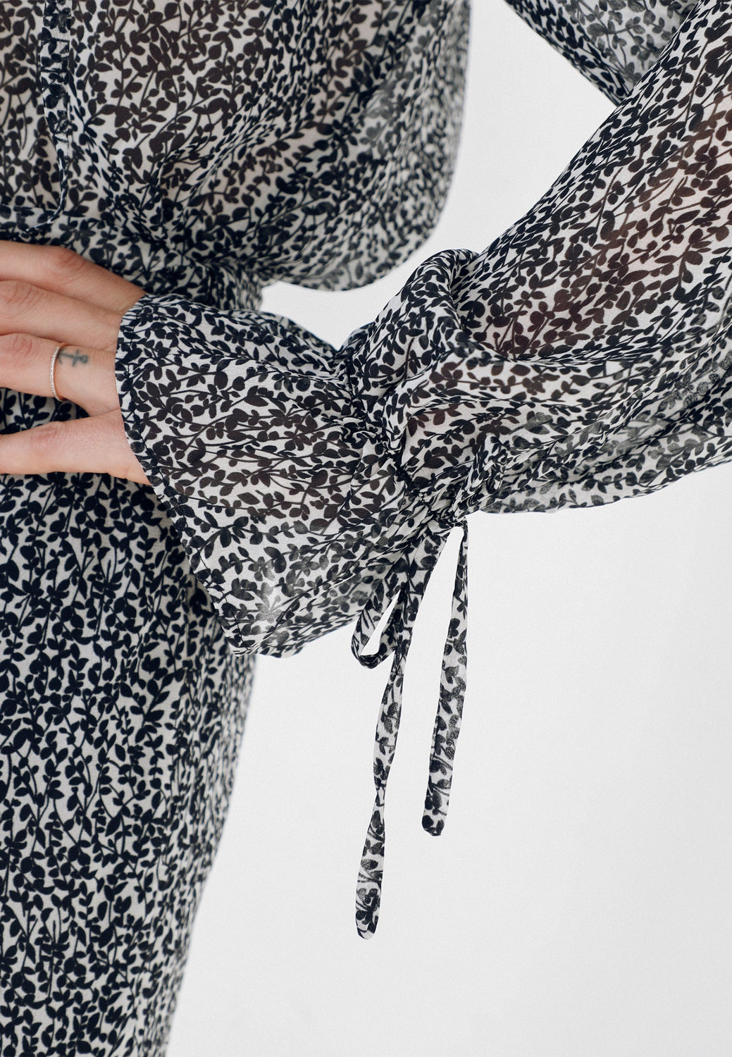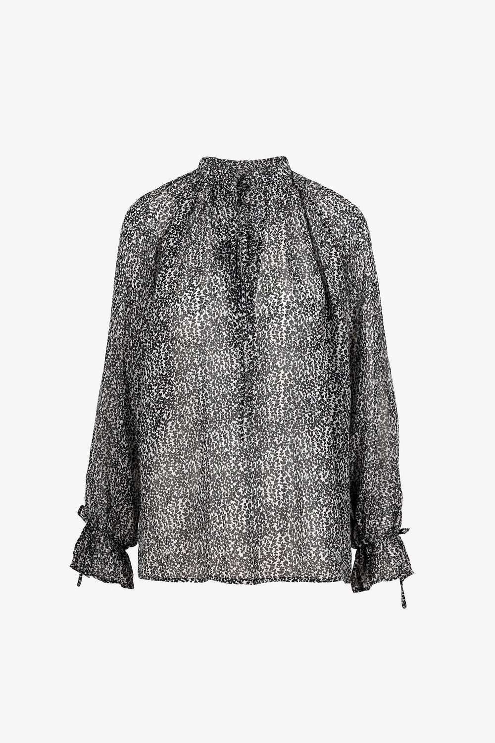 Camisa semitransparente con estampado de flores. Corte fluído oversize, cierre con lazada en el cuello y manga larga. Detalle de frunce en el puño con lazo.