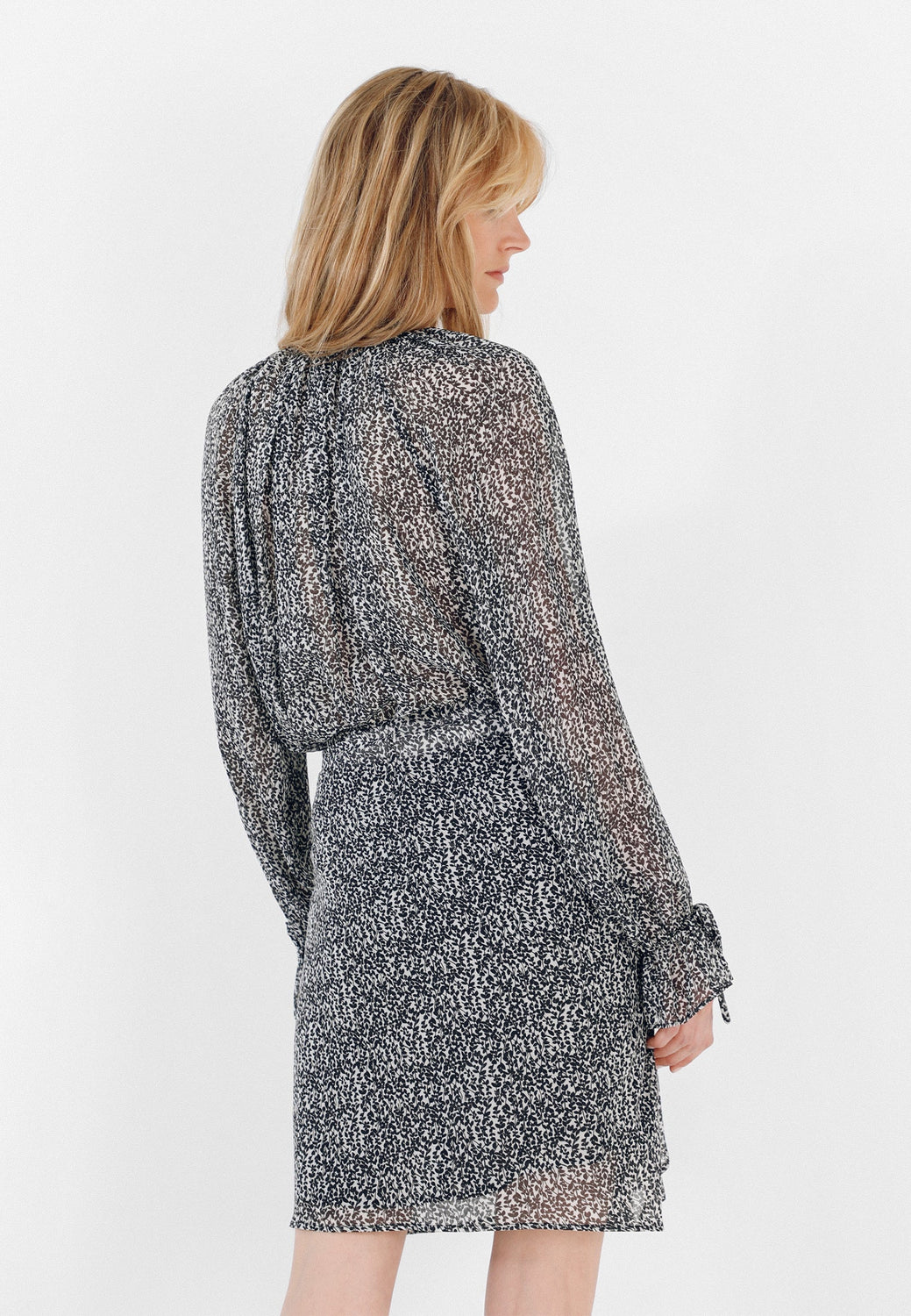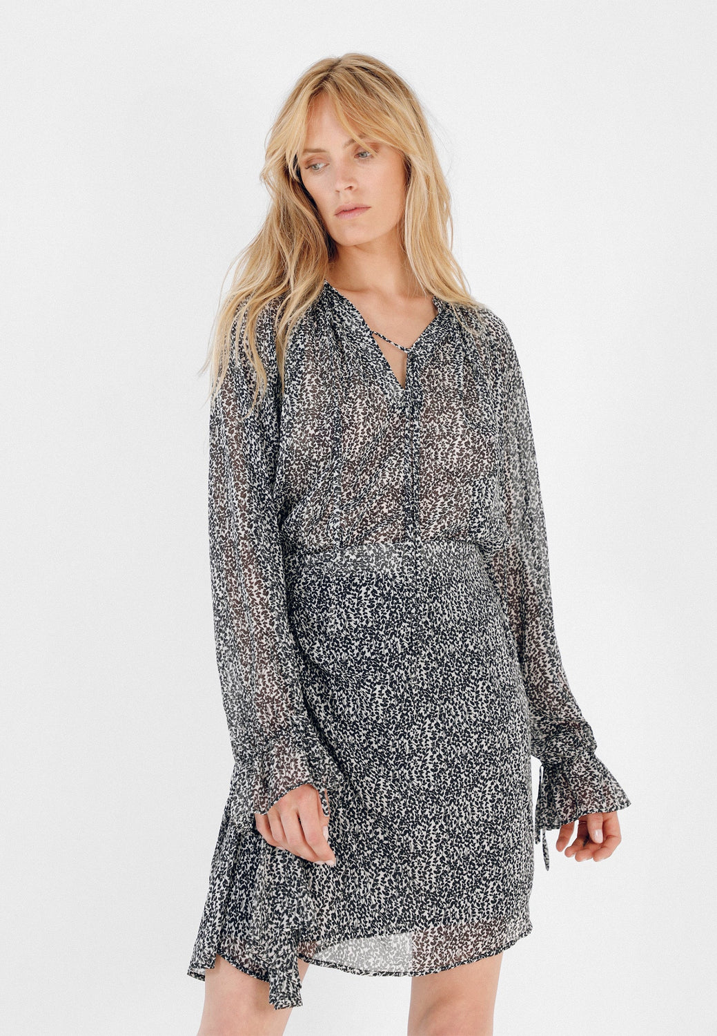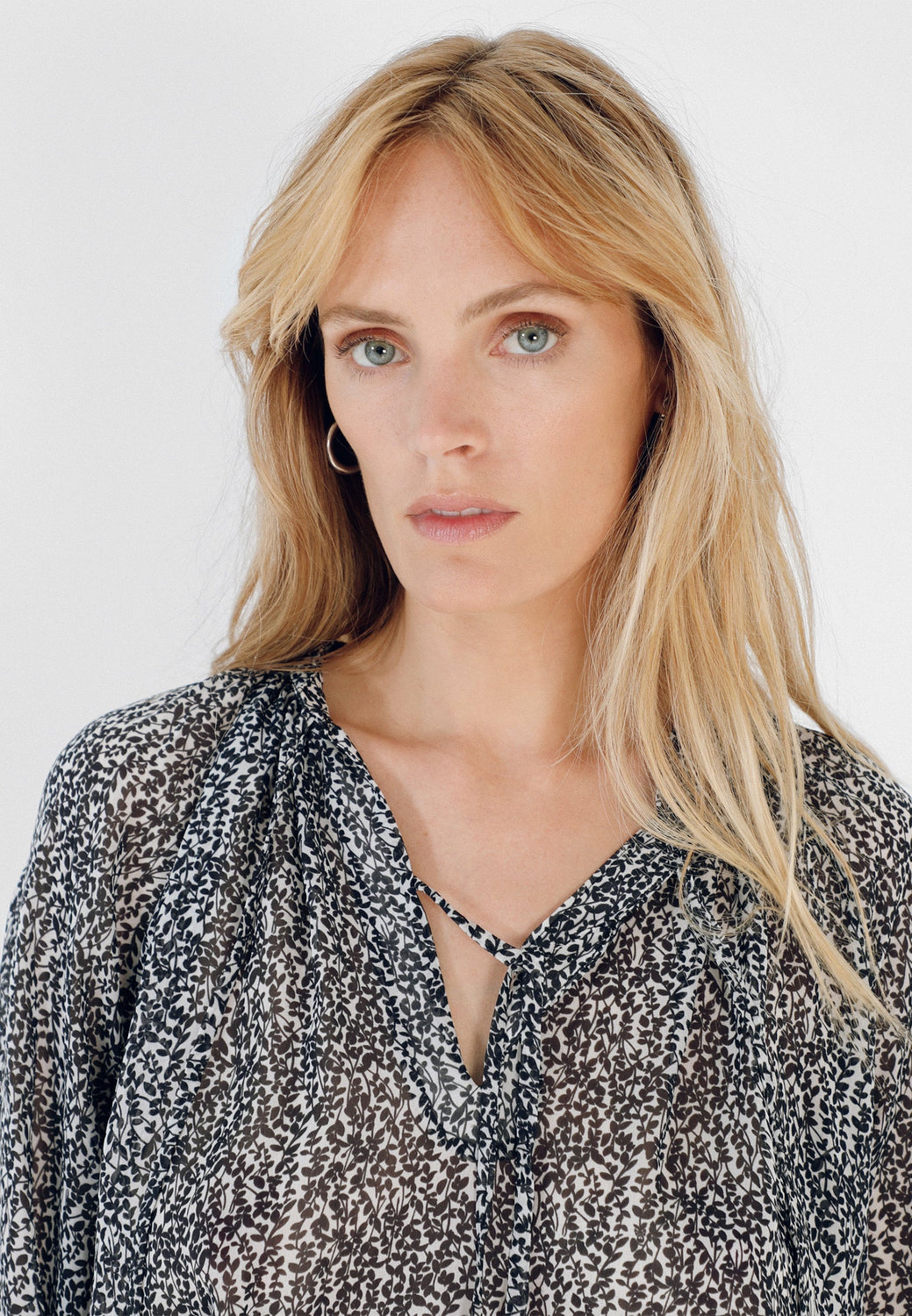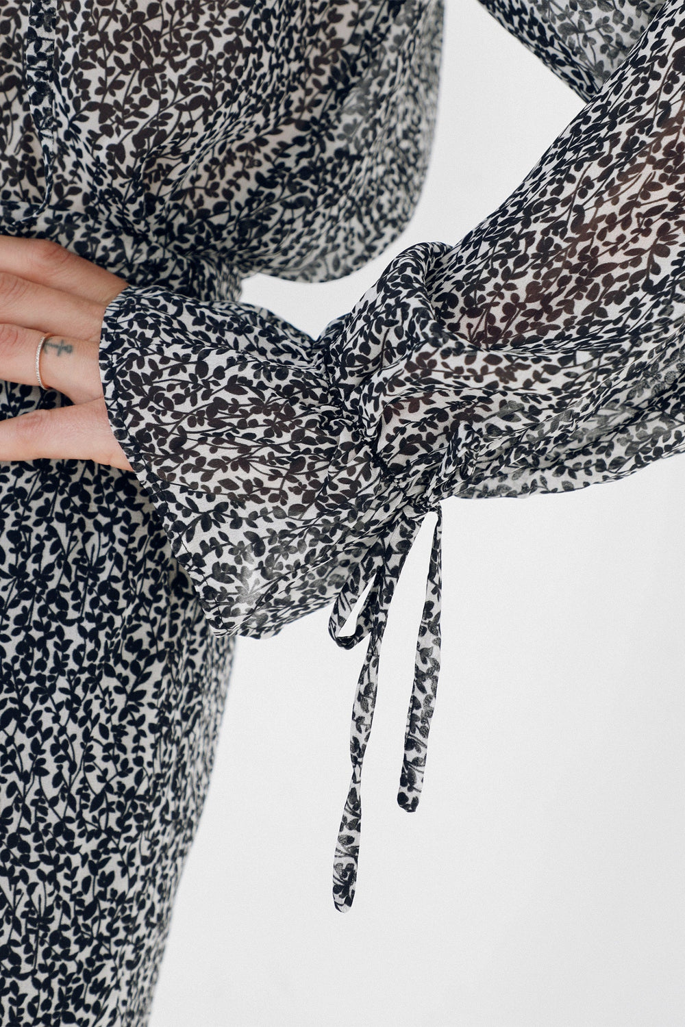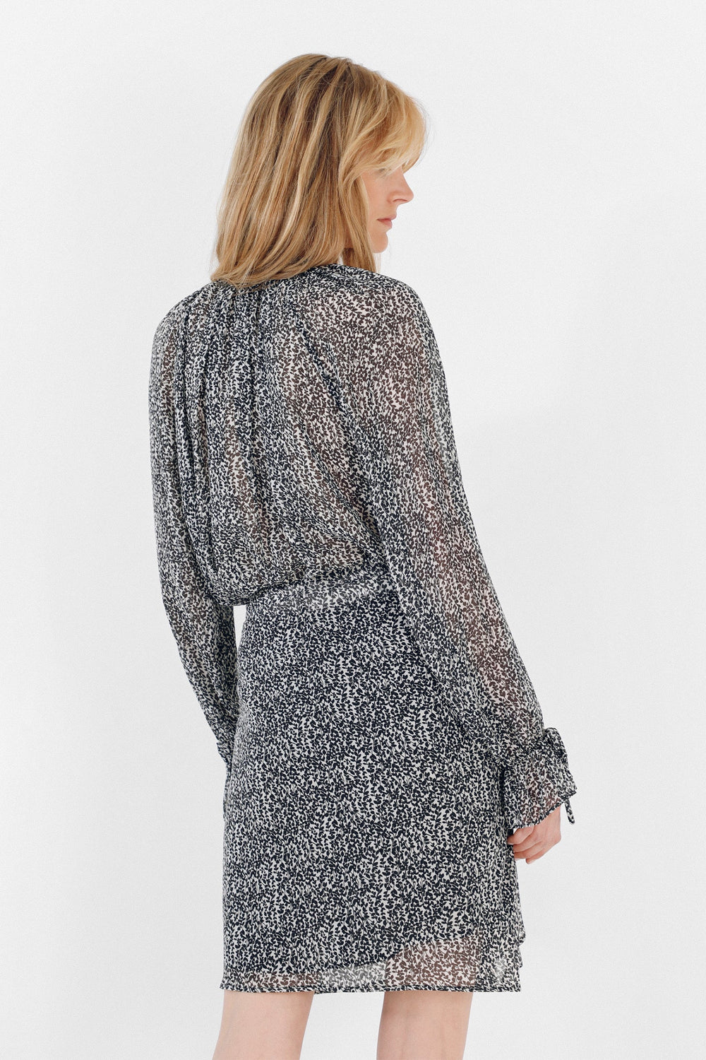 Camisa semitransparente con estampado de flores. Corte fluído oversize, cierre con lazada en el cuello y manga larga. Detalle de frunce en el puño con lazo.