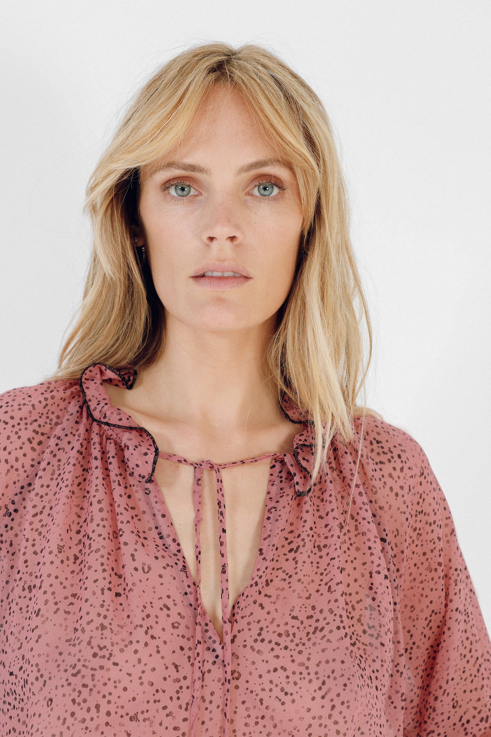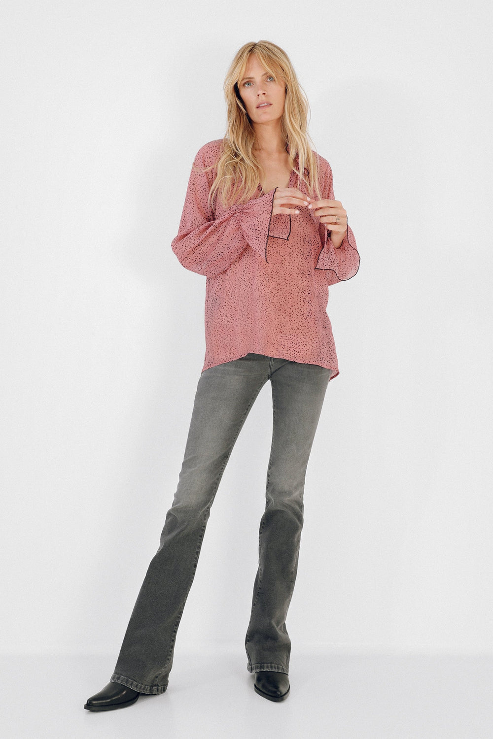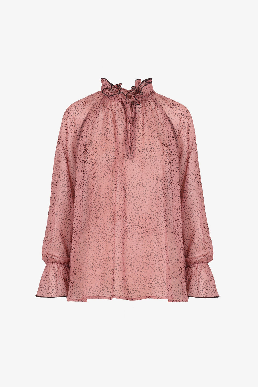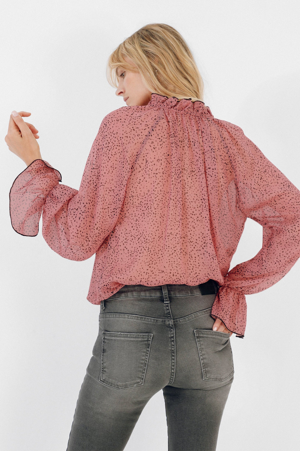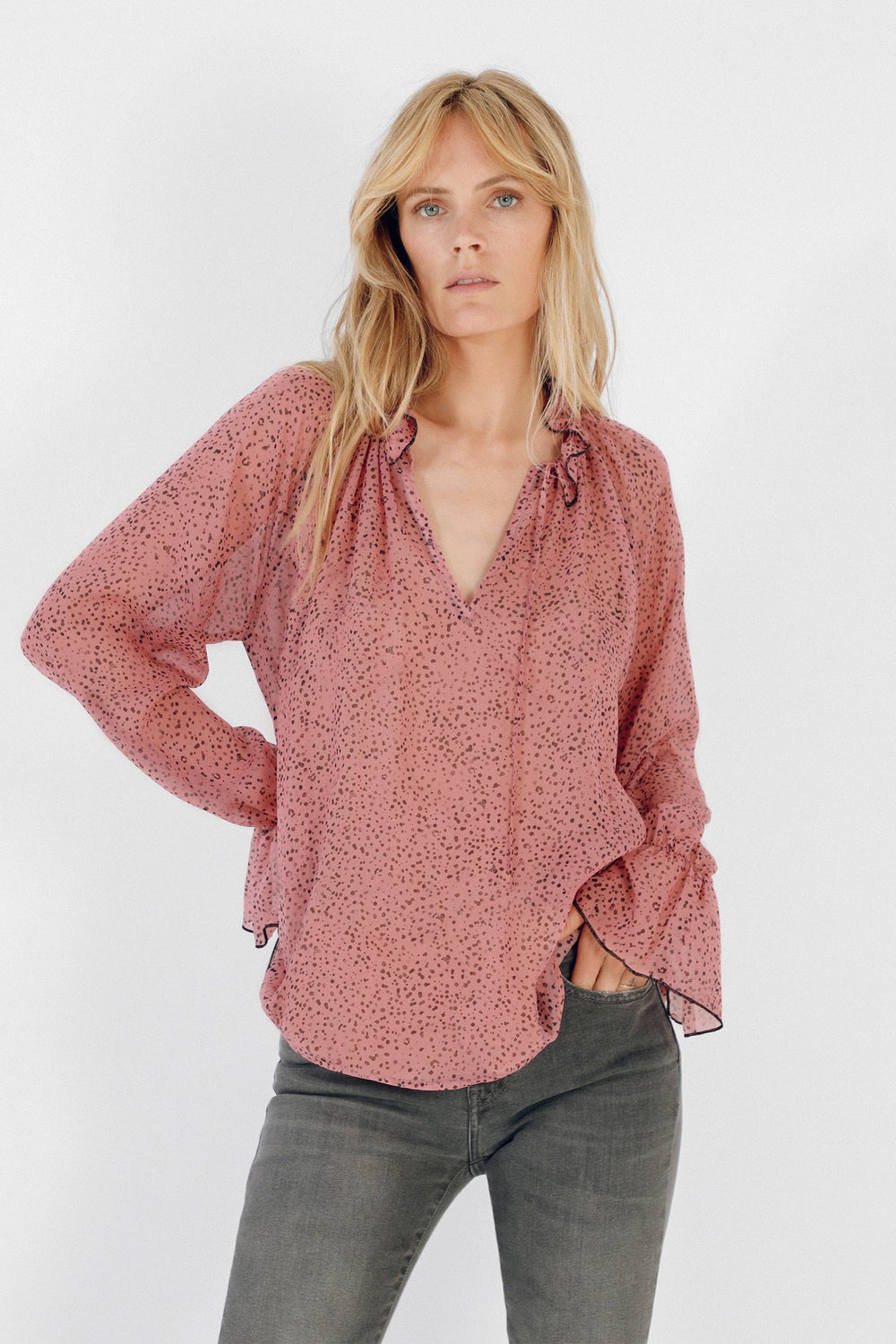 Blusa semitransparente con estampado de estrellas. Corte ligeramente oversize, cuello con escote de pico y cierre con lazada. Manga larga abullonada terminada en frunce. Detalle de frunce en el escote y de pipping en el borde.