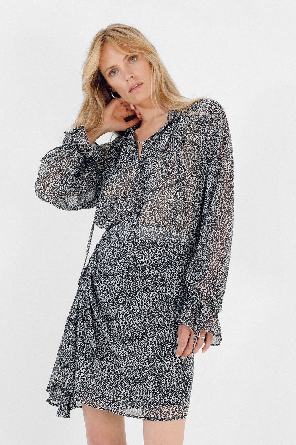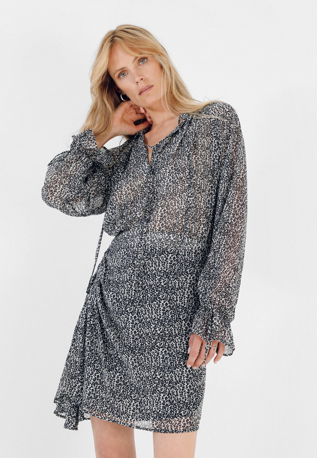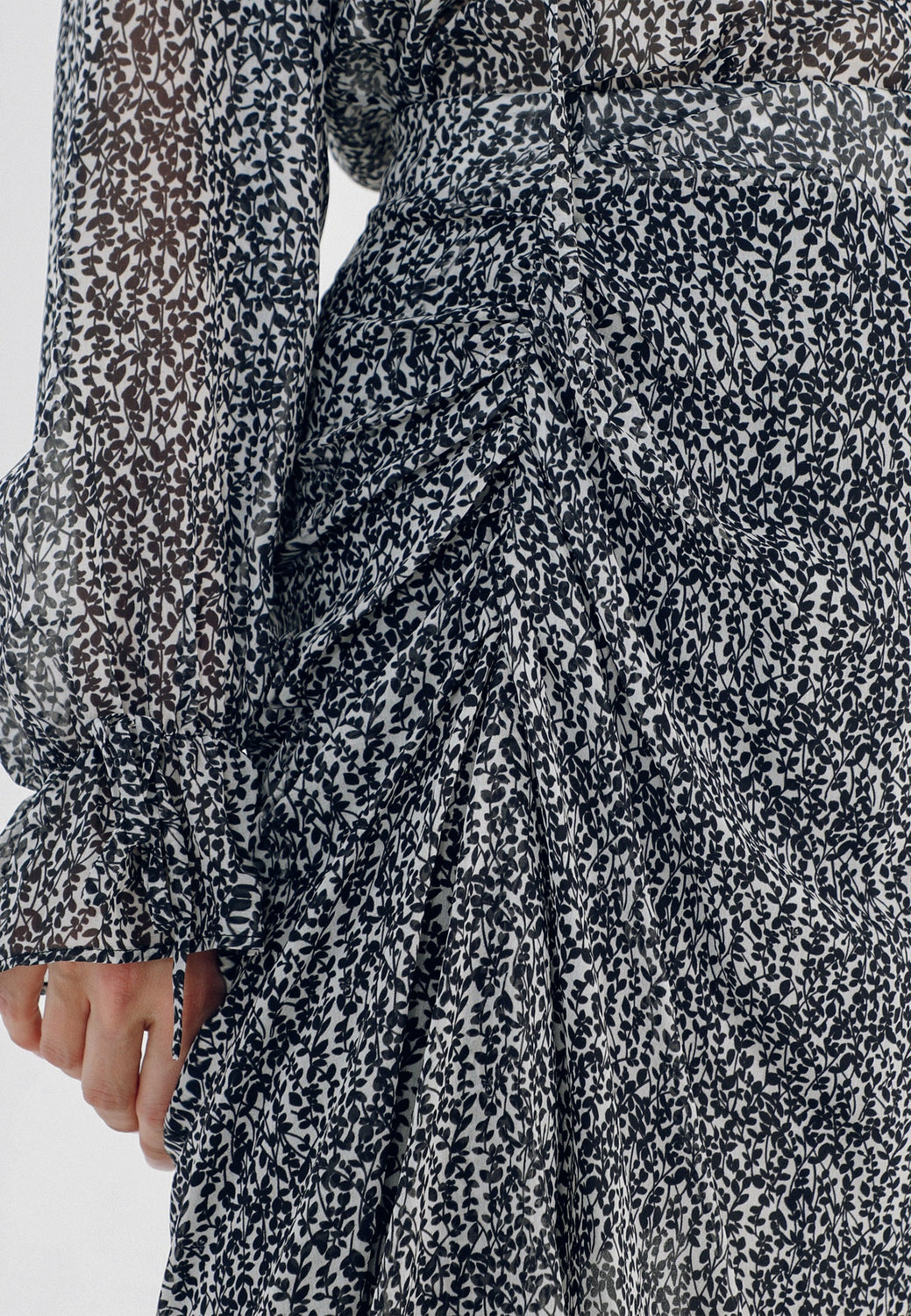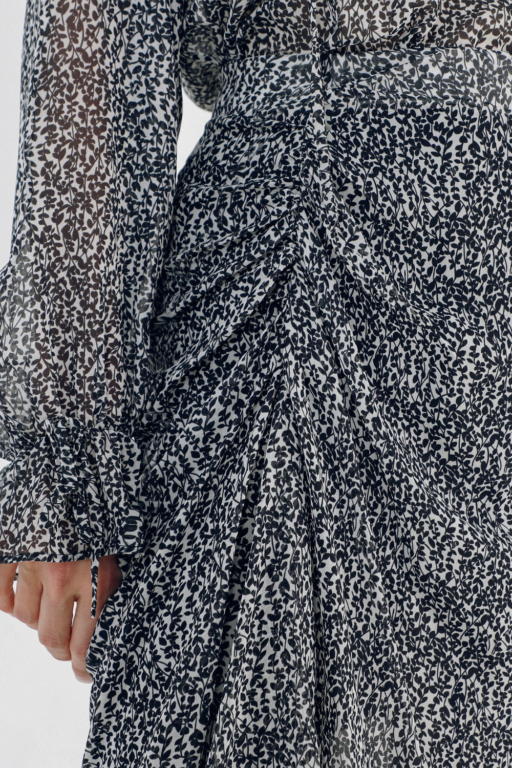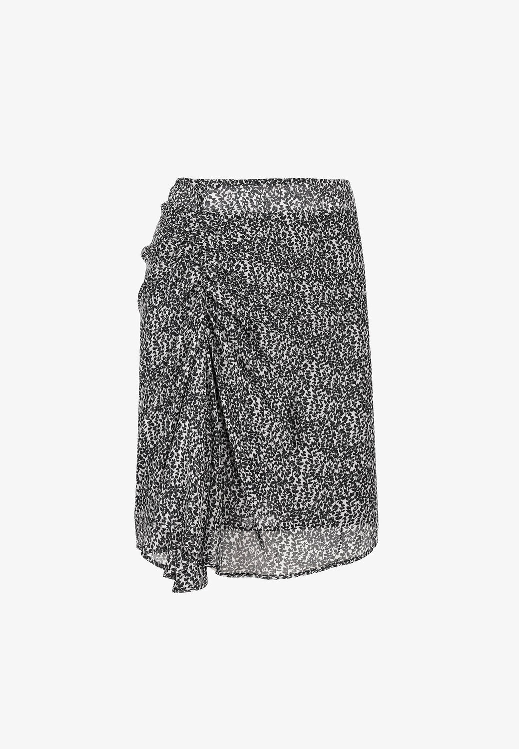 Falda mini con estampado de flores. Corte Slim Fit, cierre con cremallera y detalle de frunce lateral con lazada. Bajo asimétrico.