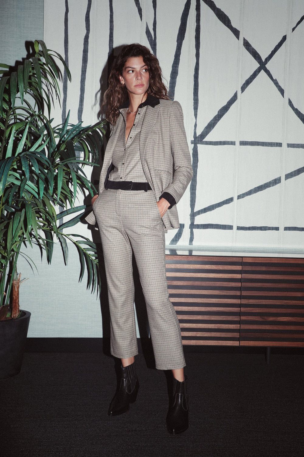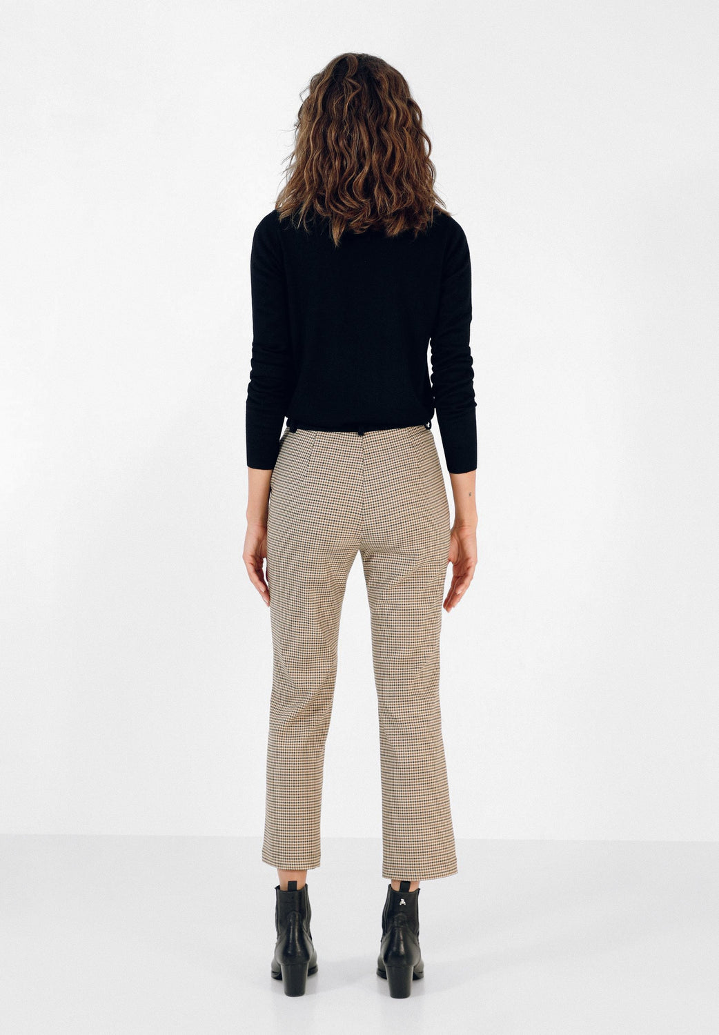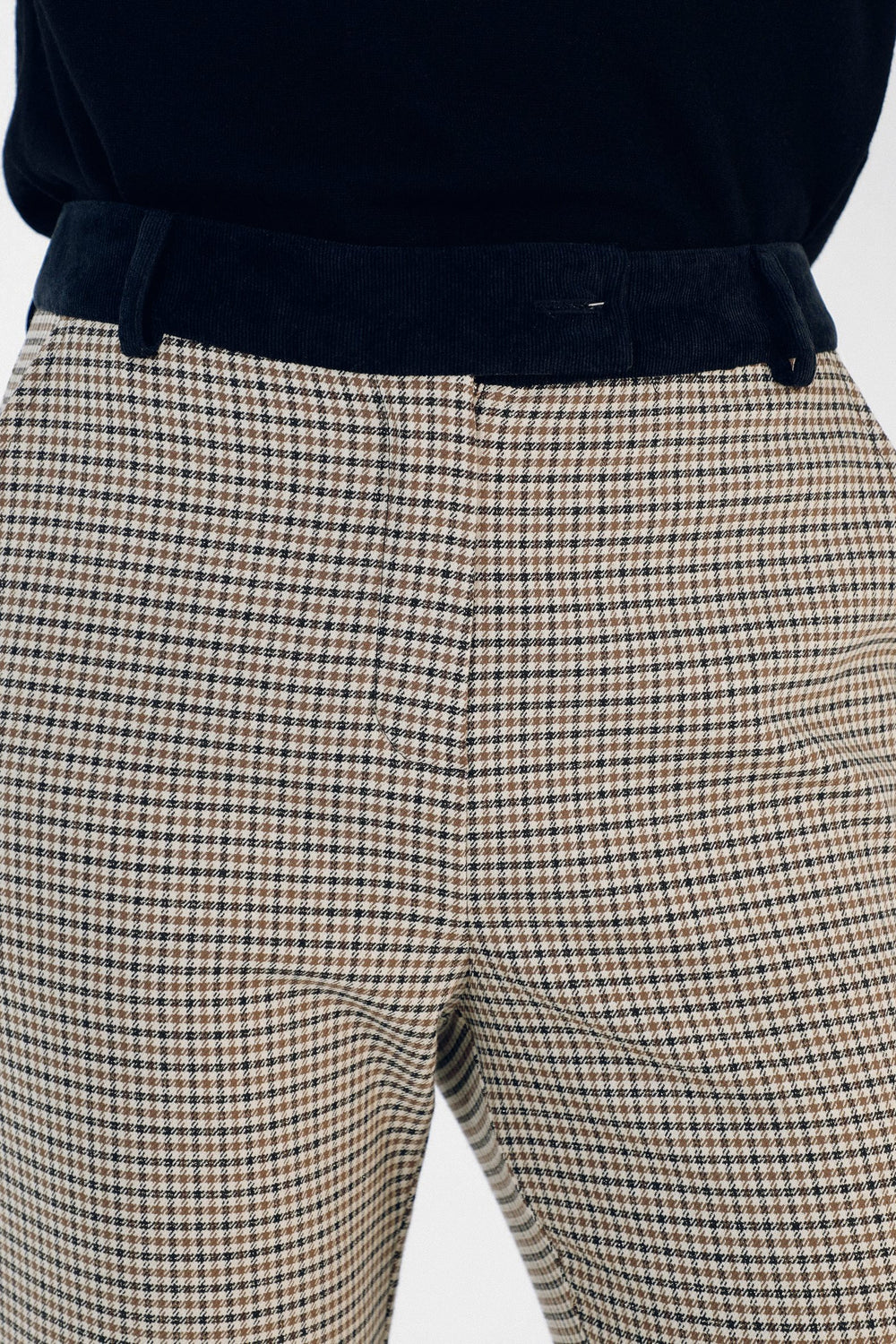Pantalón con estampado pata de gallo. Corte flare, cierre con cinturilla prolongada con corchete y cremallera y trabillas. Detalle de cinturilla a contraste en pana.