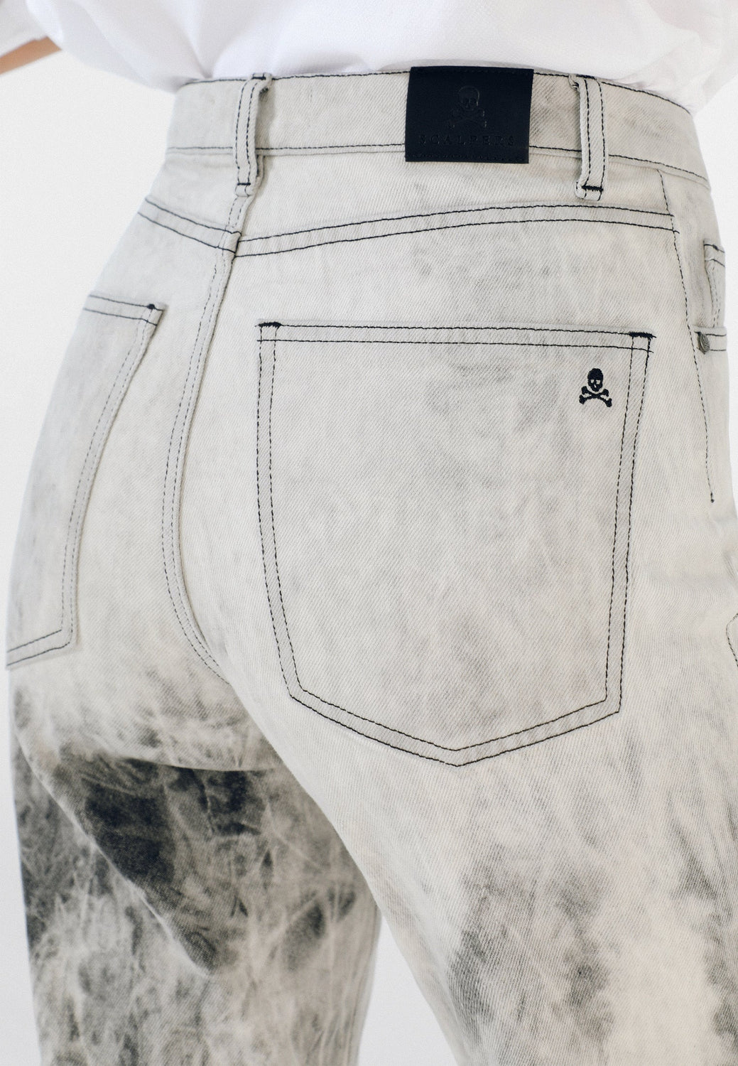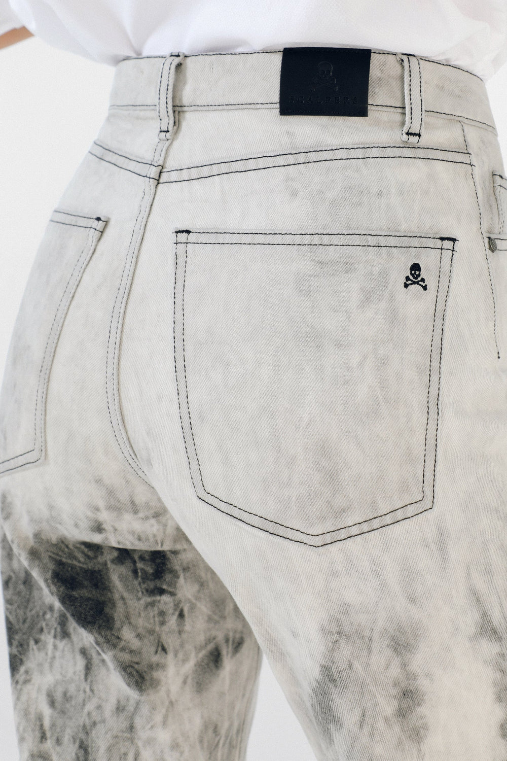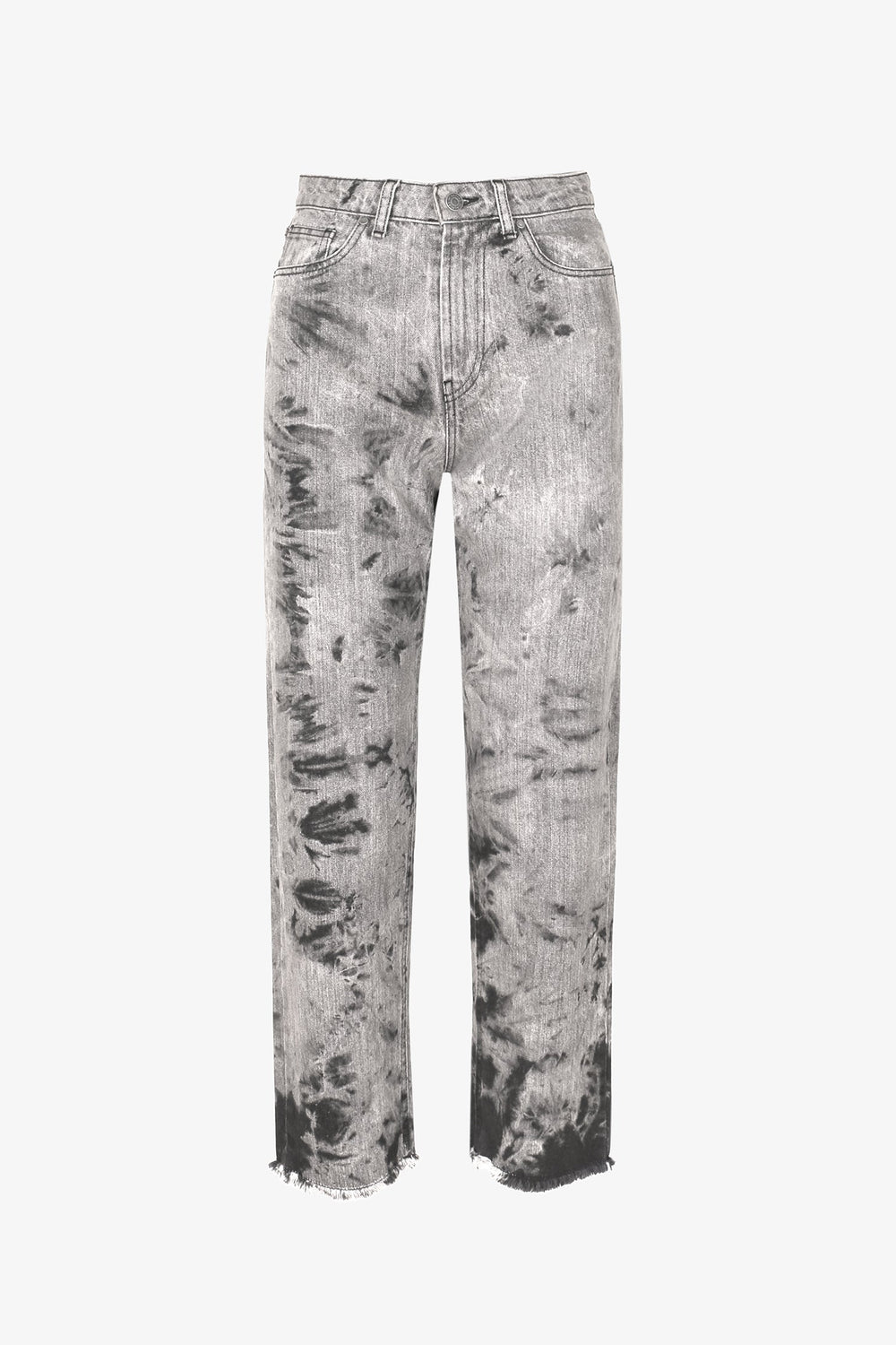 Jeans con estampado tie dye. Corte Mom Fit con tiro alto, cierre con botón y cremallera y bolsillos laterales y traseros. Detalle de etiqueta trasera.