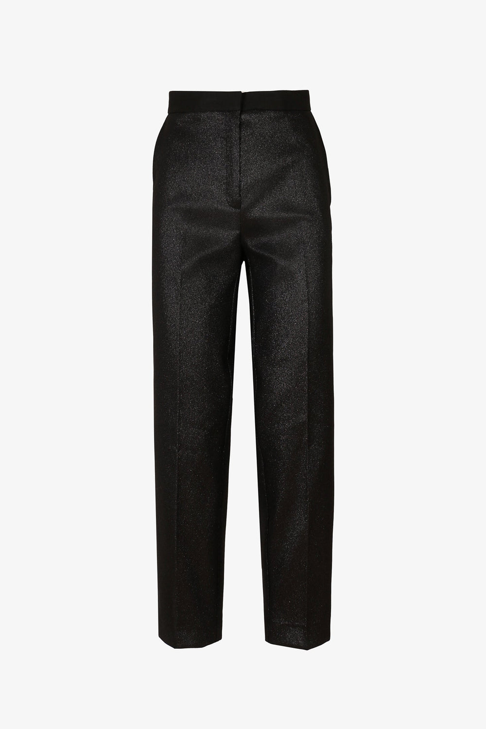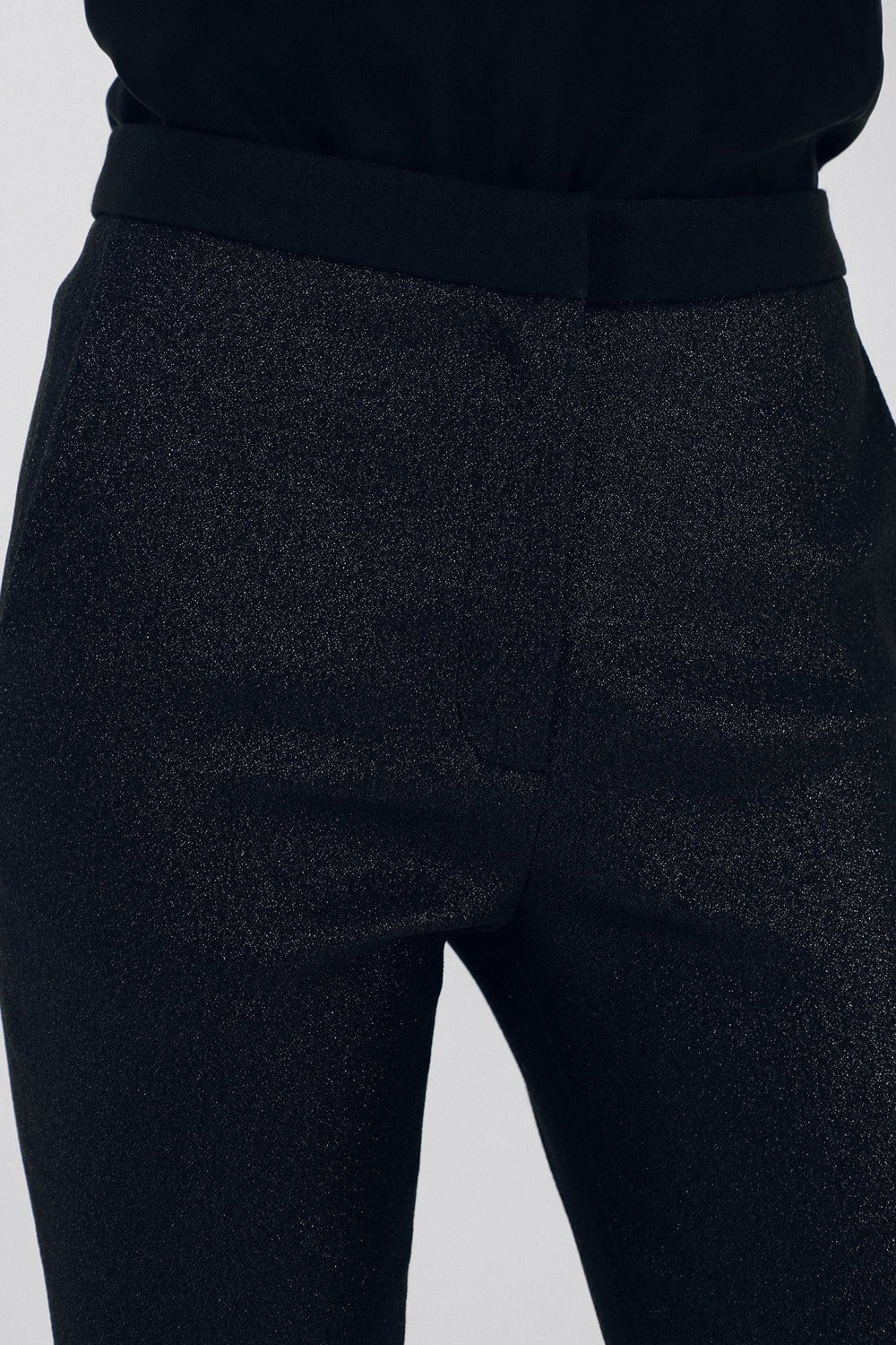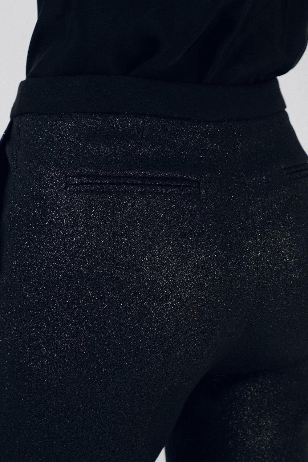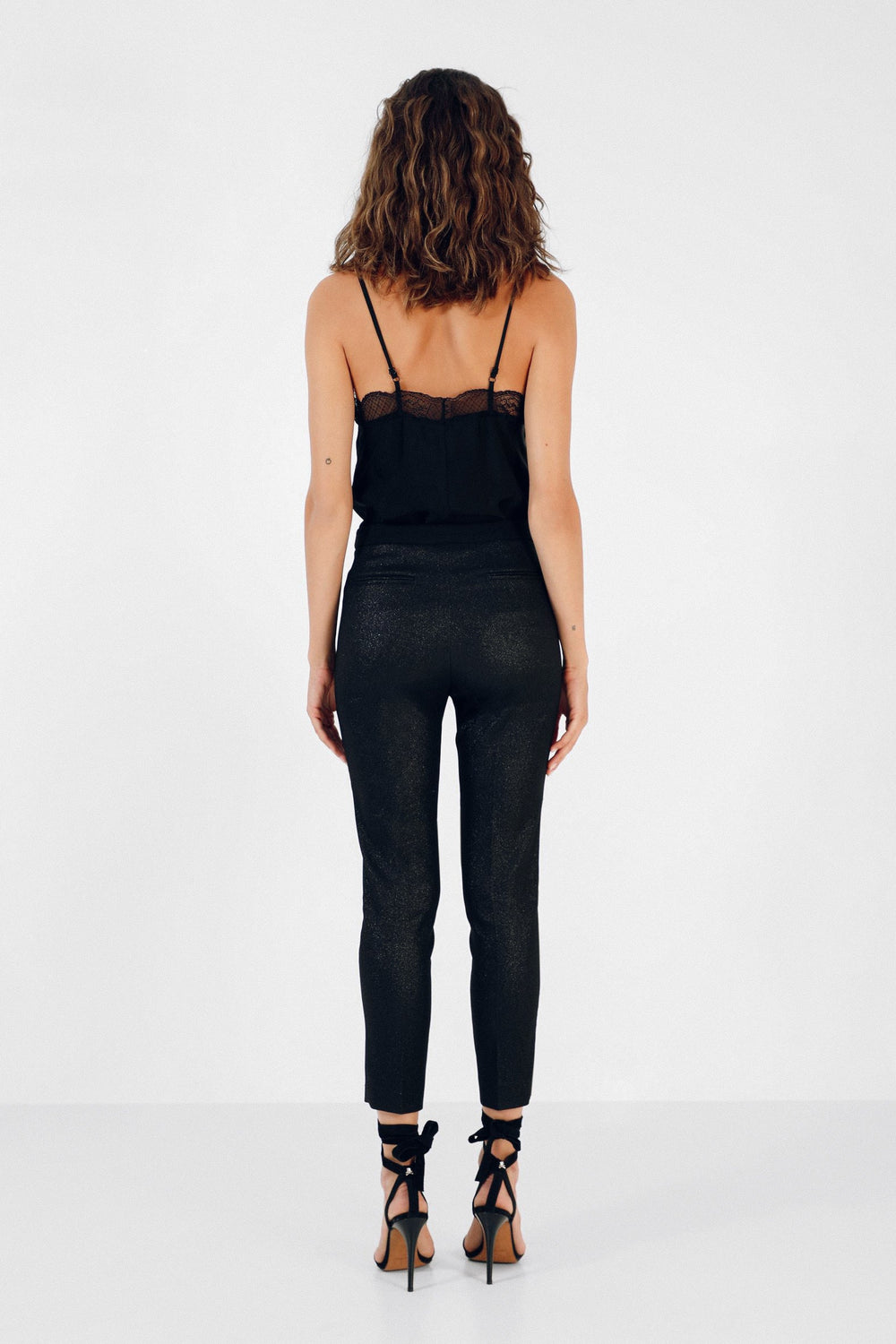 Pantalón confeccionado en tejido con brillo. Corte Slim Fit, cierre con corchete y bolsillos traseros insertados.