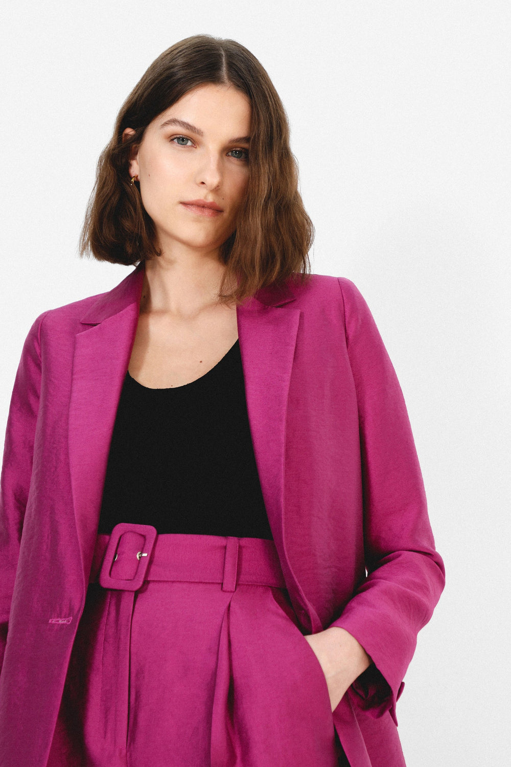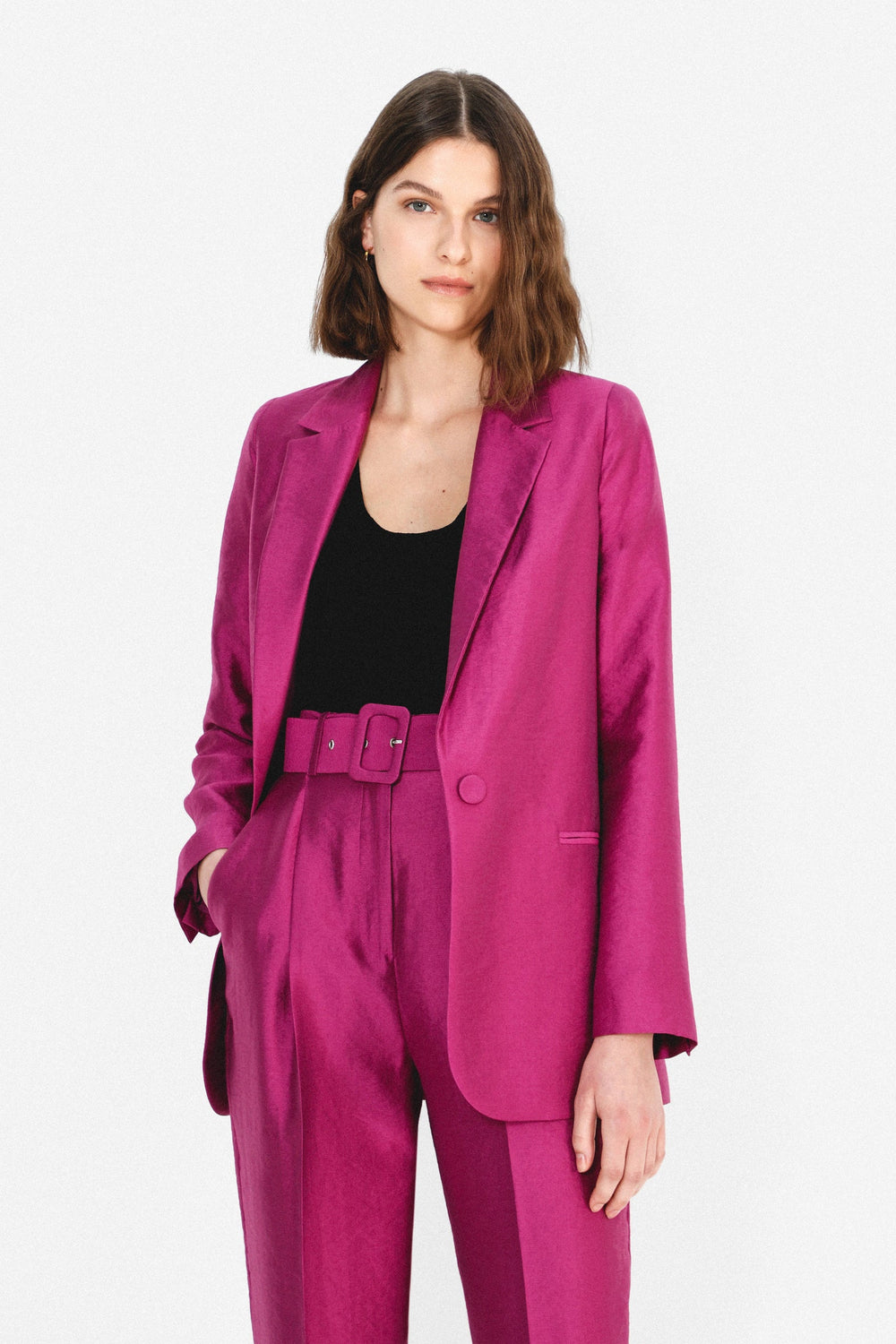 Blazer confeccionada en tejido satinado. Corte Regular Fit, cuello con solapas y cierre con botón. Manga larga y bolsillos insertados. Tiene forro.