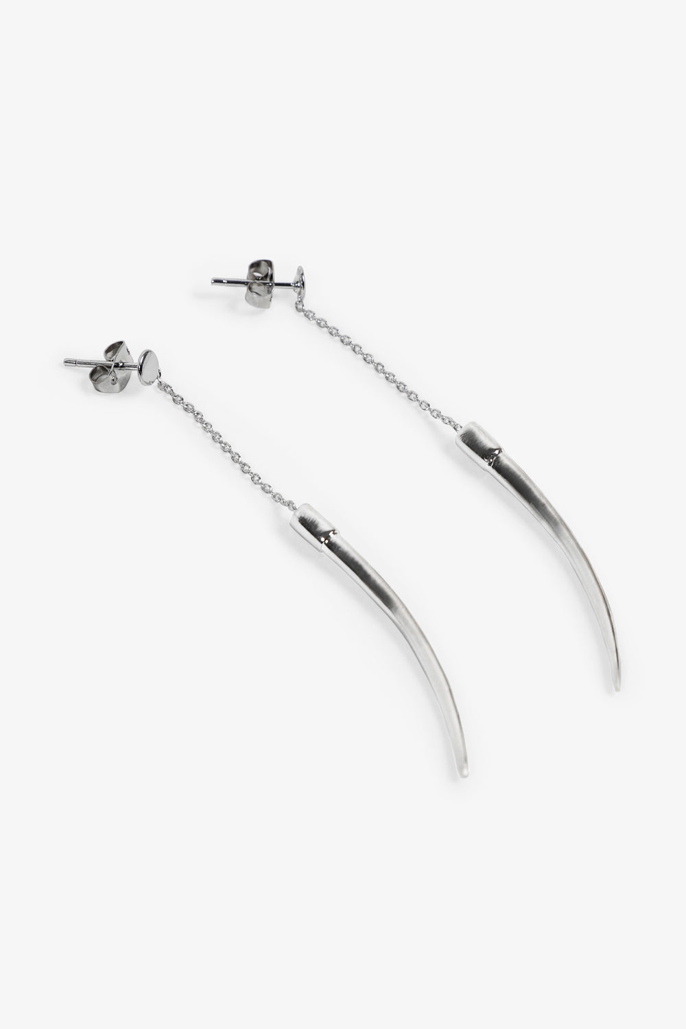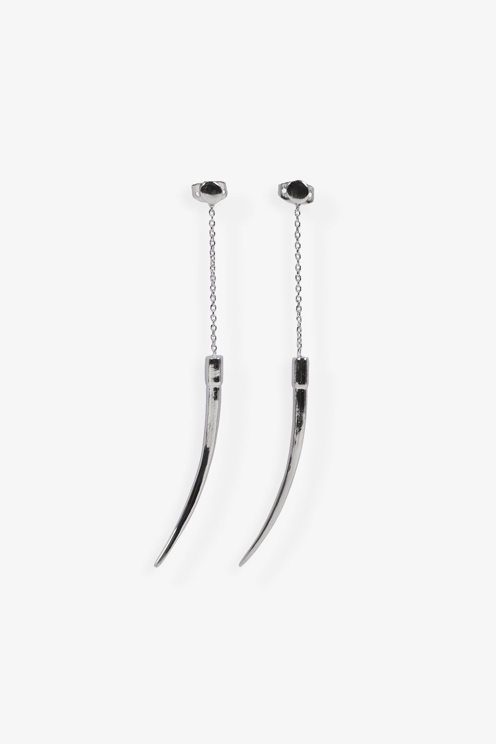 Long earrings with chain finishing in a horn shape in silver plated brass. Push-back fastening. The size is 7cm.