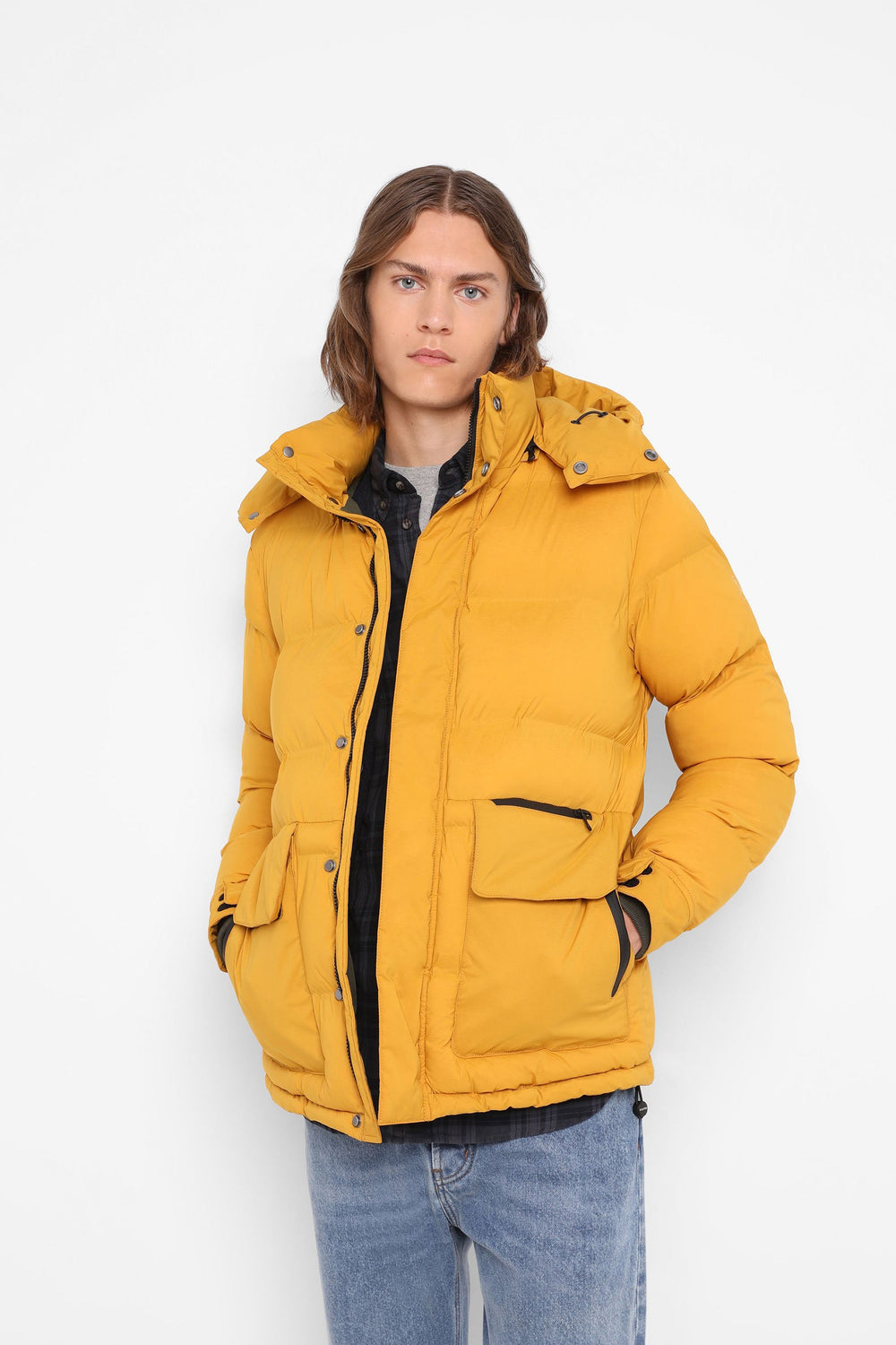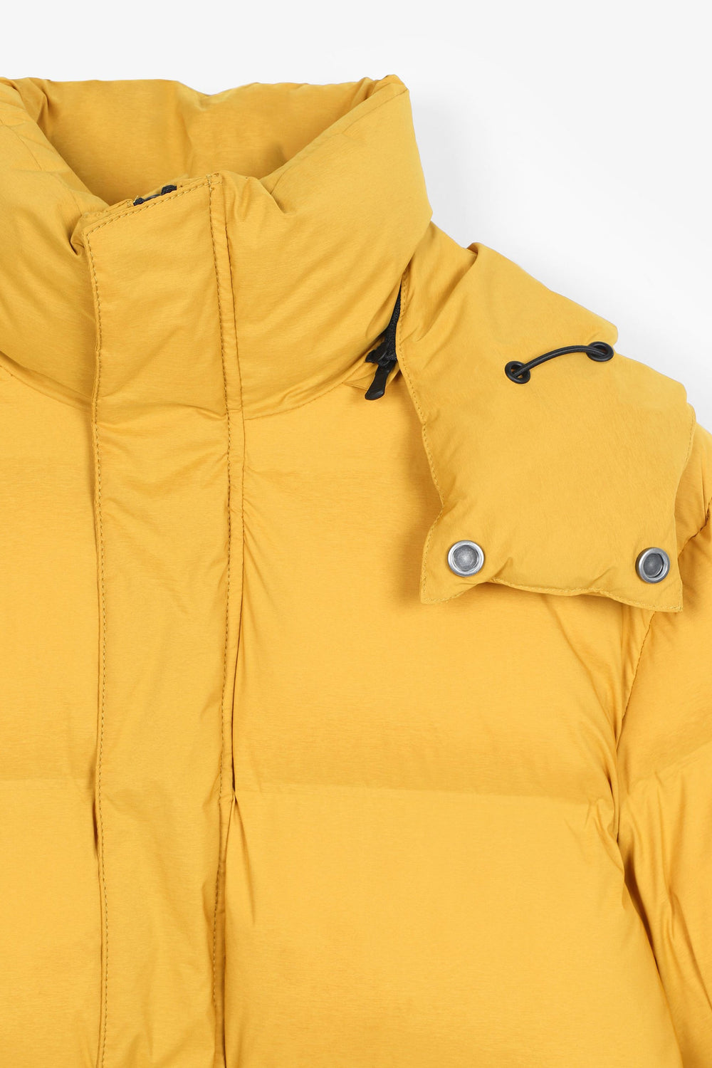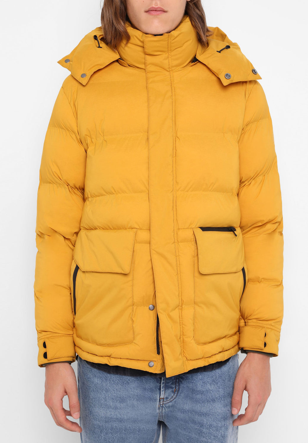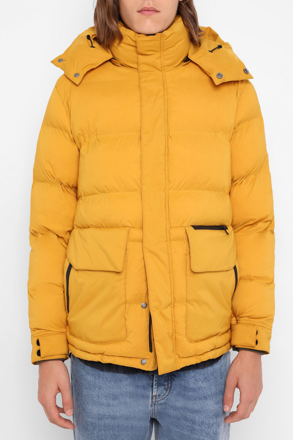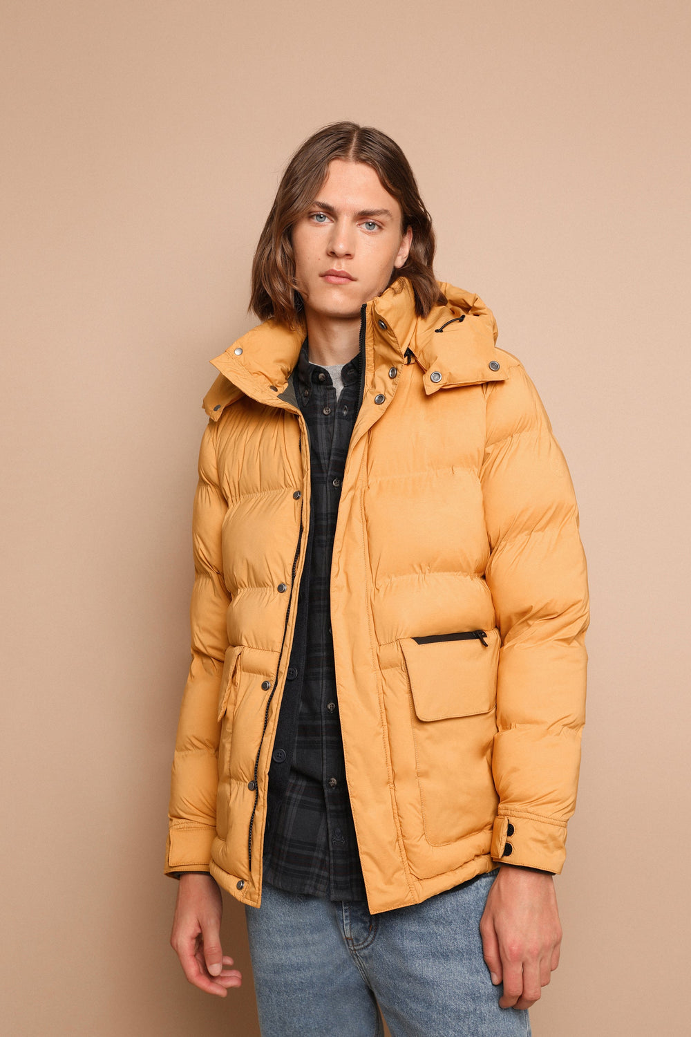 Polyester filling puffer coat. Regular fit, collar with detachable adjustable hood with snap-button fastening and double slider zip fastening. Long sleeves with velcro and heat-sealed pockets.