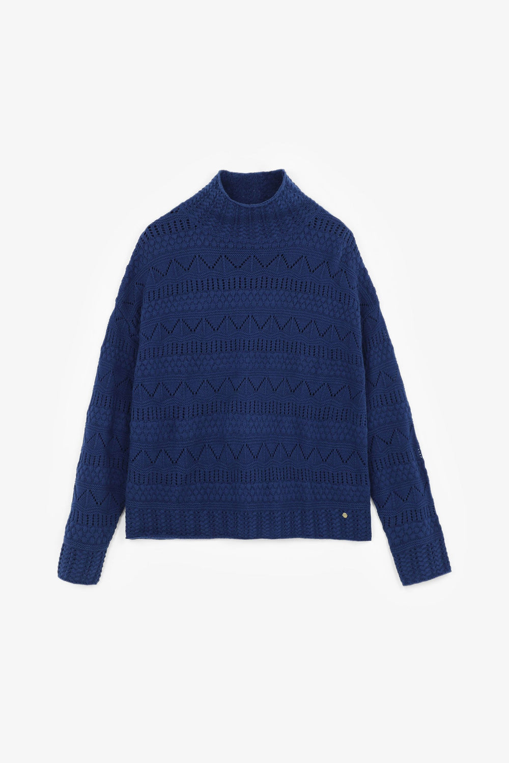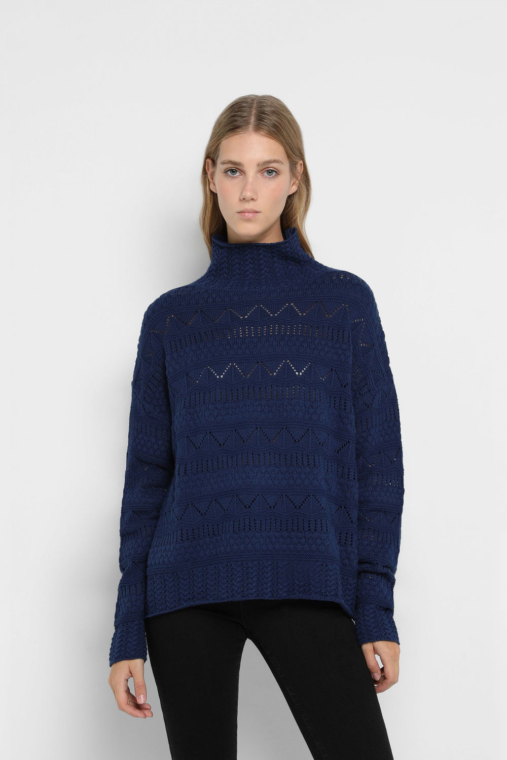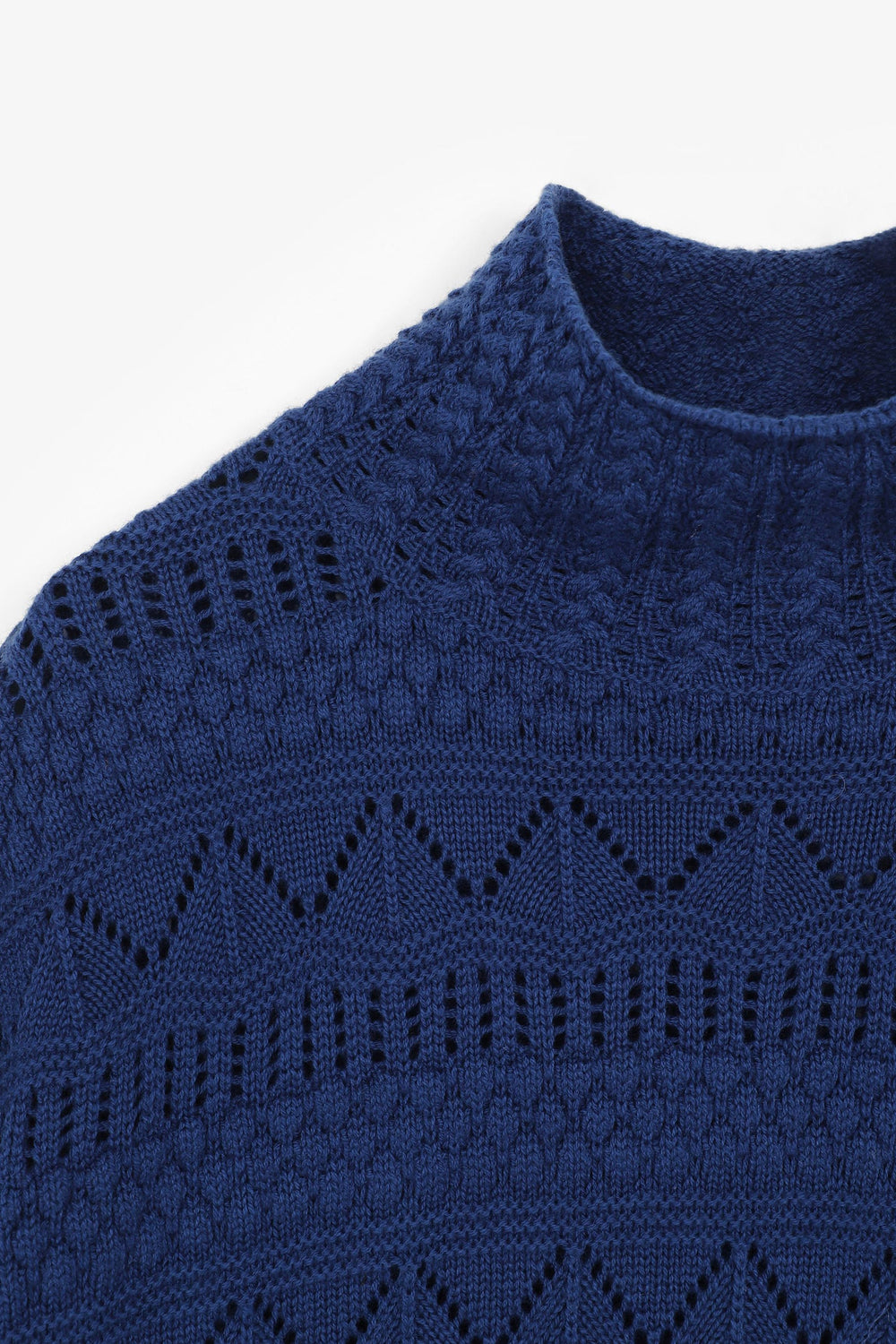 Cotton and wool blend sweater with die-cut detail. Slightly oversize fit, high collar and long sleeves.
