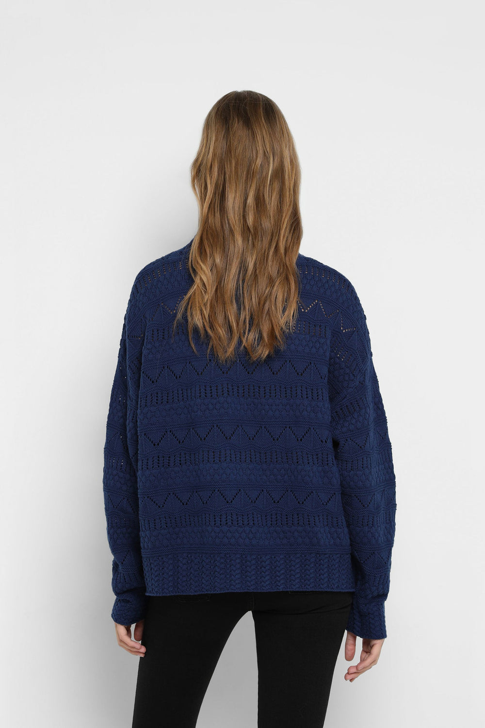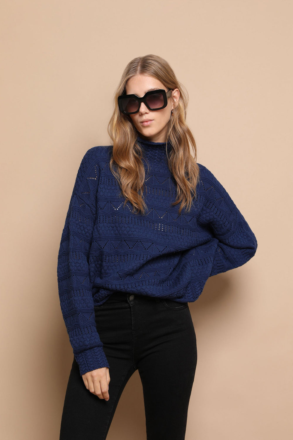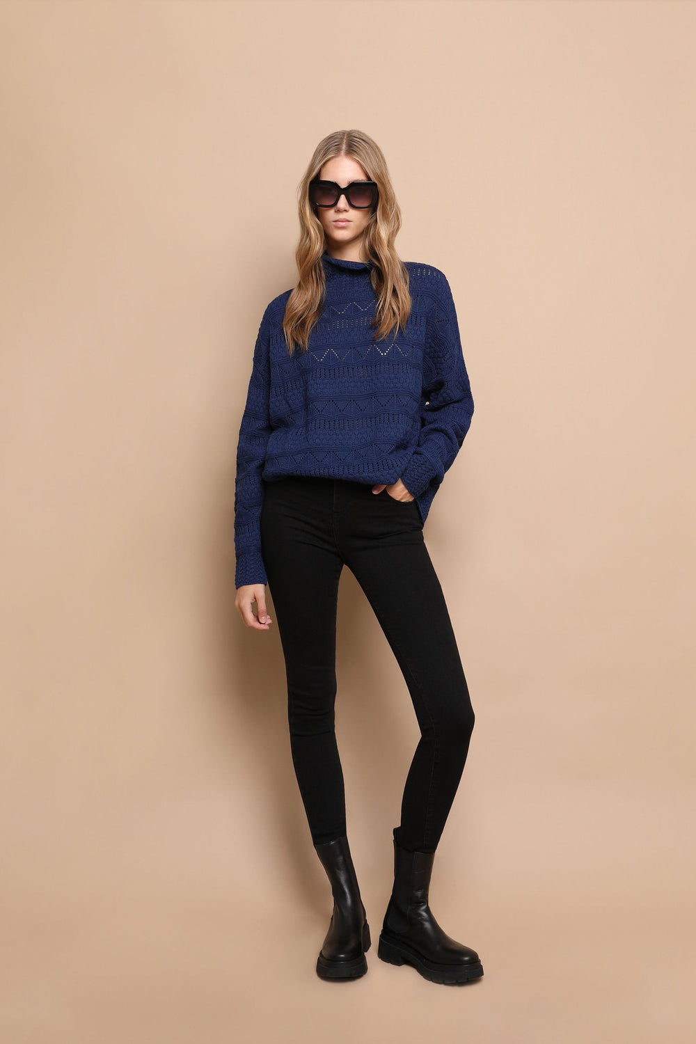 Cotton and wool blend sweater with die-cut detail. Slightly oversize fit, high collar and long sleeves.