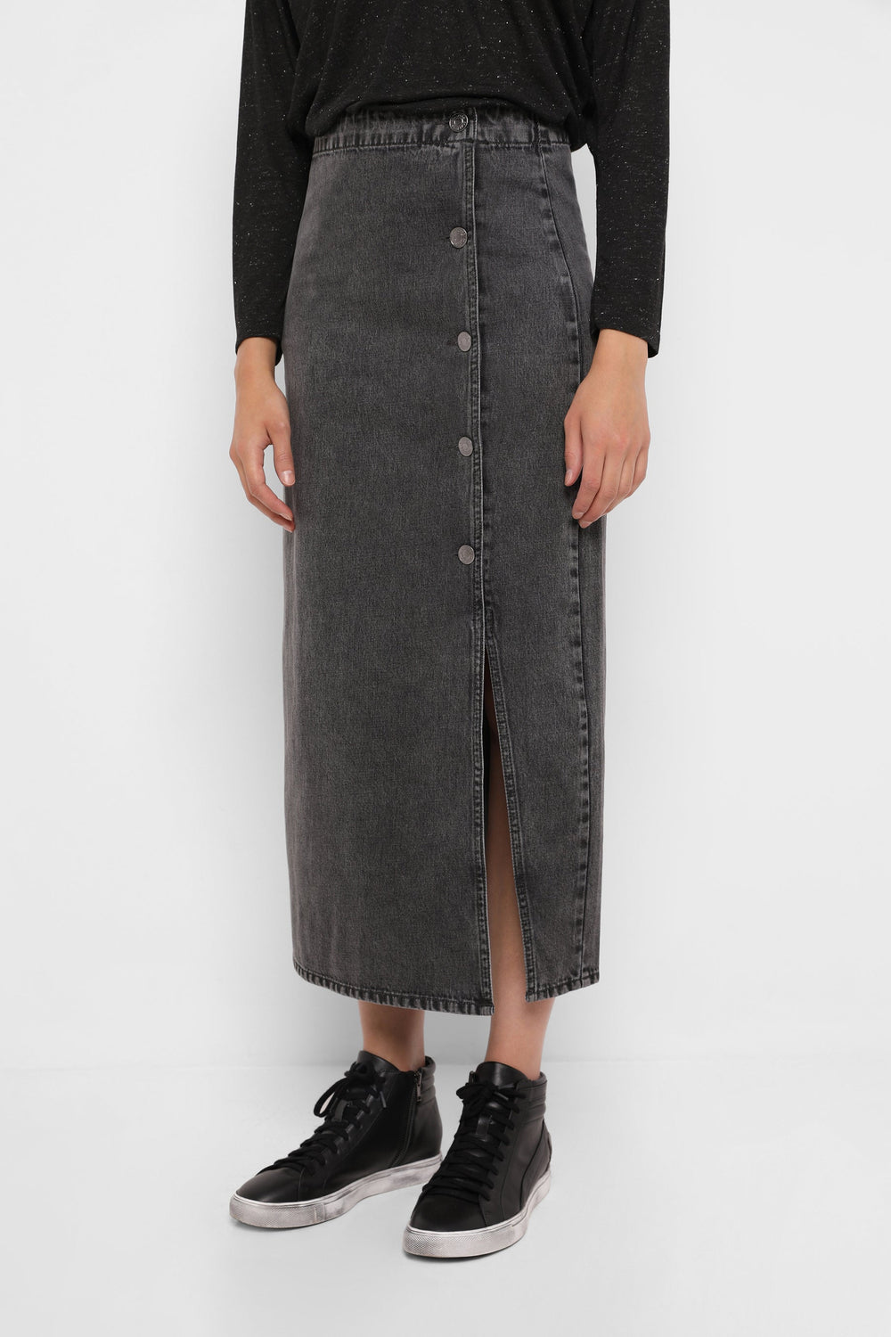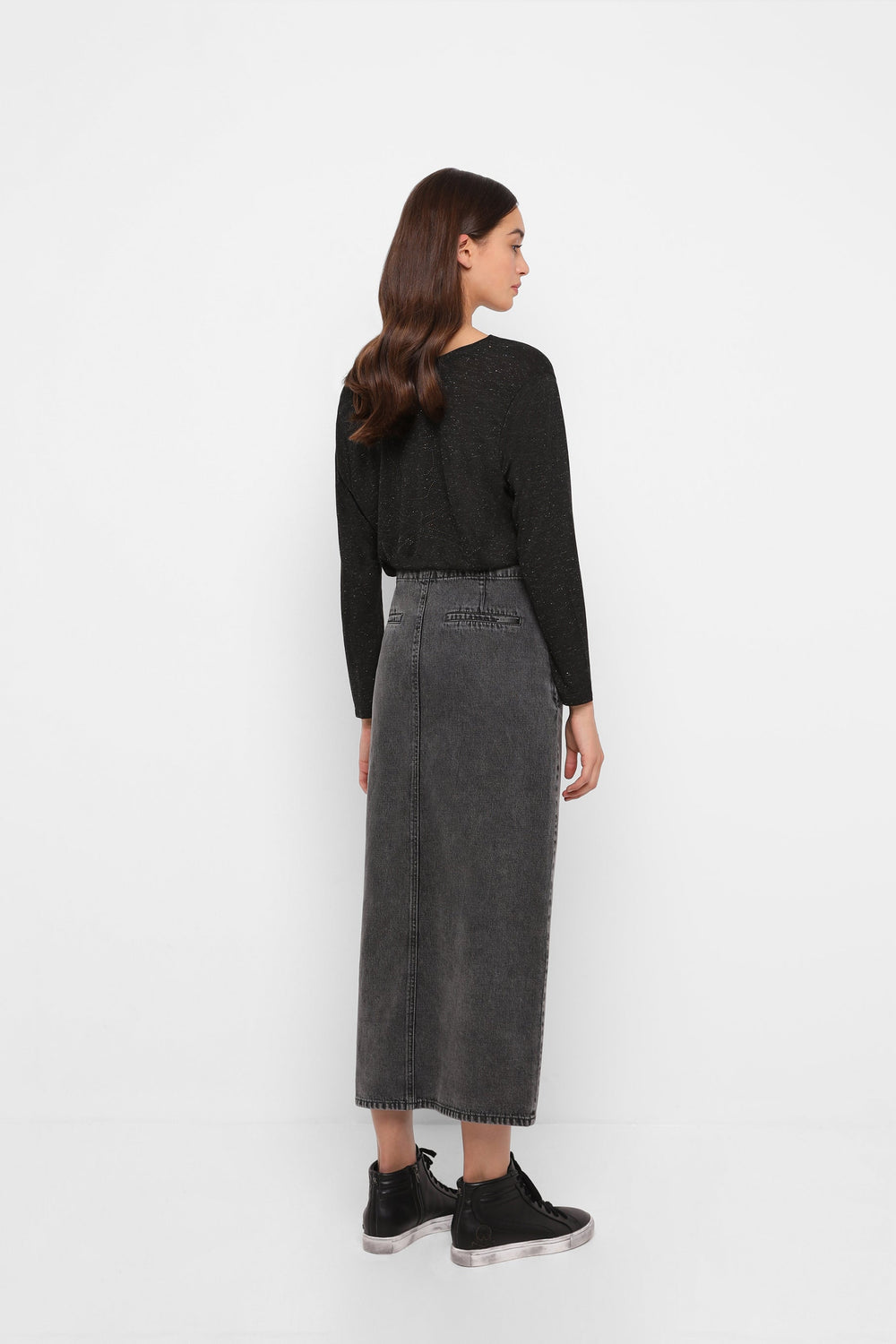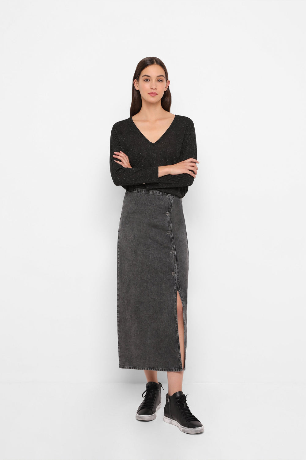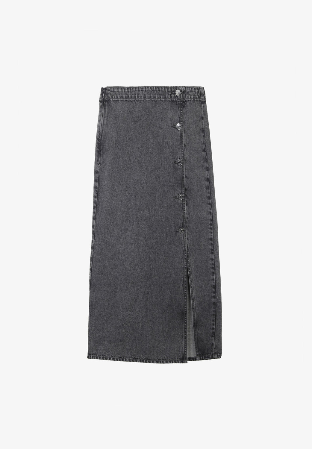 Denim midi skirt in slightly stretchy cotton blend. Slim fit, zip and side button fastening. Jetted back pockets. Front slit.