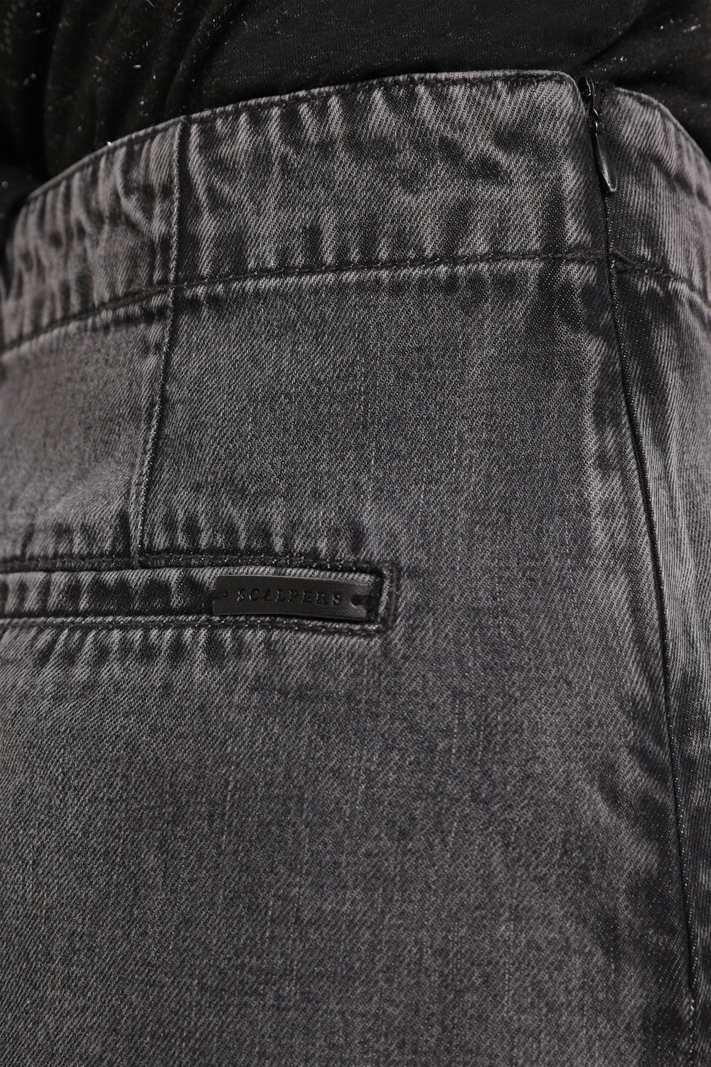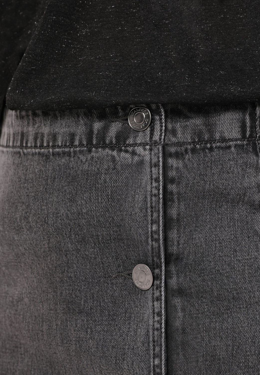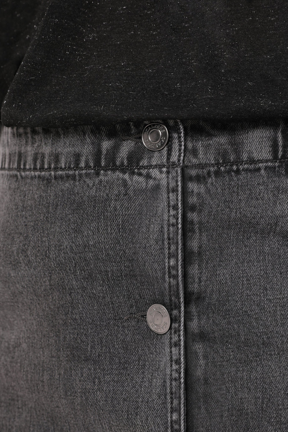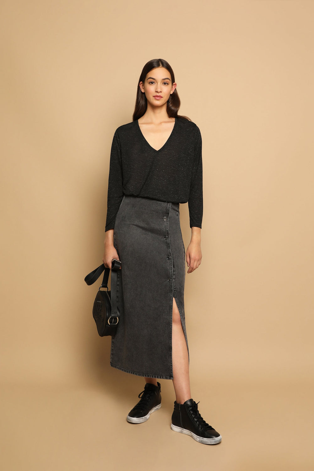 Denim midi skirt in slightly stretchy cotton blend. Slim fit, zip and side button fastening. Jetted back pockets. Front slit.