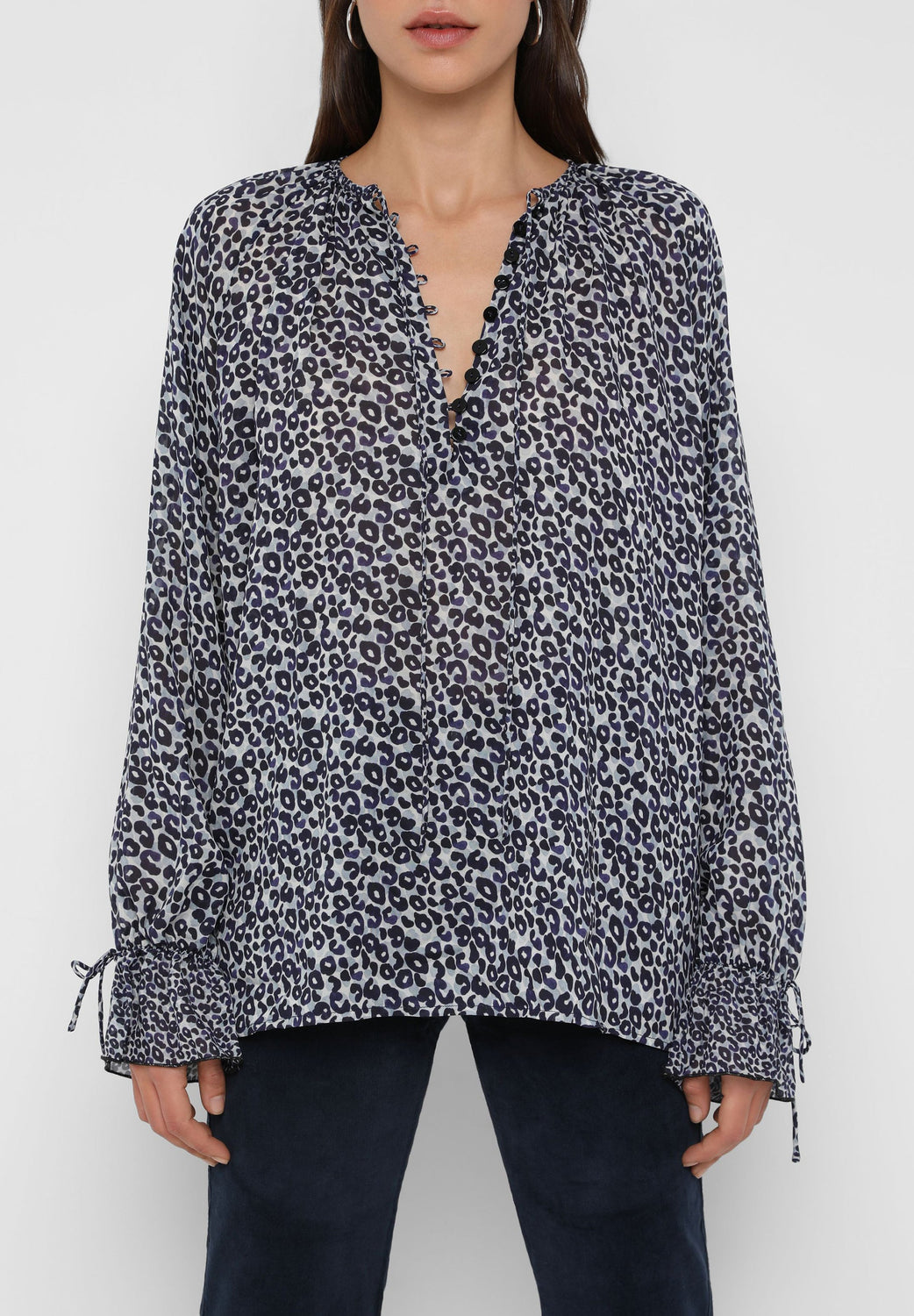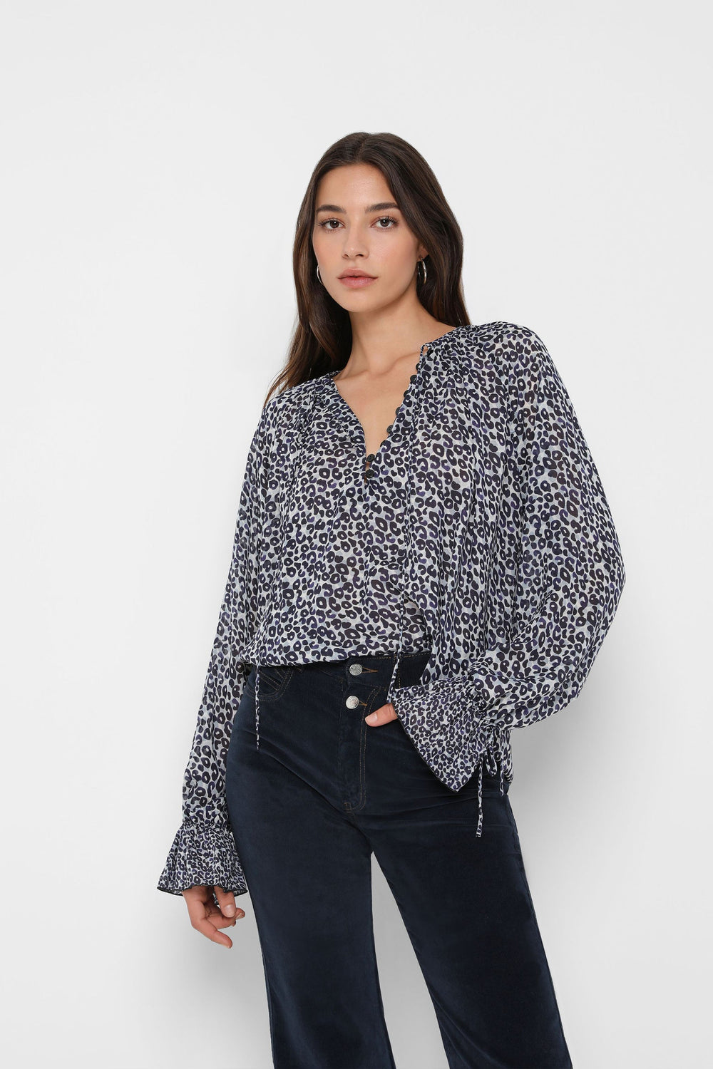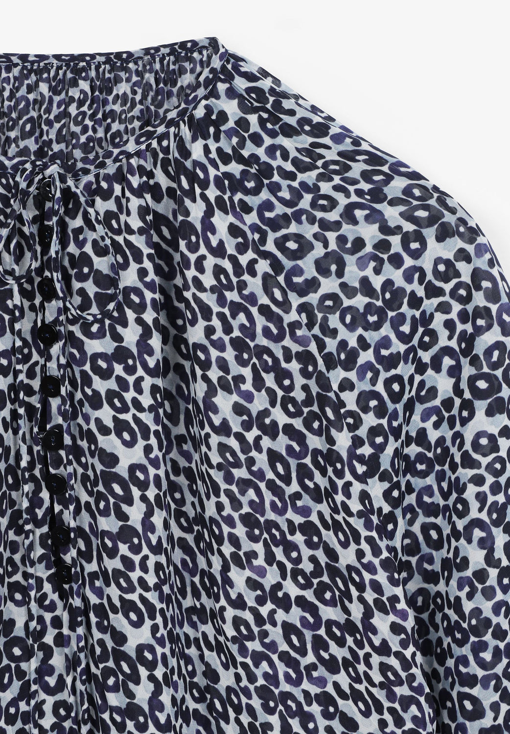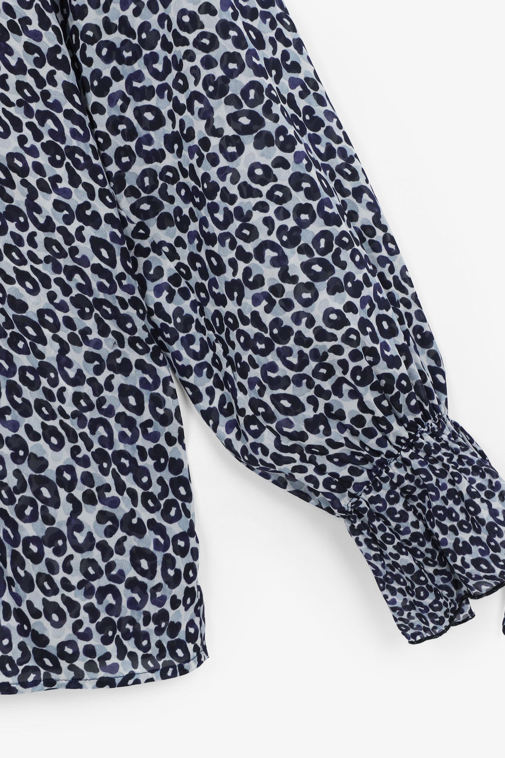 Semi-sheer animal print blouse. Regular fit, round collar with V-neck which closes with press-stud fastening. Long puffed sleeves.
