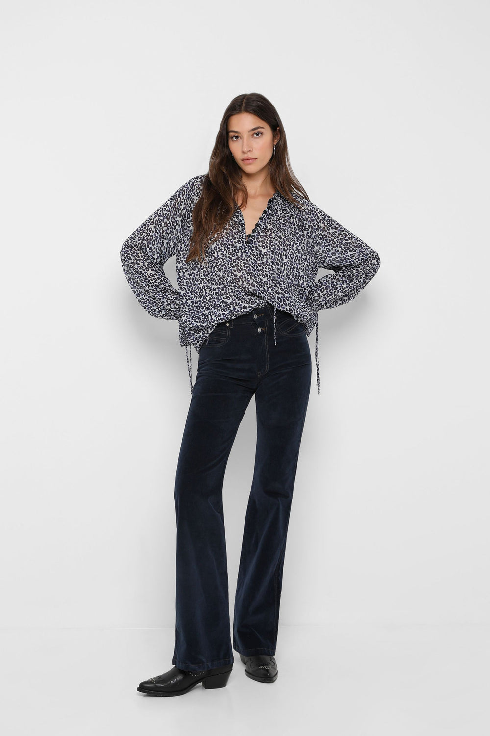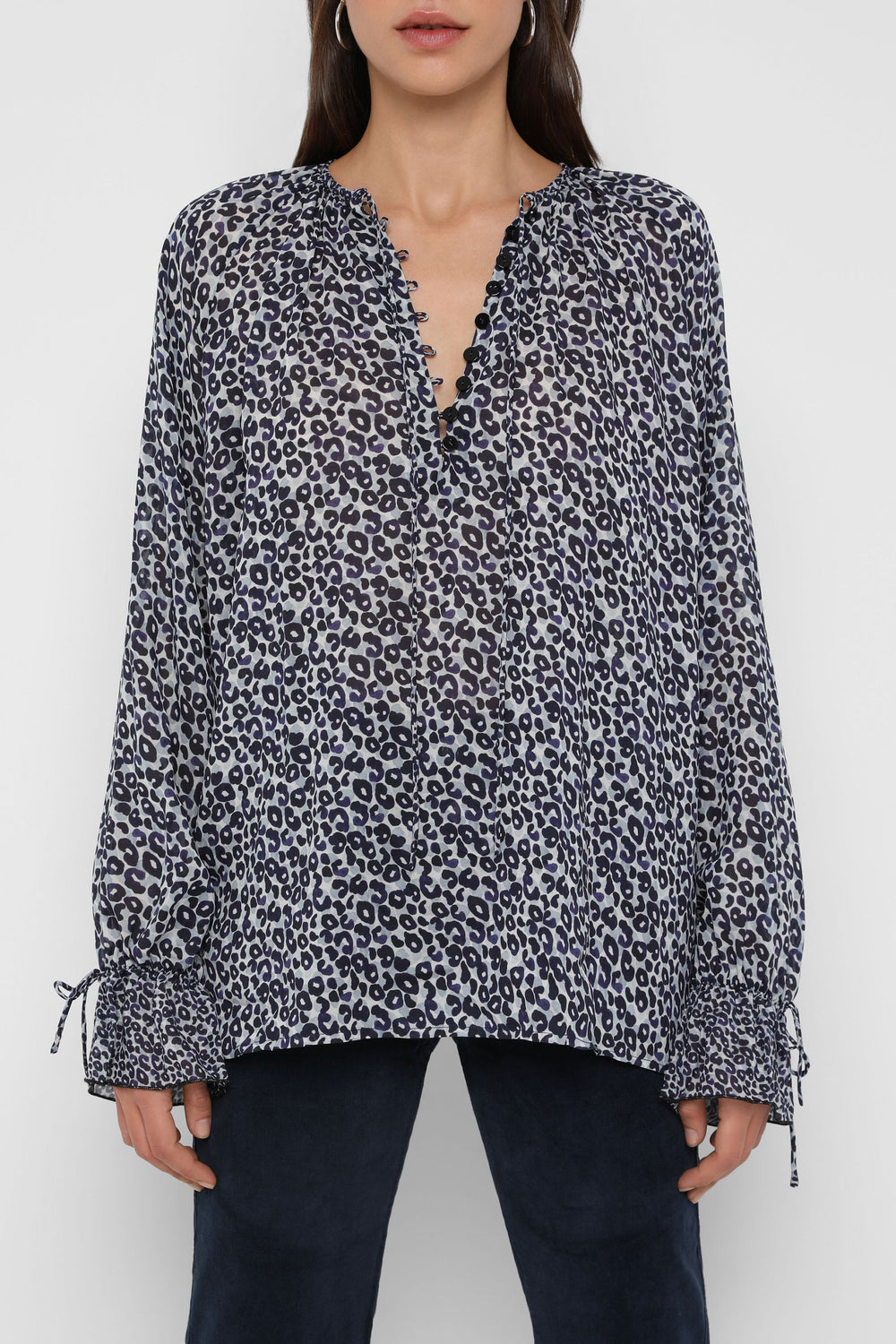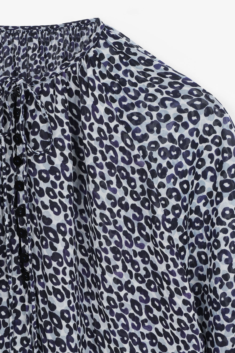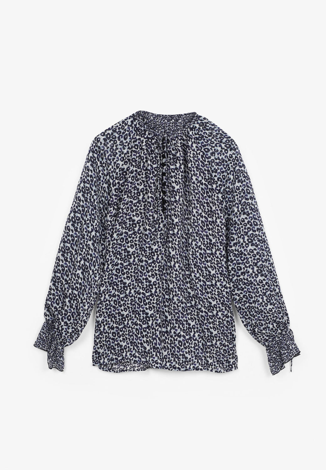 Semi-sheer animal print blouse. Regular fit, round collar with V-neck which closes with press-stud fastening. Long puffed sleeves.