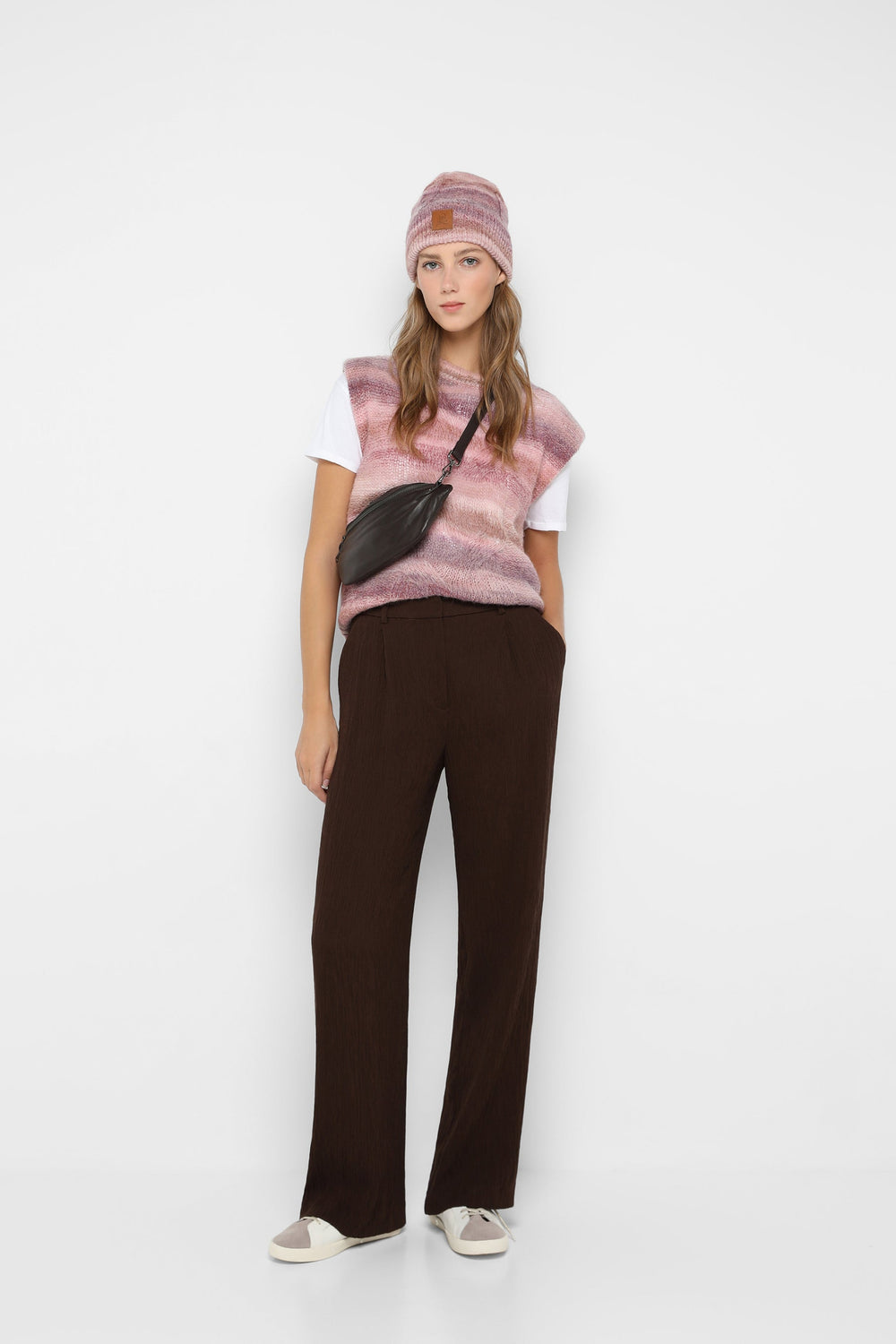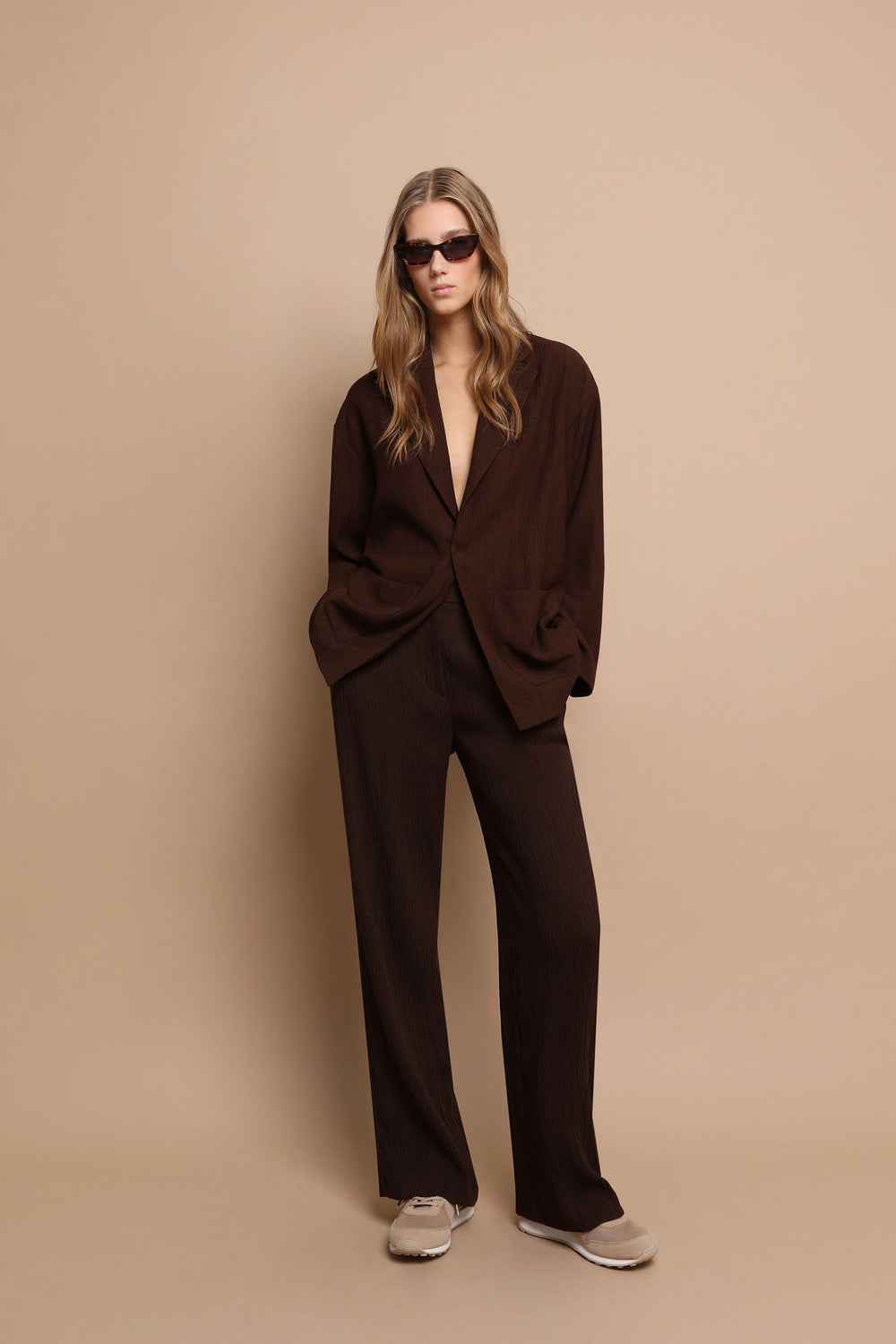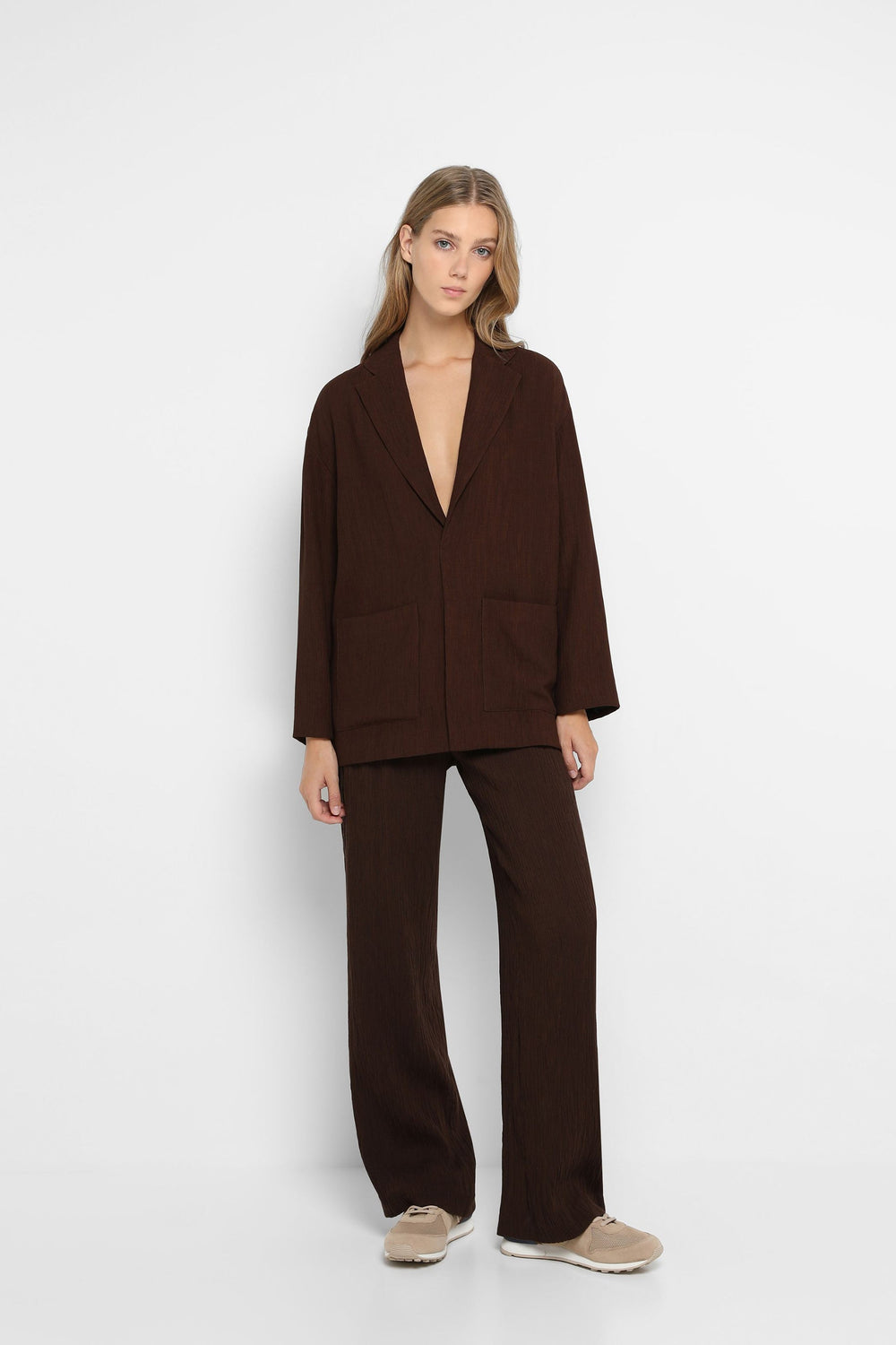 Flowing trousers made of bamboo fabric. Regular fit with darts, snap button and zip fastening. Side and front pockets, belt loops at waist.