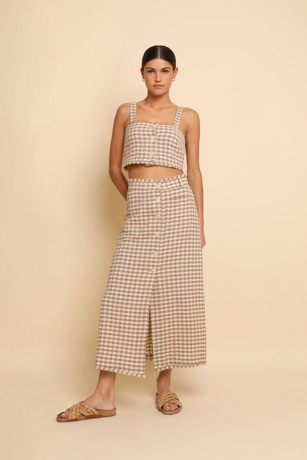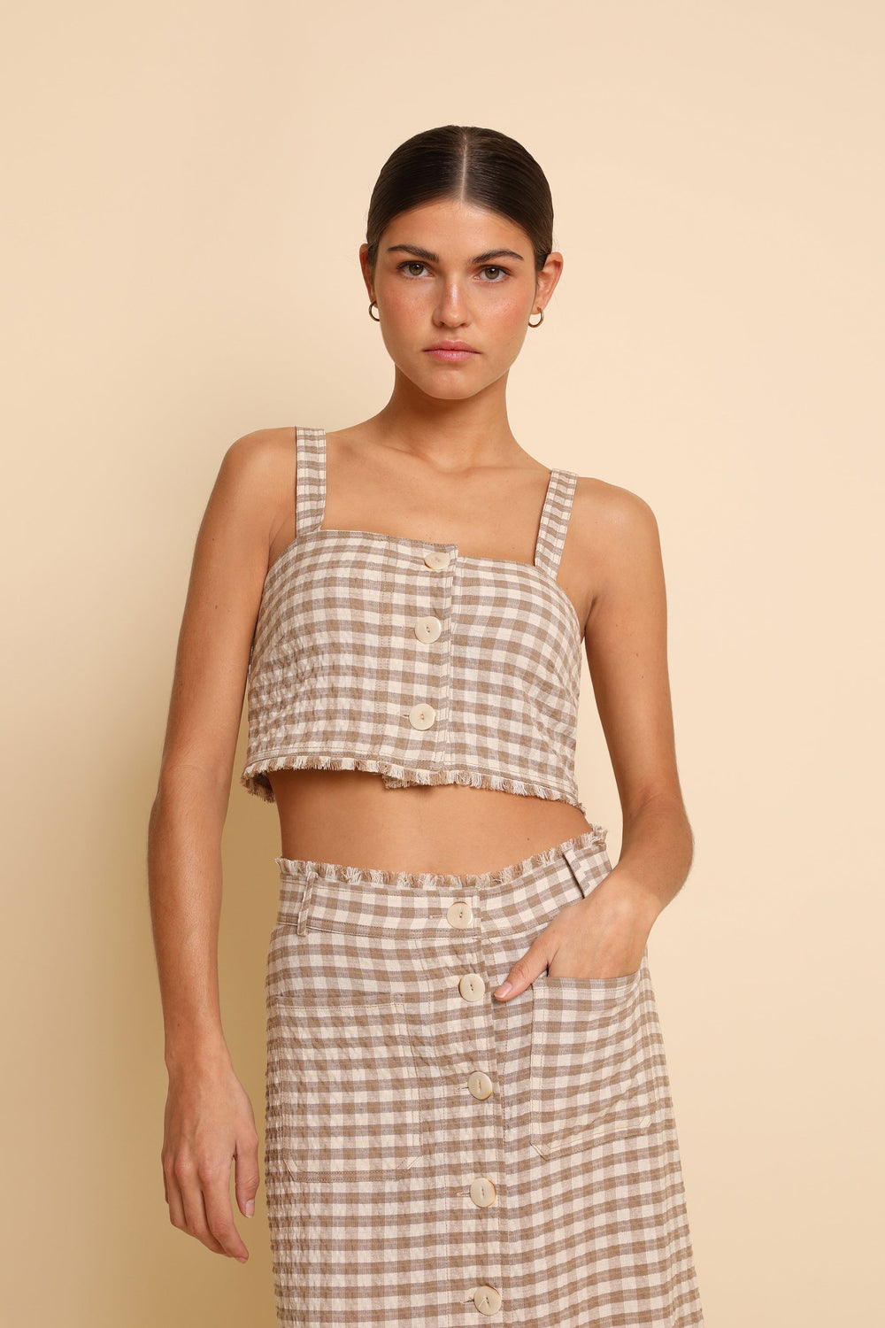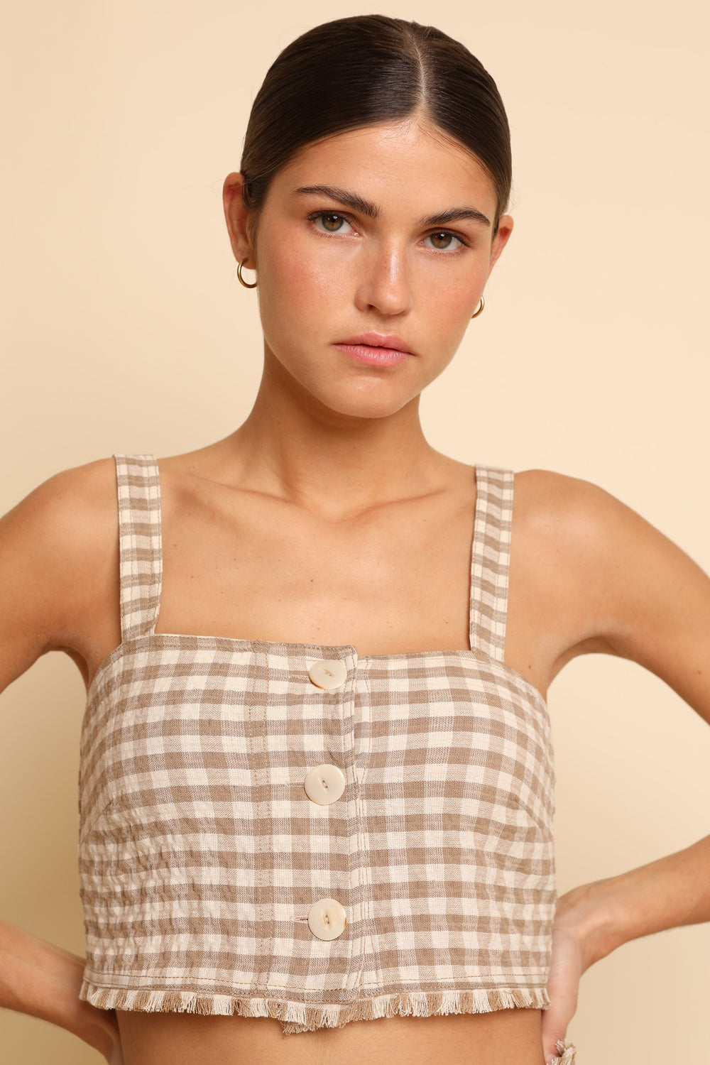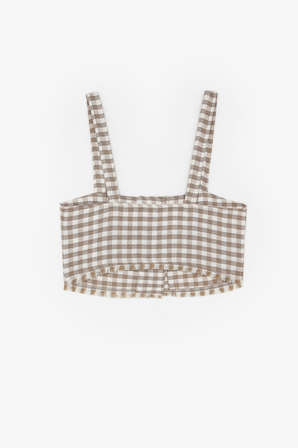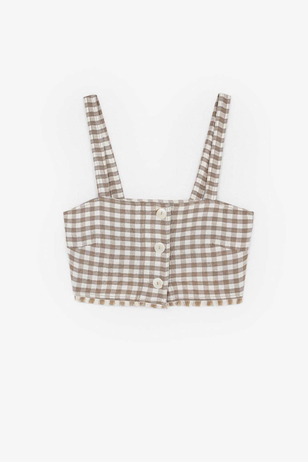 Cropped gingham top made of slightly stretchy cotton. Slim fit, button fastening and straps. Fringing detail on the hem.