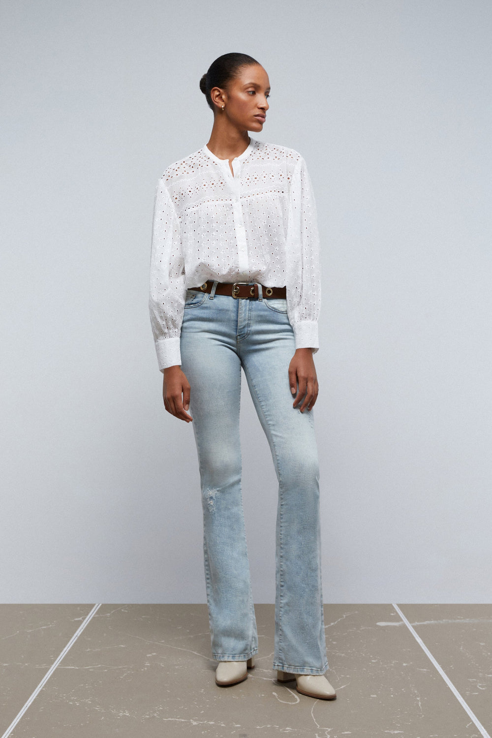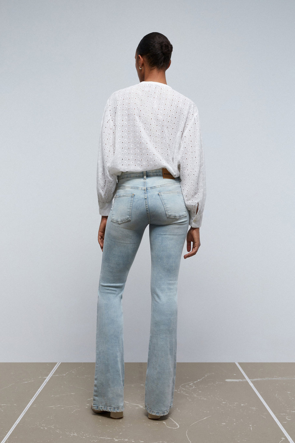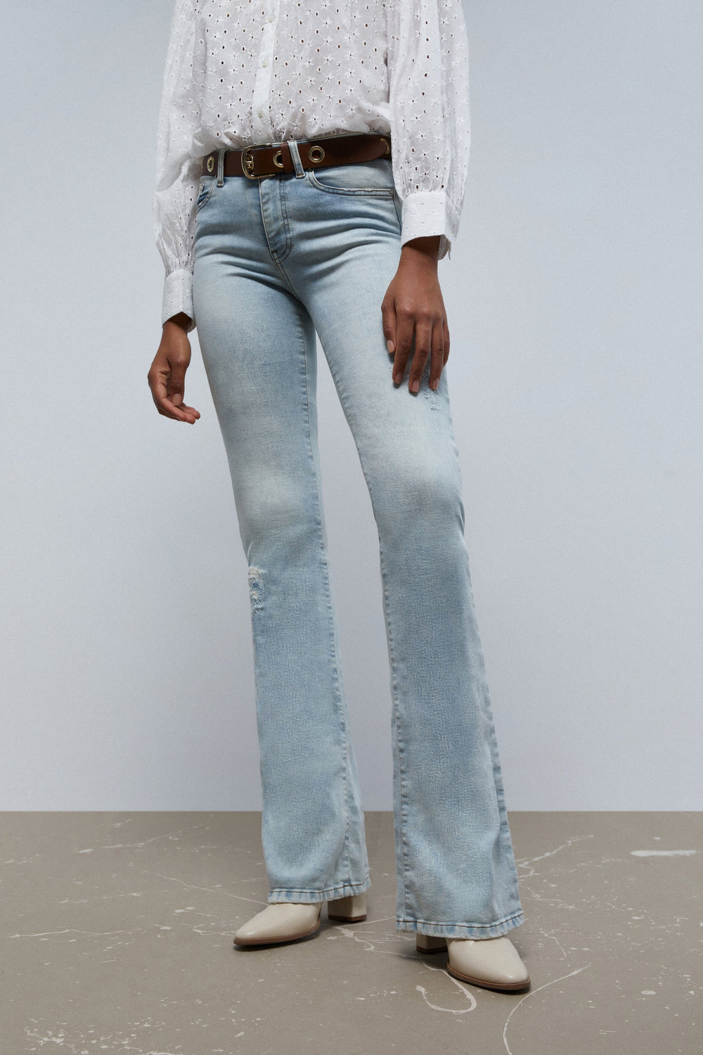 Denim jeans made from slight stretchy organic cotton. Regular fit bootcut, zip and button fastening. Belt loops and front and back pockets.