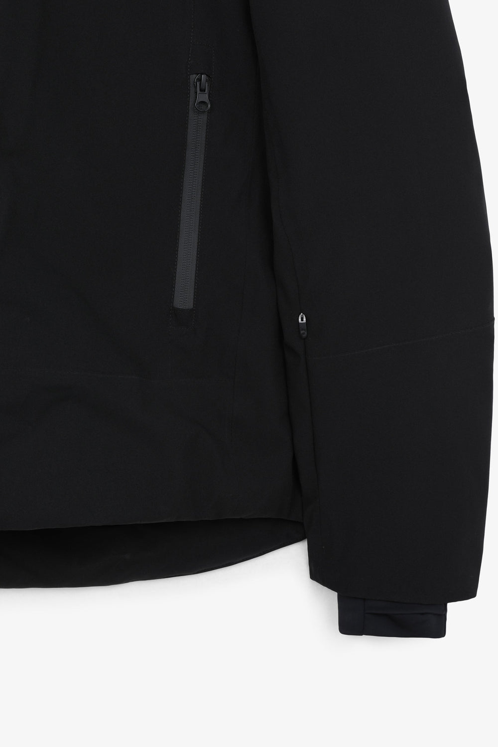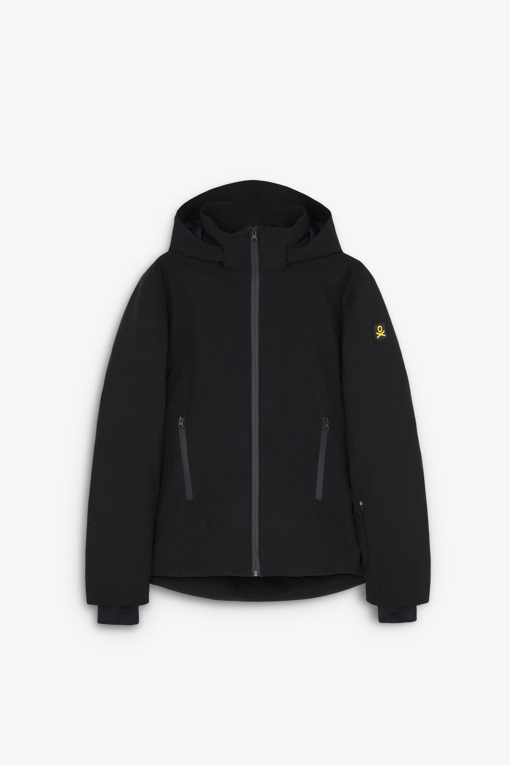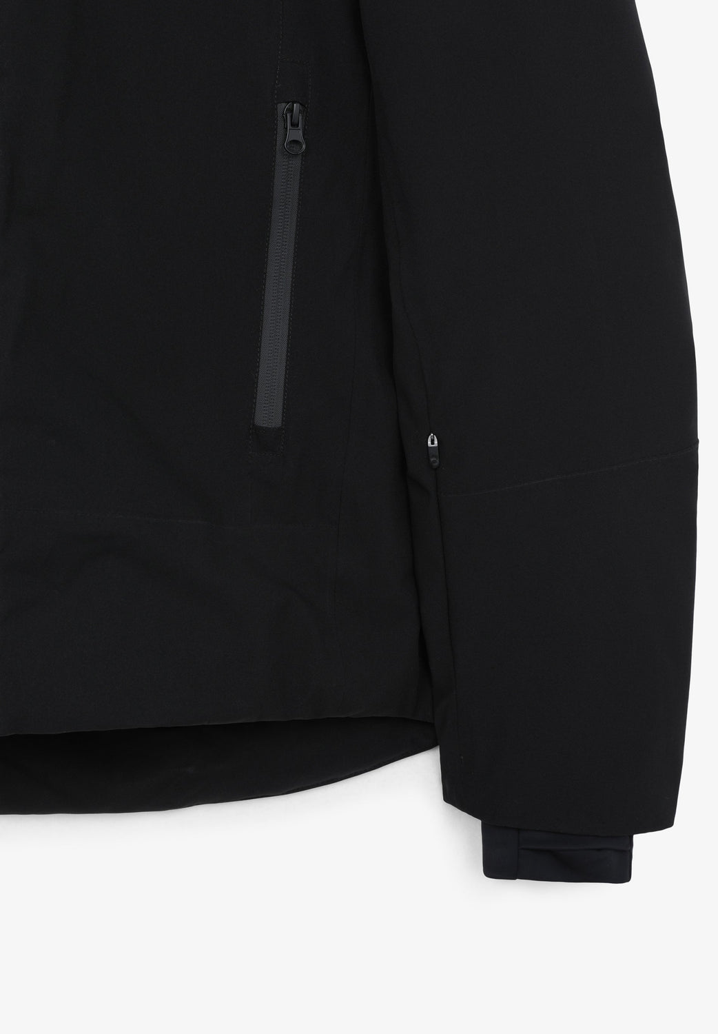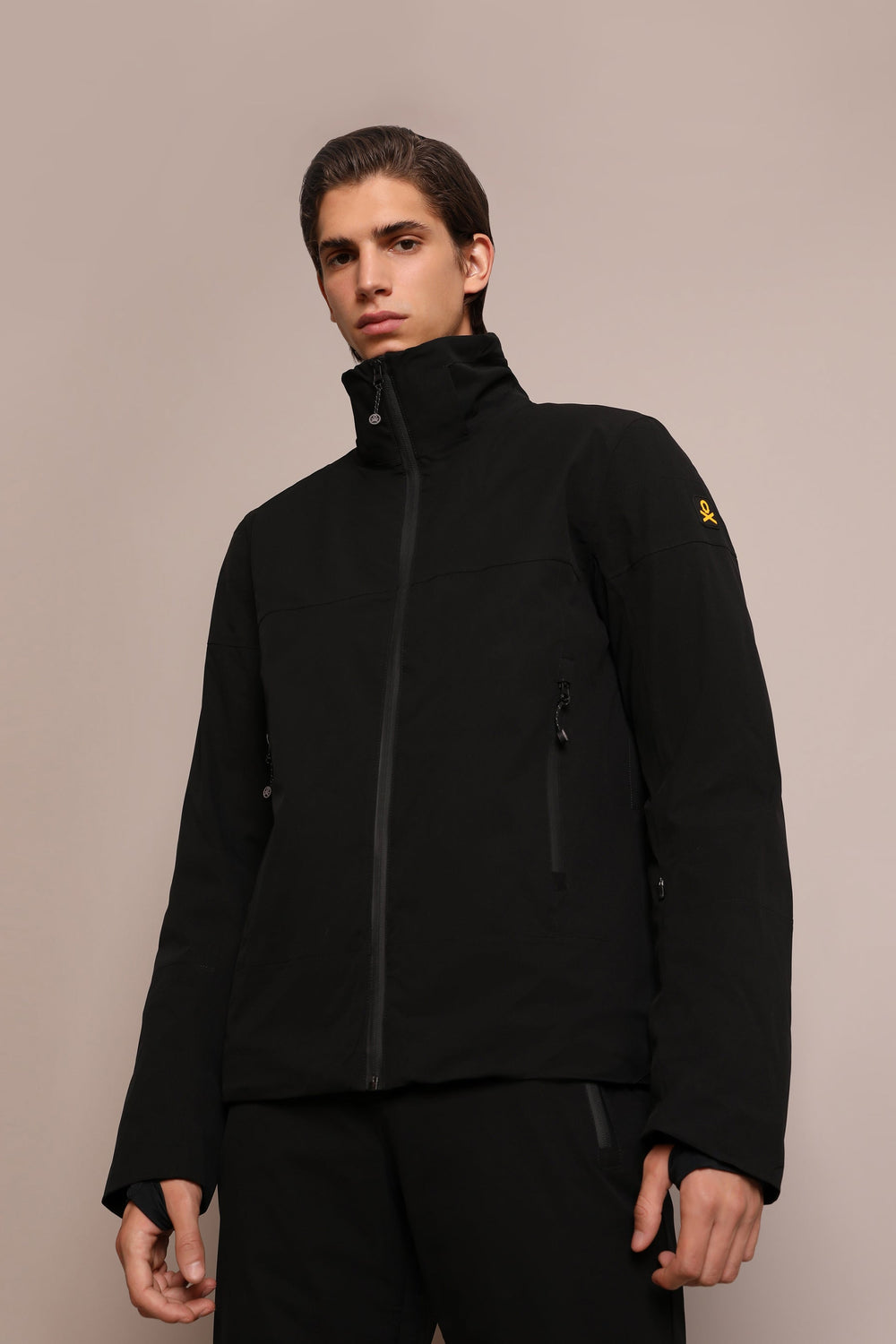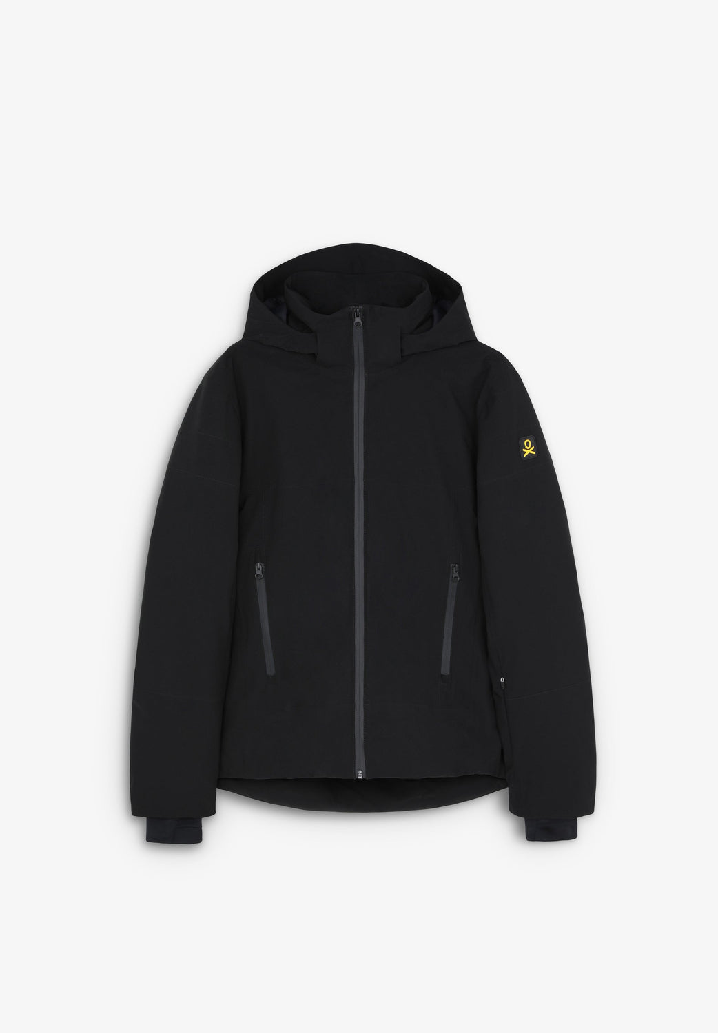 Technical ski jacket made of technical fabric with windproof and waterproof properties. Regular fit cut, stand-up collar with detachable hood with zip. Zip fastening with thermosealed zips. Panel construction and interior with microfleece panels. Long sleeves with cuffs and thumbhole to keep snow out. Inside sleeve closure with silicone elastic band and snaps. Underarm ventilation zips. Front pockets with heat-sealed zips, invisible zipped sleeve pocket and zipped inner security pocket with snow wipe and key lock, inner side pockets with mesh. Rubberised patch detail on sleeve.