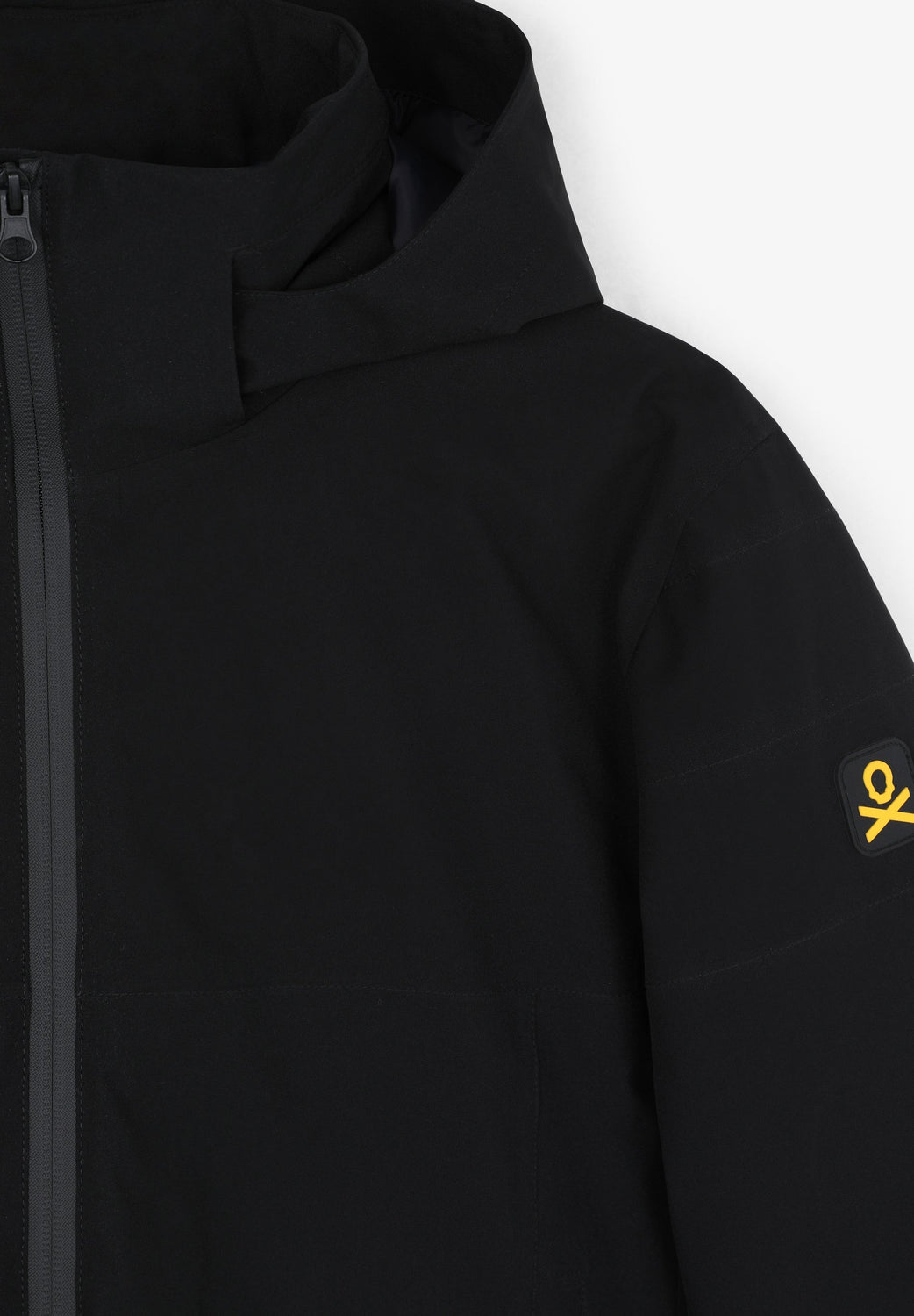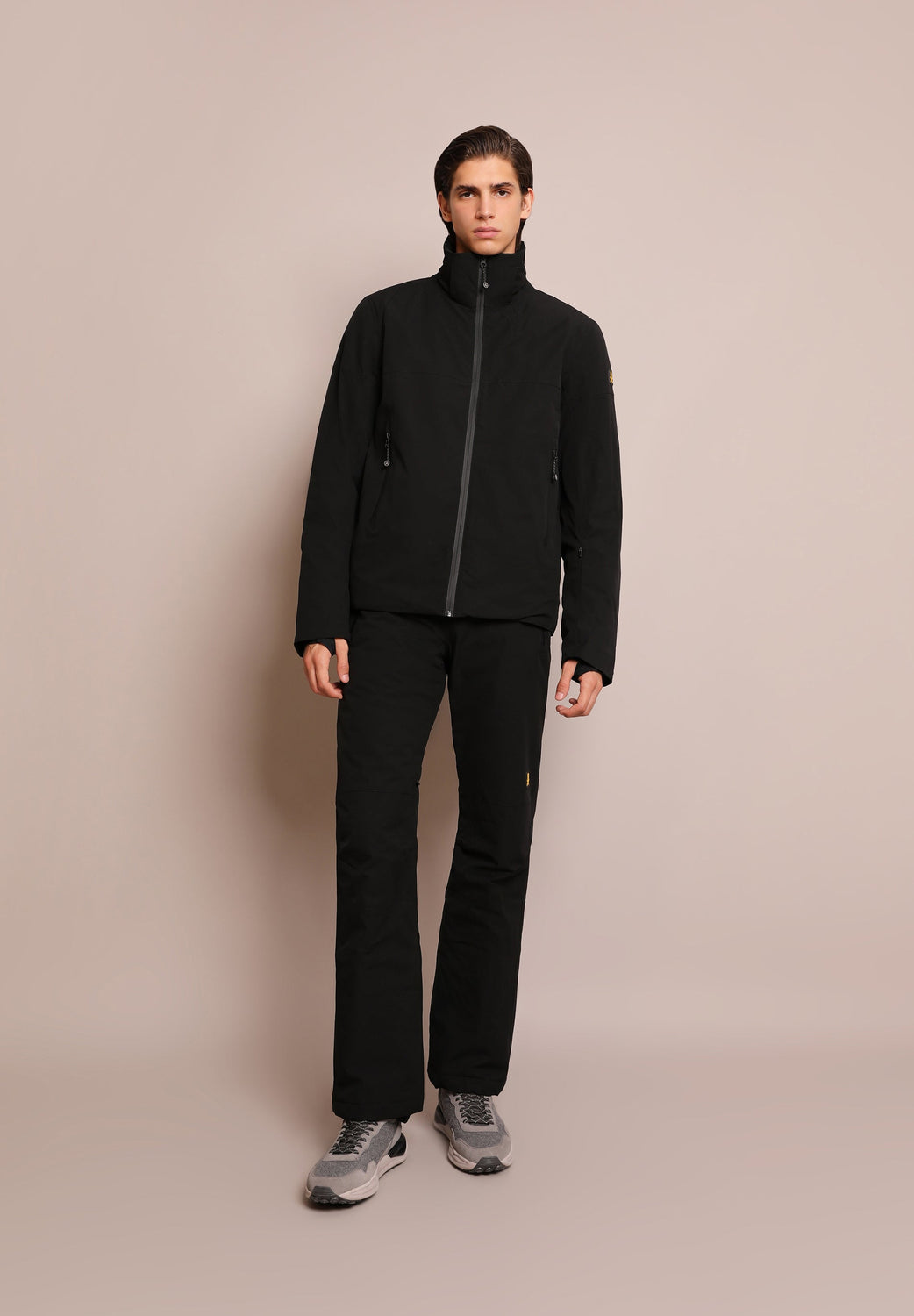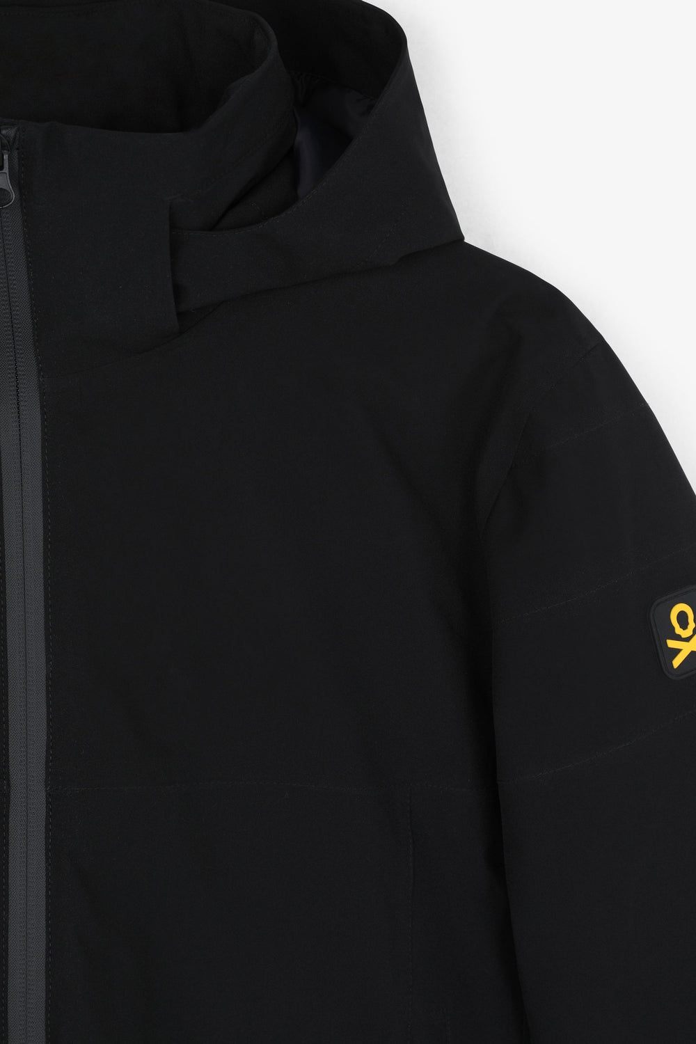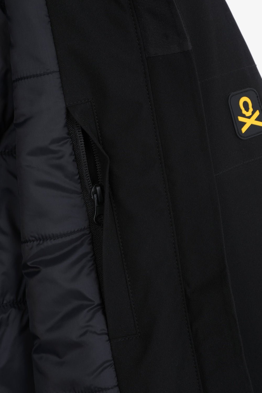 Technical ski jacket made of technical fabric with windproof and waterproof properties. Regular fit cut, stand-up collar with detachable hood with zip. Zip fastening with thermosealed zips. Panel construction and interior with microfleece panels. Long sleeves with cuffs and thumbhole to keep snow out. Inside sleeve closure with silicone elastic band and snaps. Underarm ventilation zips. Front pockets with heat-sealed zips, invisible zipped sleeve pocket and zipped inner security pocket with snow wipe and key lock, inner side pockets with mesh. Rubberised patch detail on sleeve.