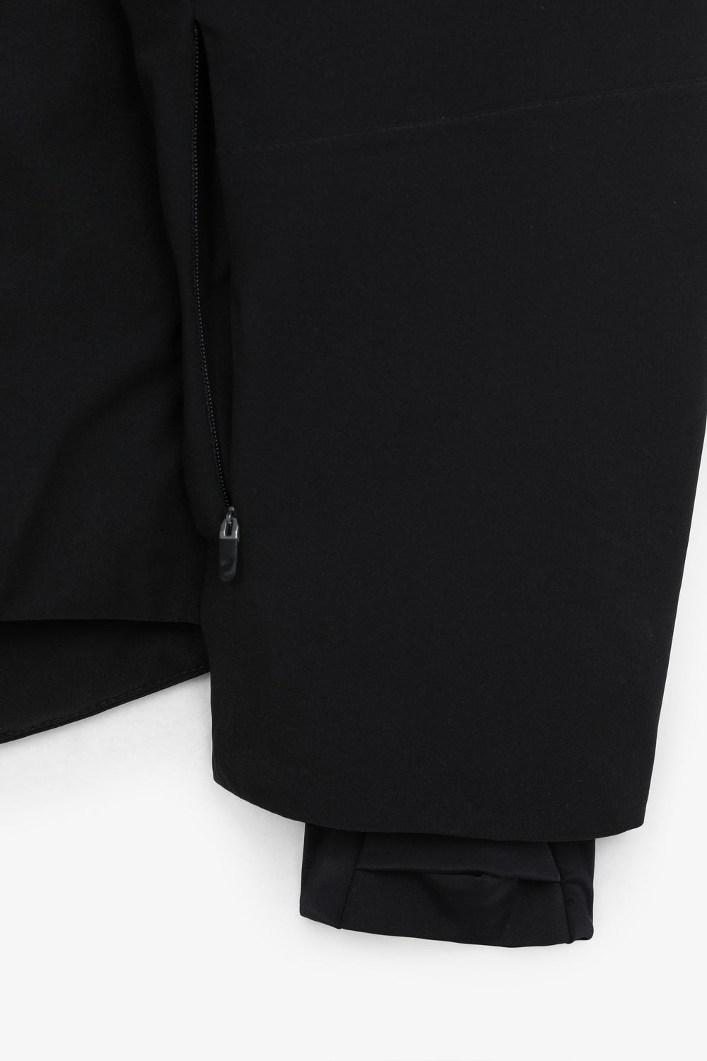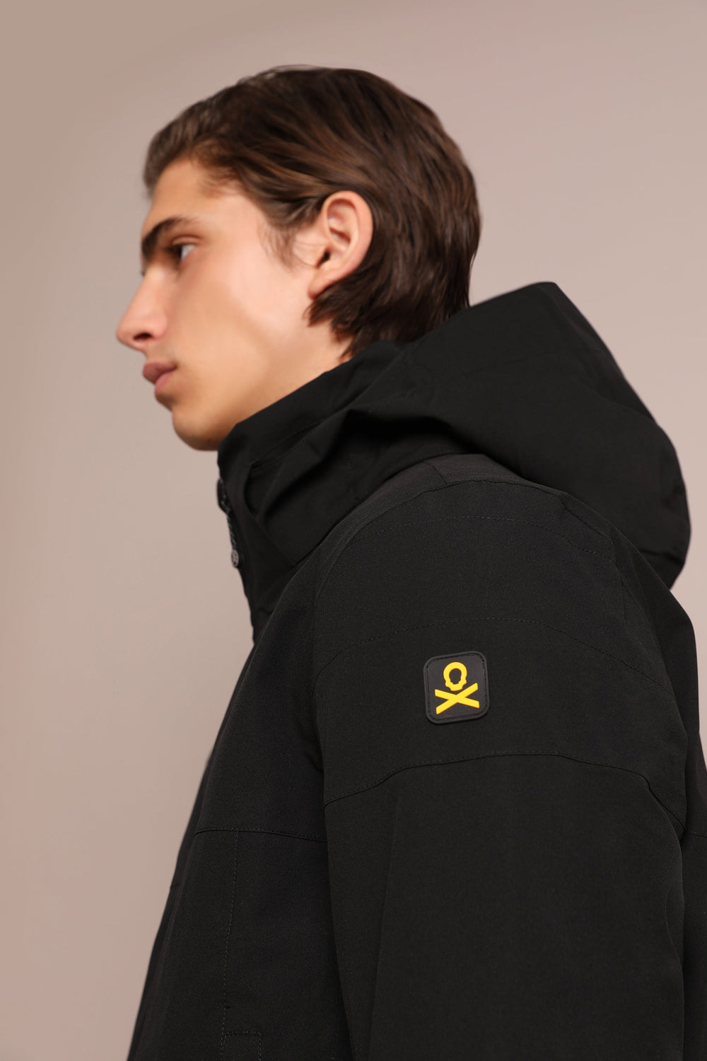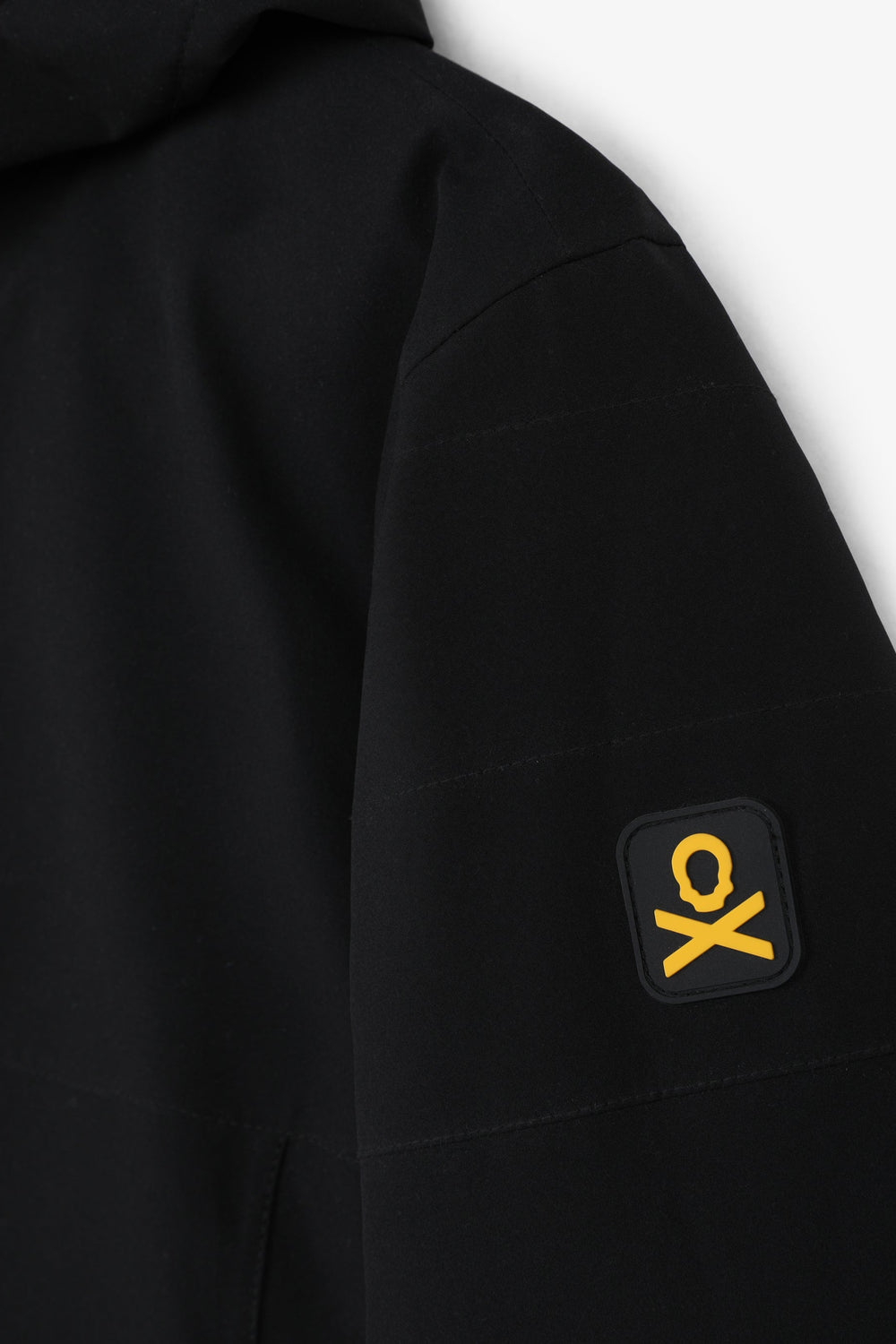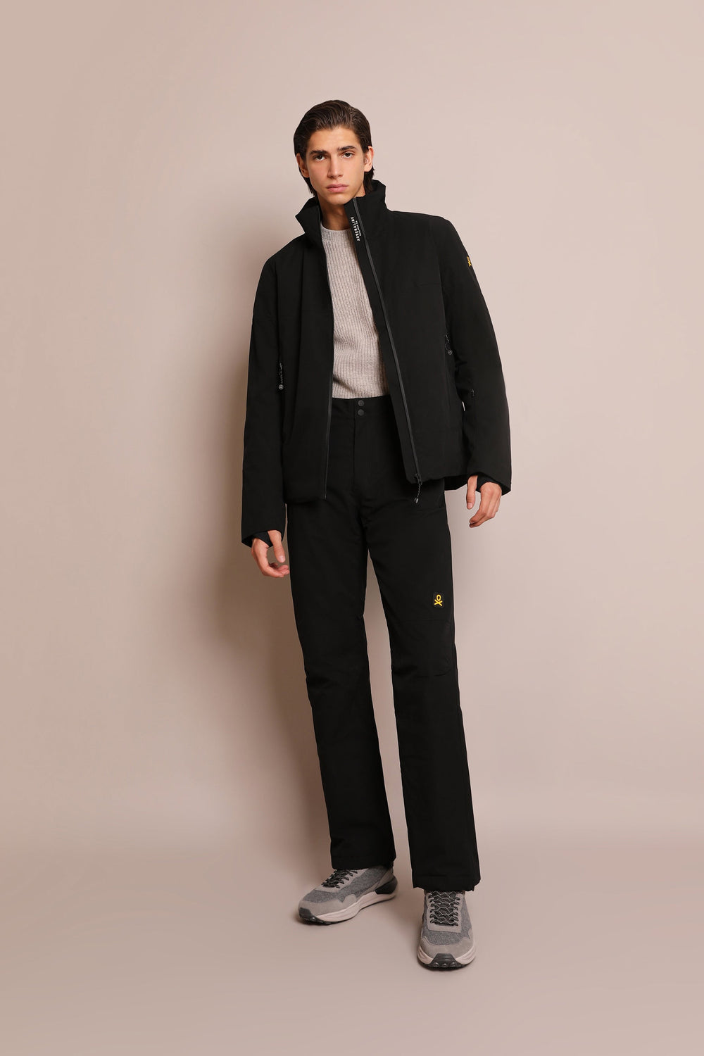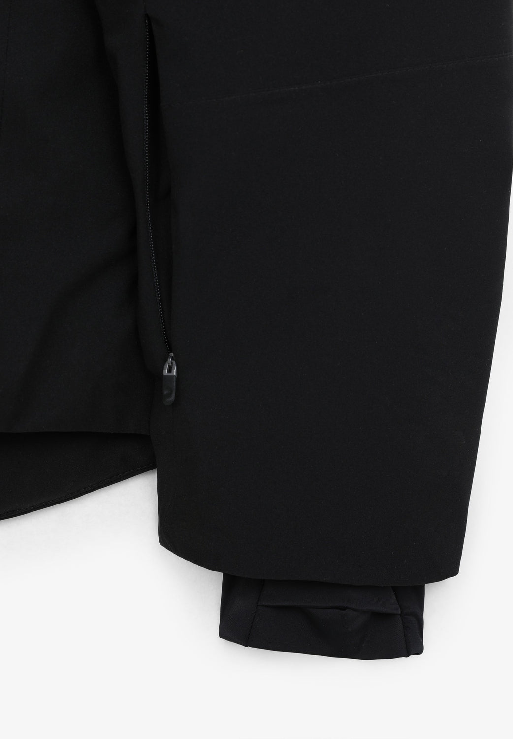 Technical ski jacket made of technical fabric with windproof and waterproof properties. Regular fit cut, stand-up collar with detachable hood with zip. Zip fastening with thermosealed zips. Panel construction and interior with microfleece panels. Long sleeves with cuffs and thumbhole to keep snow out. Inside sleeve closure with silicone elastic band and snaps. Underarm ventilation zips. Front pockets with heat-sealed zips, invisible zipped sleeve pocket and zipped inner security pocket with snow wipe and key lock, inner side pockets with mesh. Rubberised patch detail on sleeve.