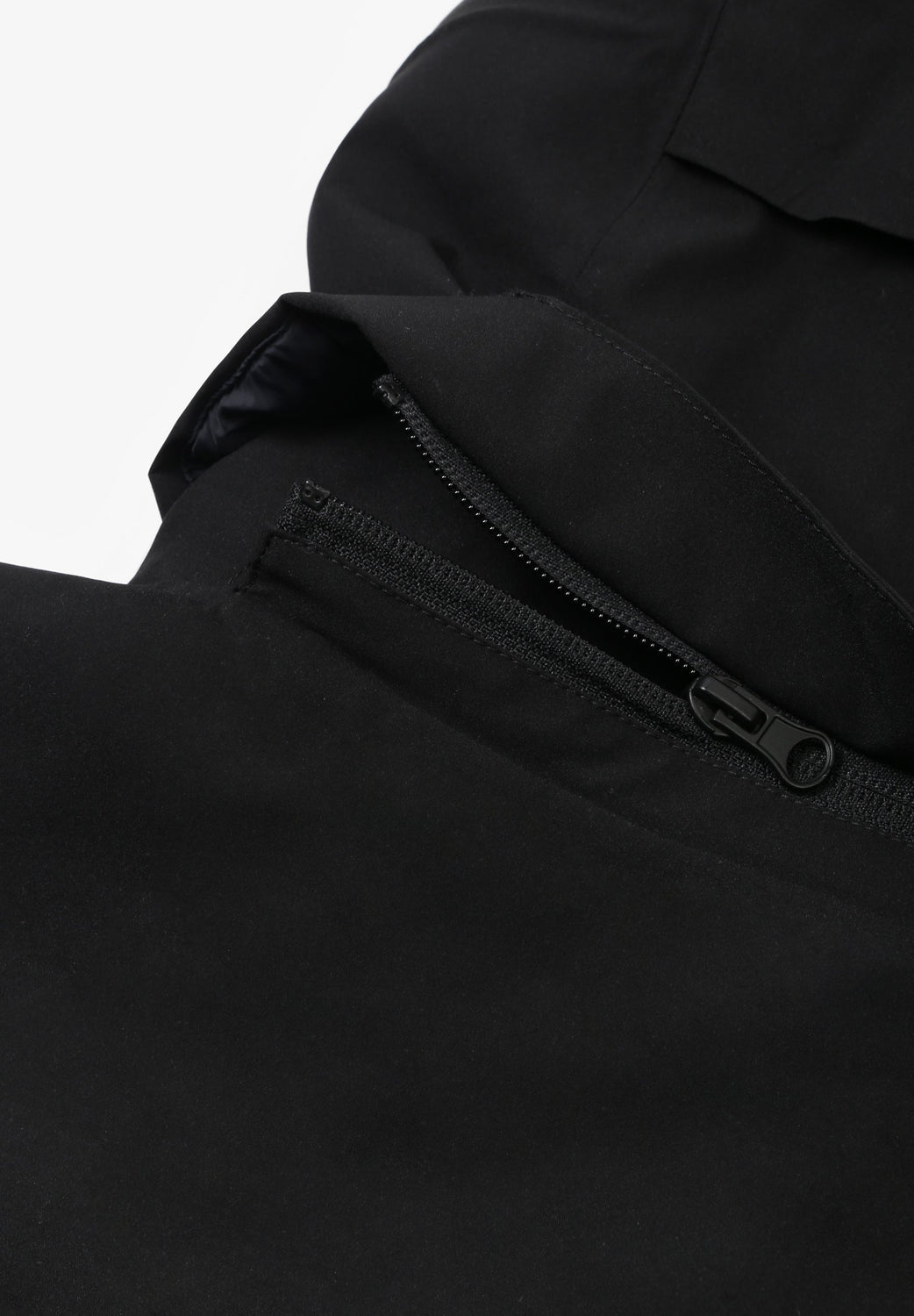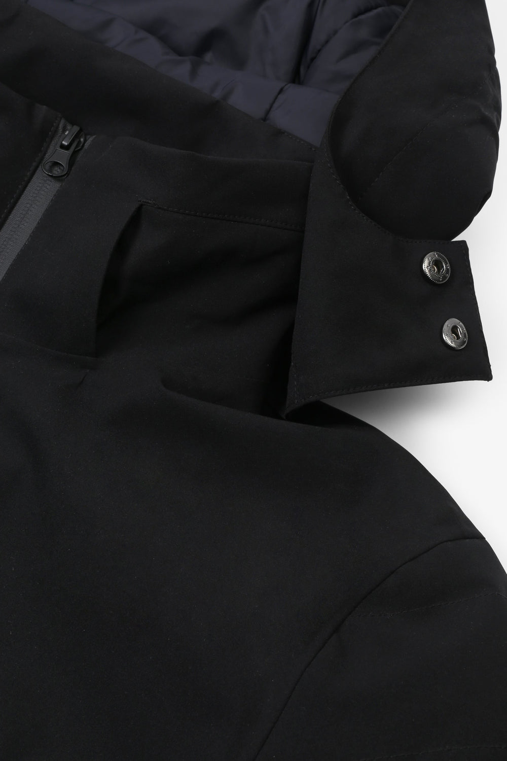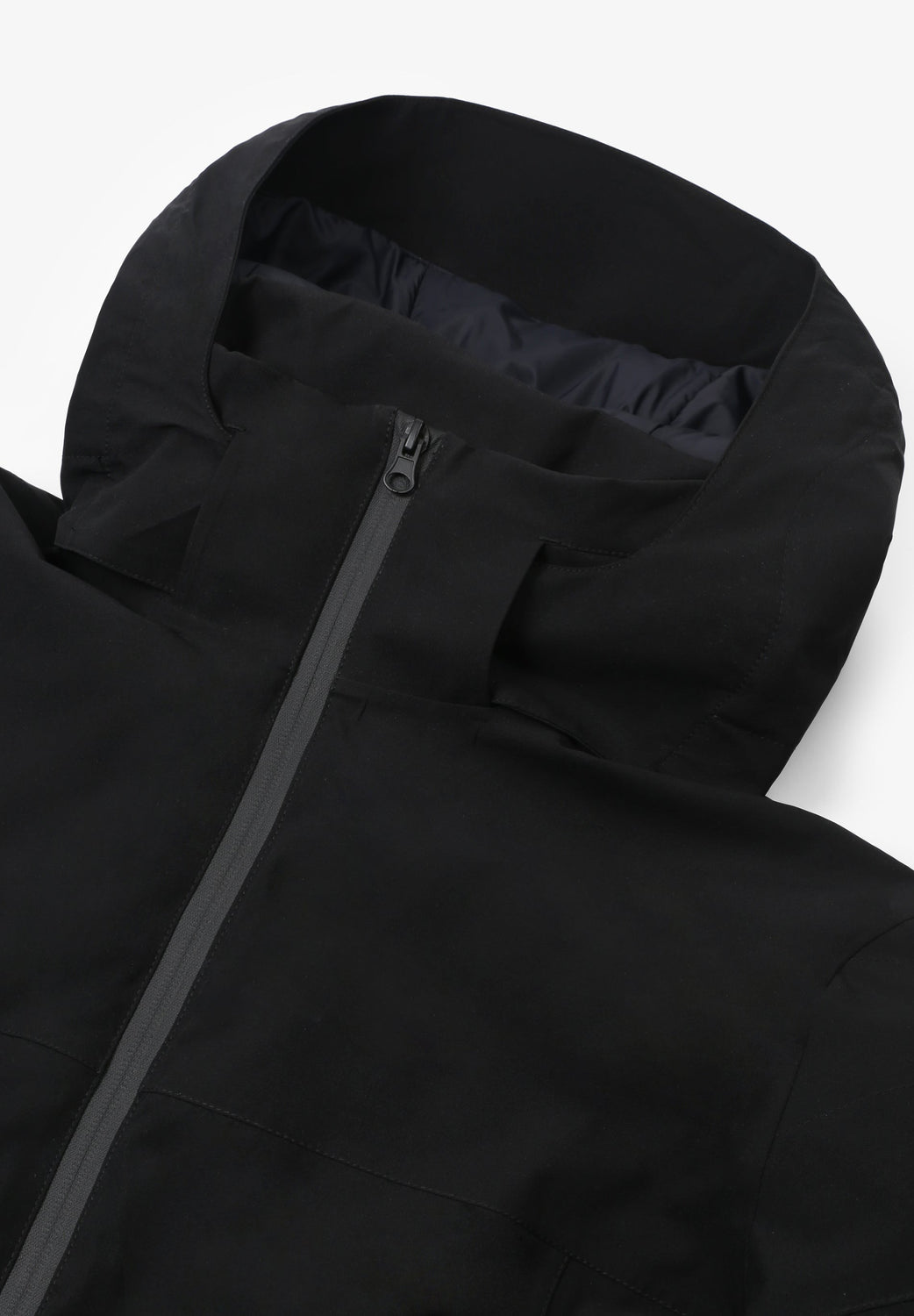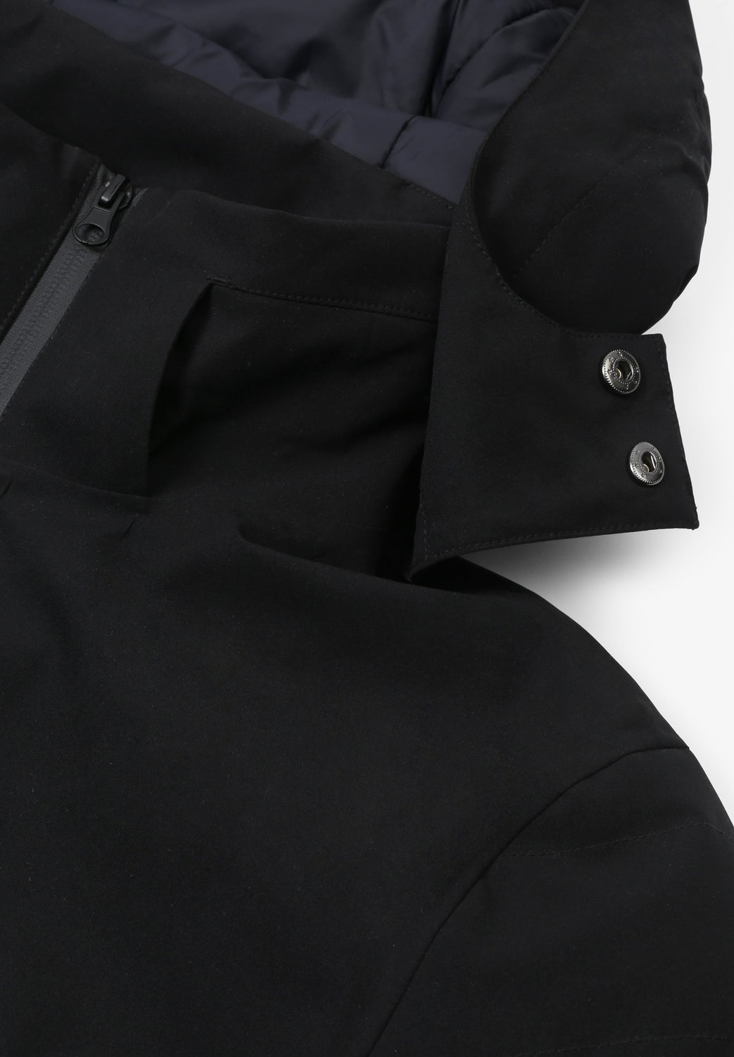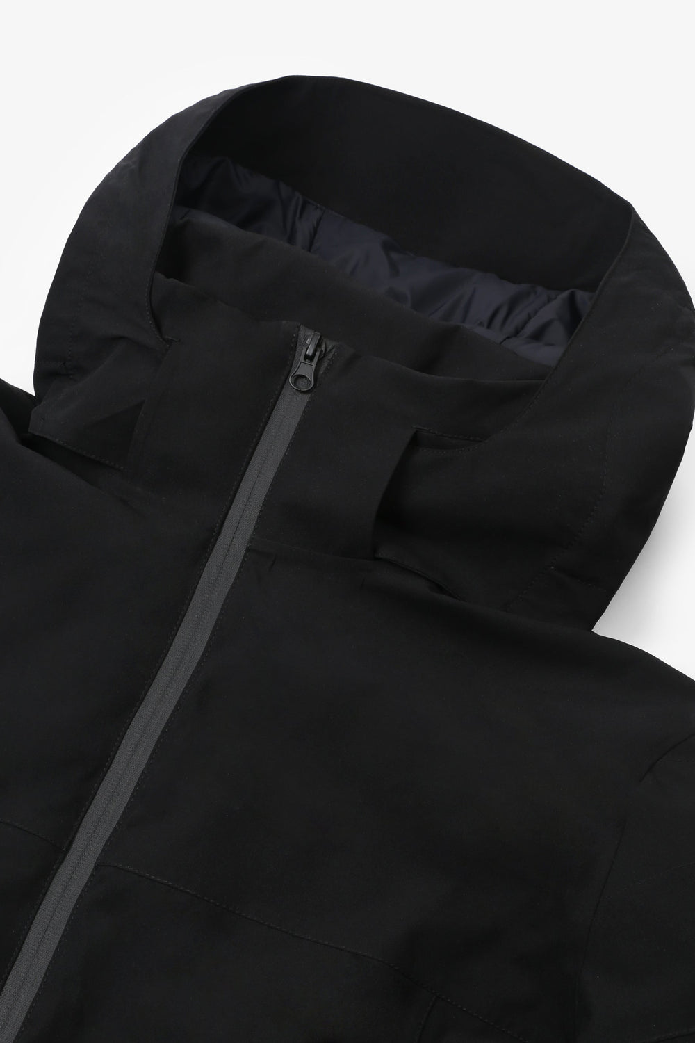 Technical ski jacket made of technical fabric with windproof and waterproof properties. Regular fit cut, stand-up collar with detachable hood with zip. Zip fastening with thermosealed zips. Panel construction and interior with microfleece panels. Long sleeves with cuffs and thumbhole to keep snow out. Inside sleeve closure with silicone elastic band and snaps. Underarm ventilation zips. Front pockets with heat-sealed zips, invisible zipped sleeve pocket and zipped inner security pocket with snow wipe and key lock, inner side pockets with mesh. Rubberised patch detail on sleeve.