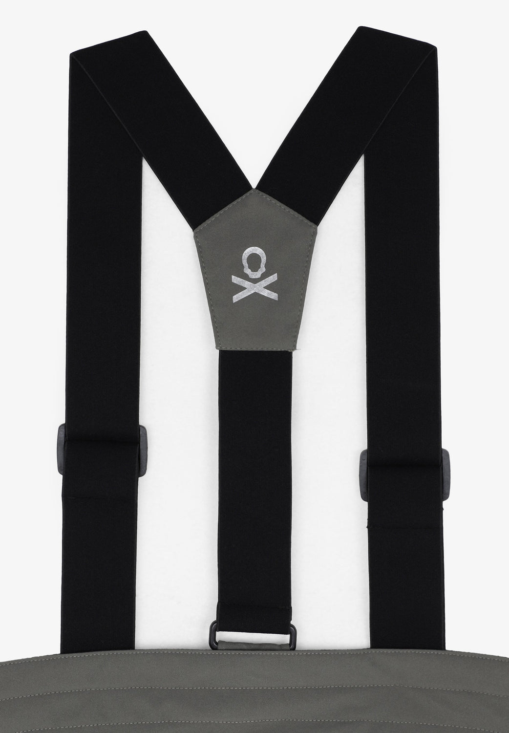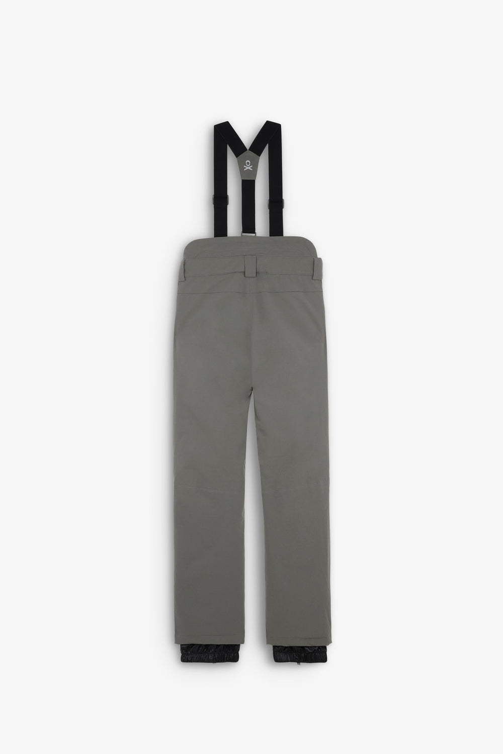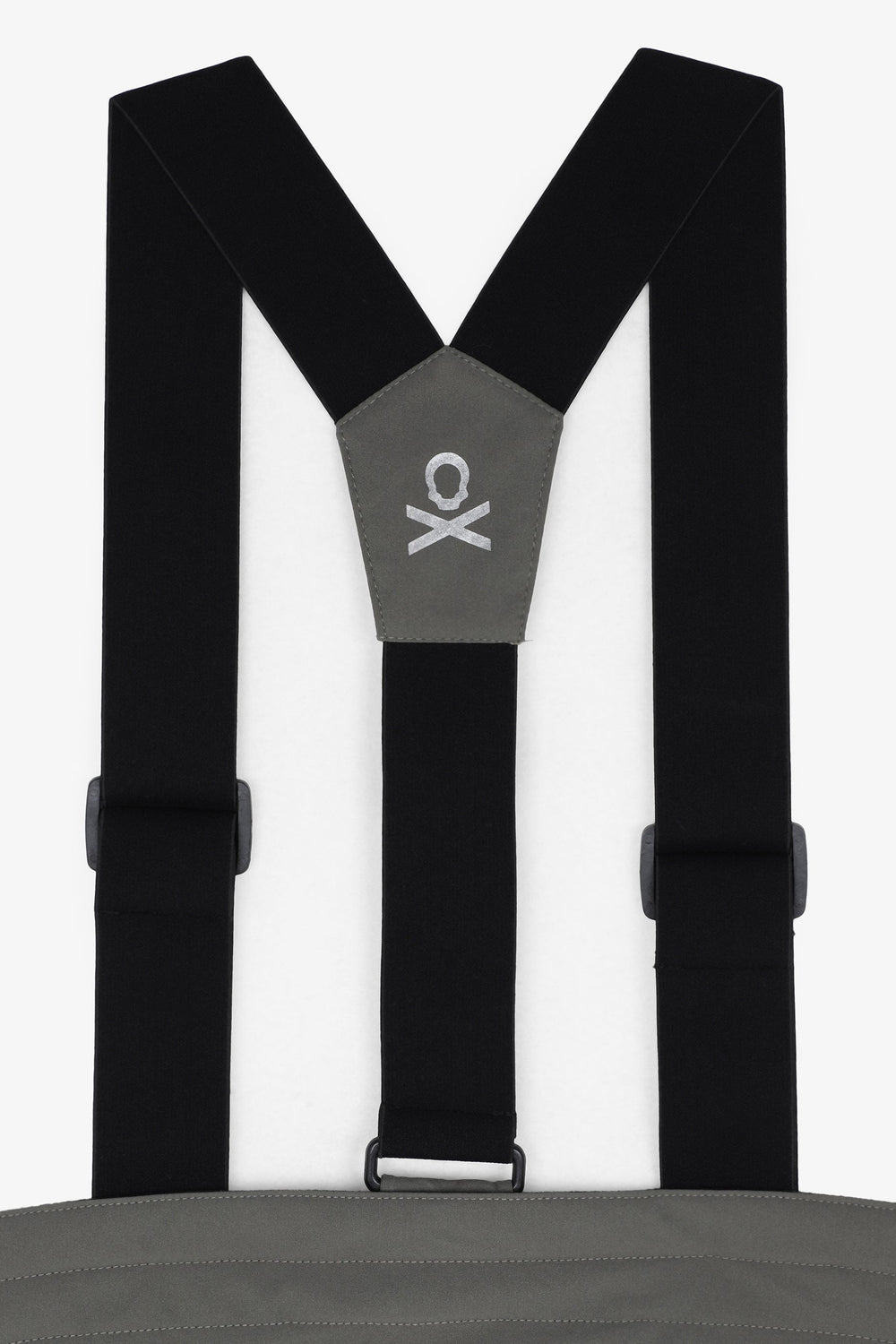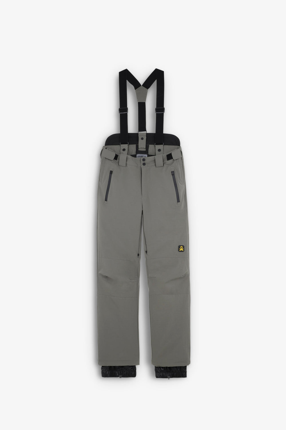 Ski trousers made of technical fabric. Regular fit cut with velcro waist adjusters. Padded back waist with higher panel for lumbar protection. Snap and zip fastening. Elasticated and adjustable shoulder straps. Side pockets with heat-sealed zips. Ventilation openings with zips. Elasticated bottom with Velcro fastening and snaps. Hook for attaching boot. Reflective skull detail.