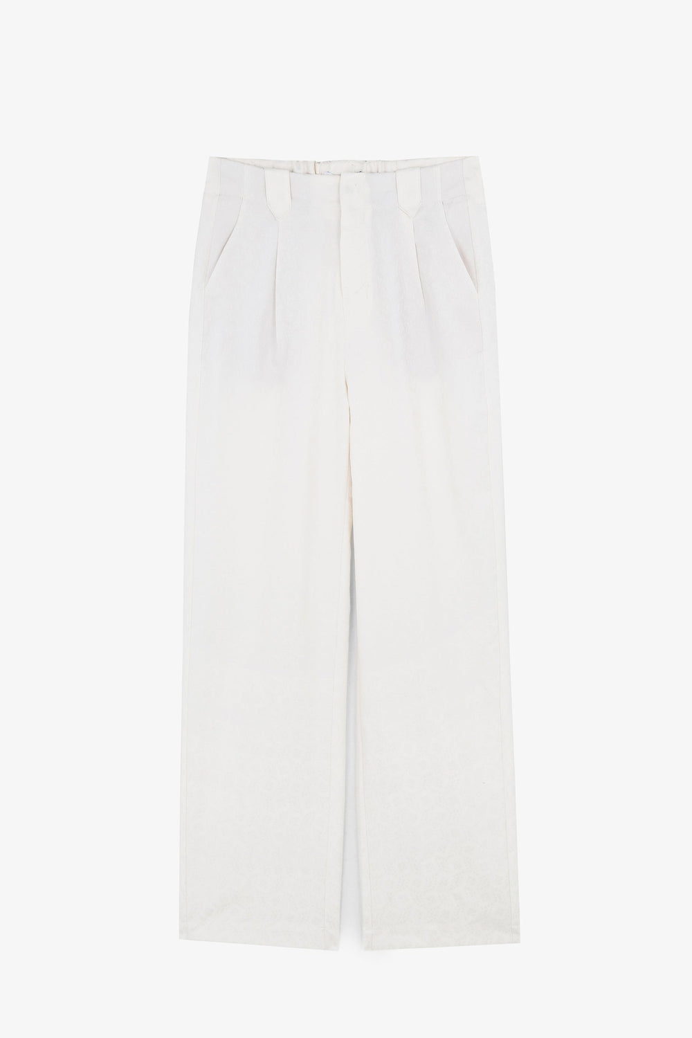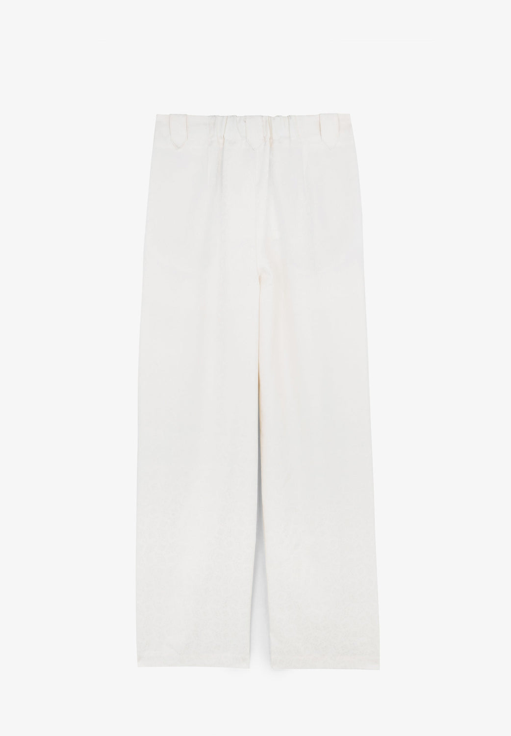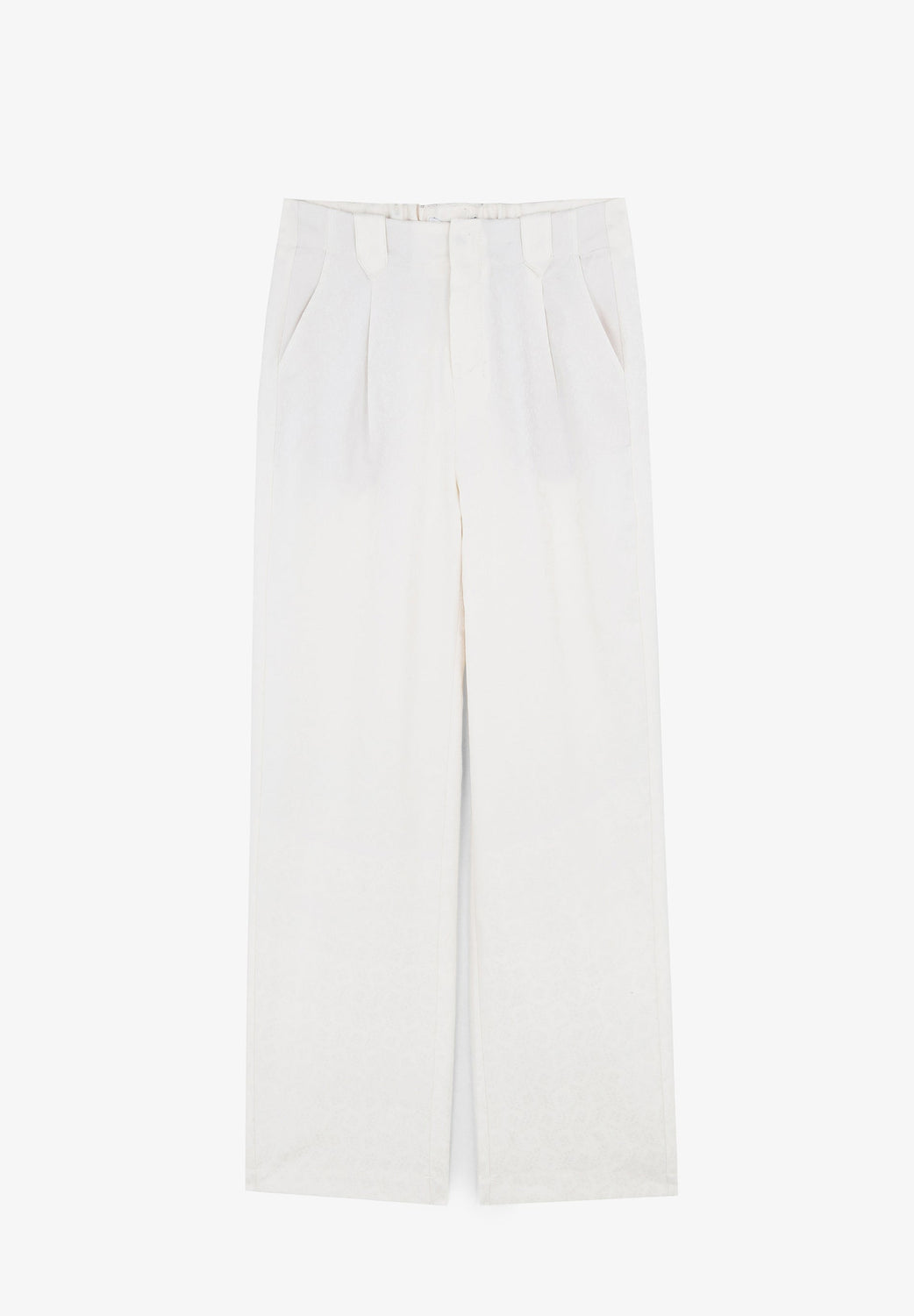 Jacquard flowing fabric trousers. Regular fit with high waist, snap button and zip fastening and side pockets. Belt loops at waist.