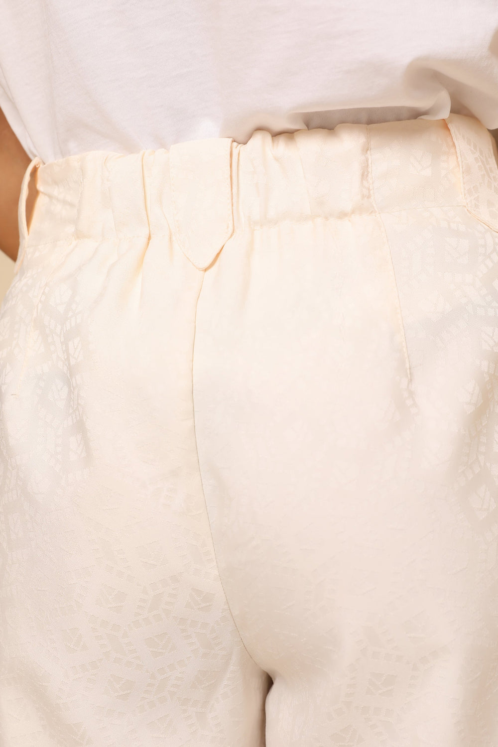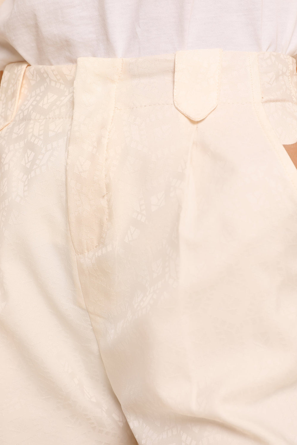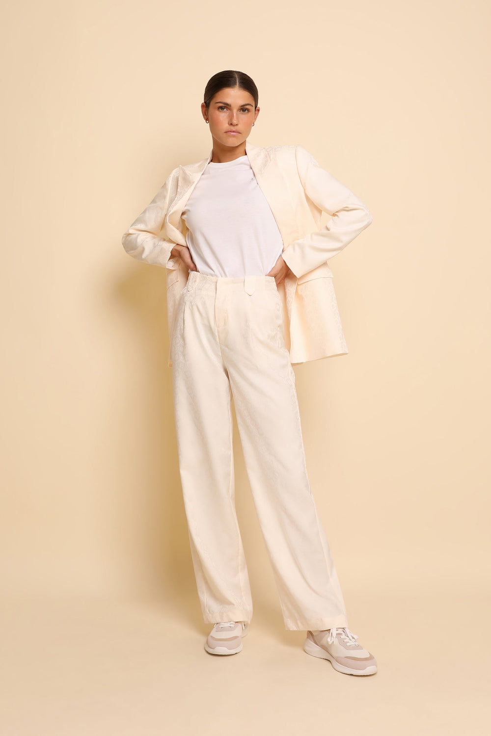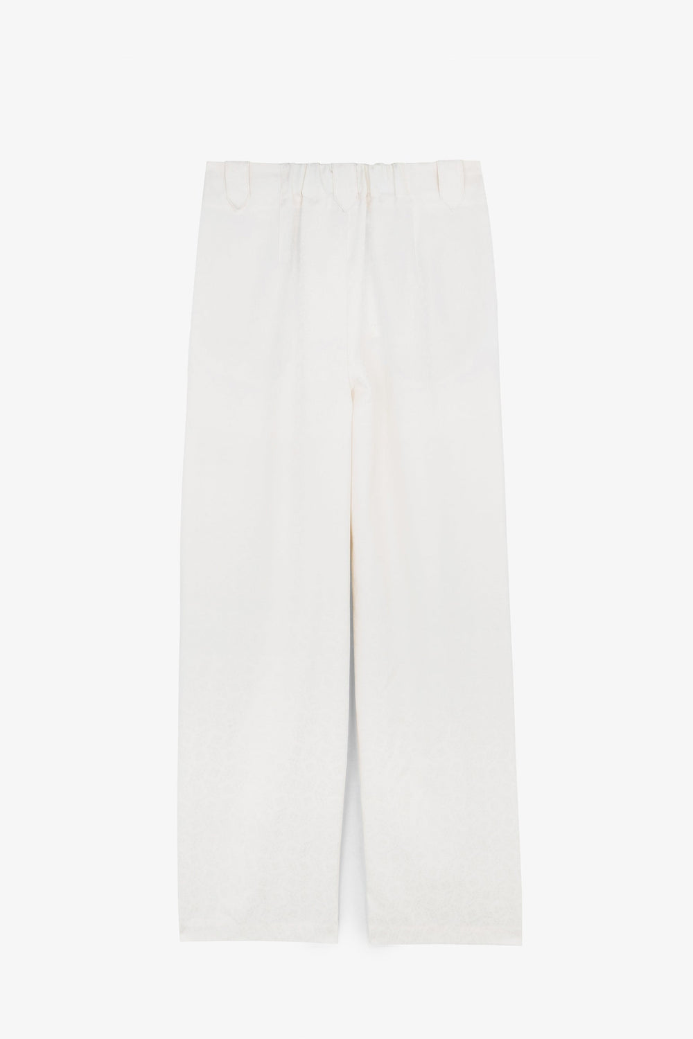 Jacquard flowing fabric trousers. Regular fit with high waist, snap button and zip fastening and side pockets. Belt loops at waist.
