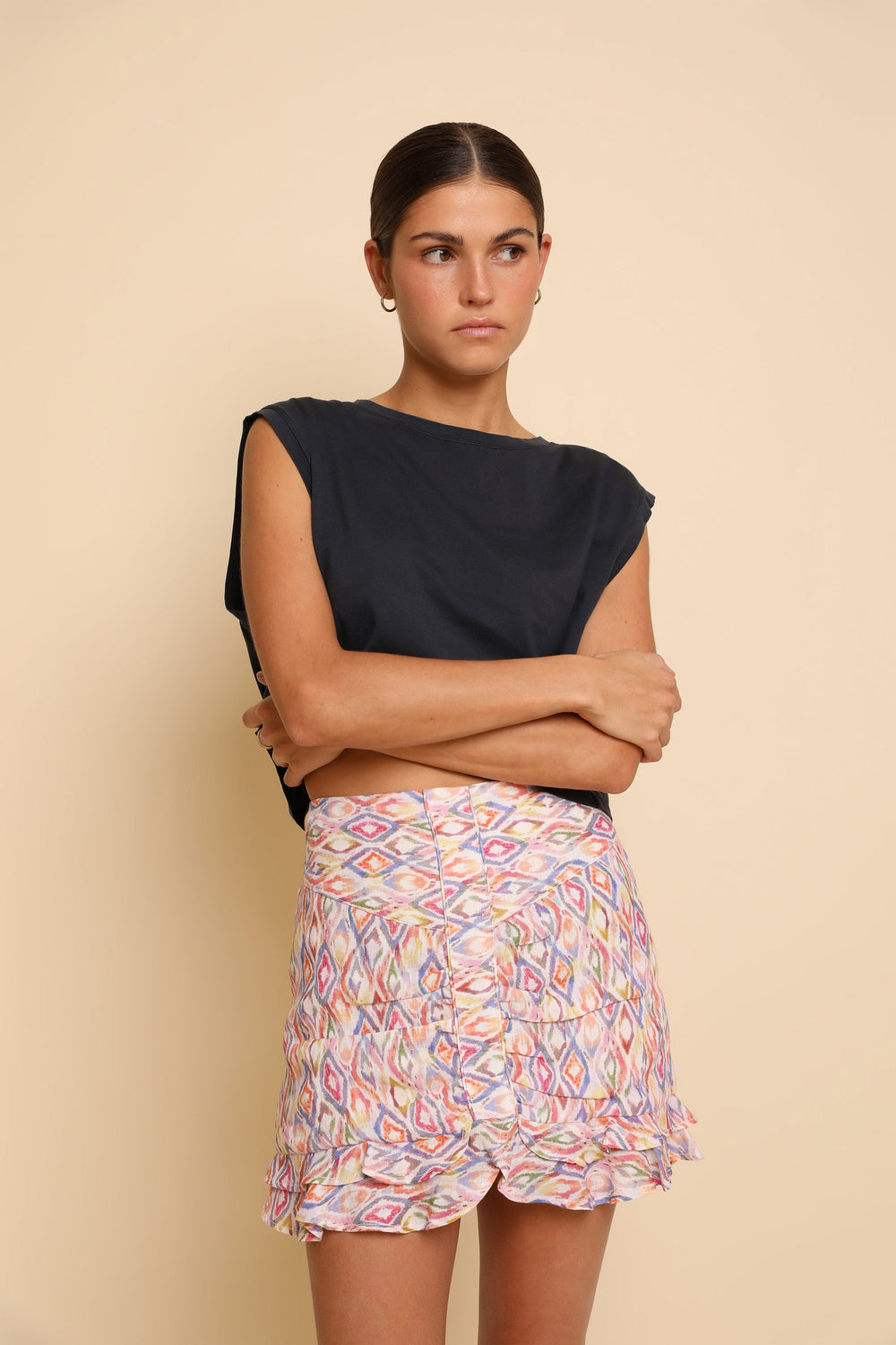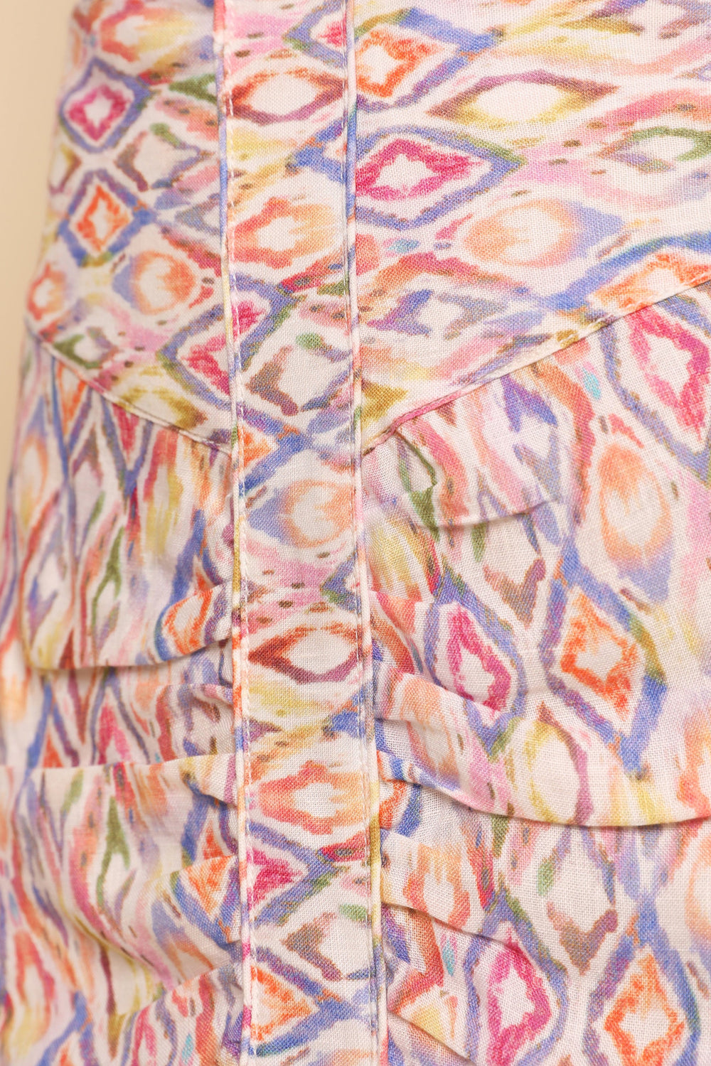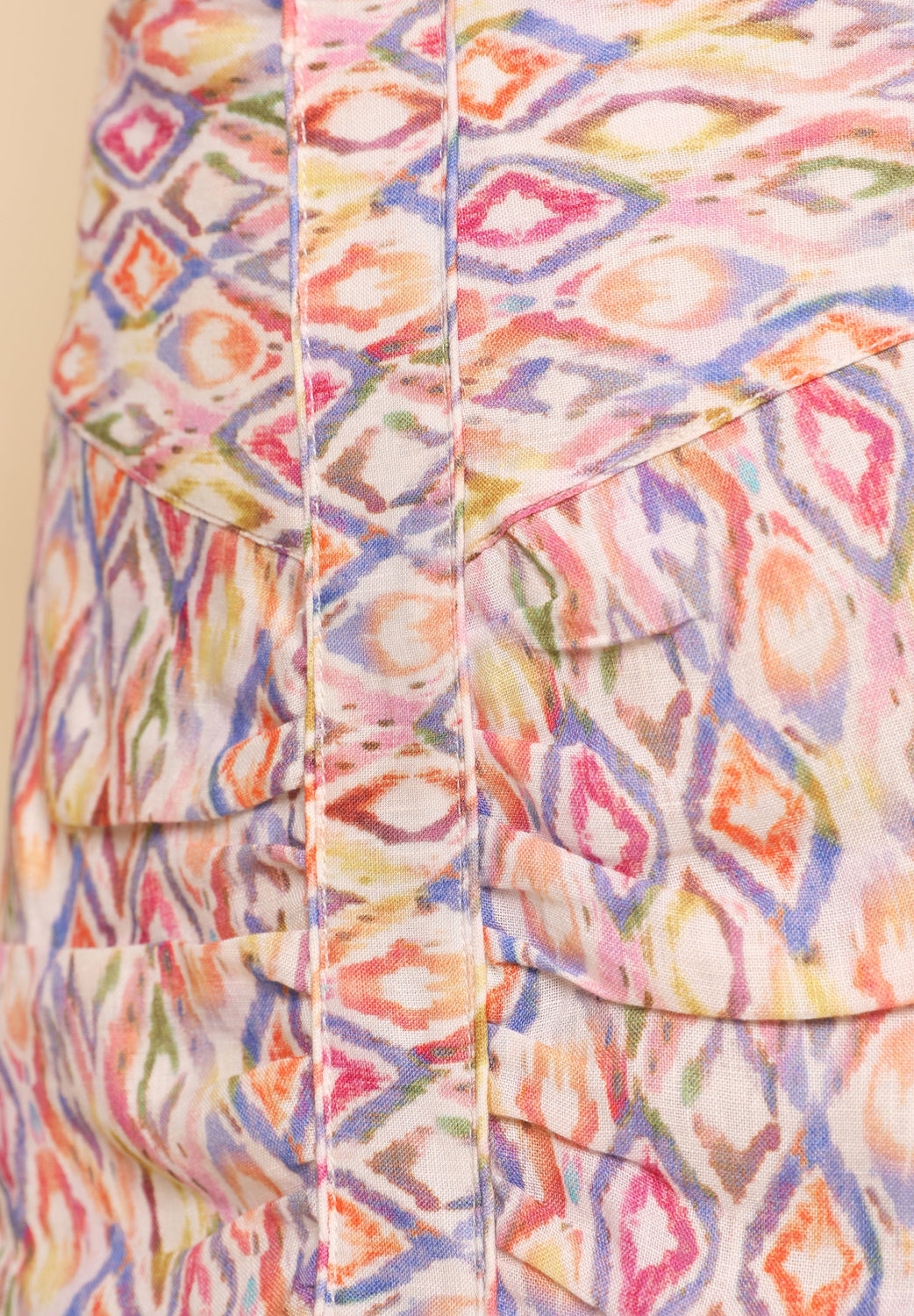 Skirt with ethic motif, made of 100% linen. Slim fit, zip fastening and ruffled hem.