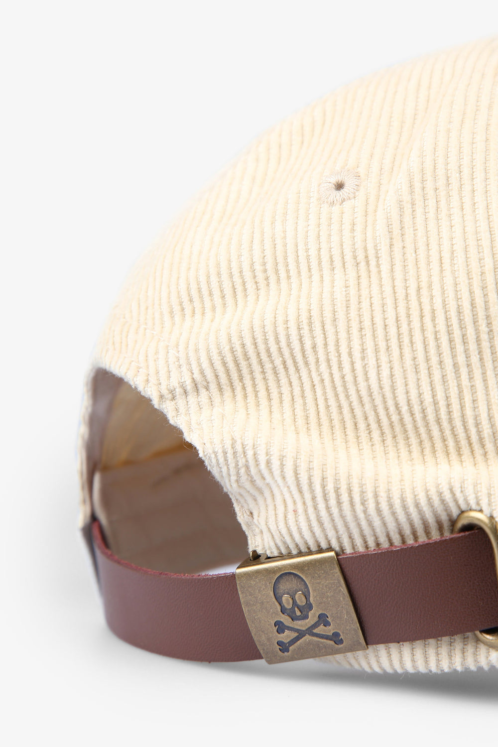 Corduroy cap with a front embroidered logo made from a cotton blend. Adjustable back fastening with a leather strap.