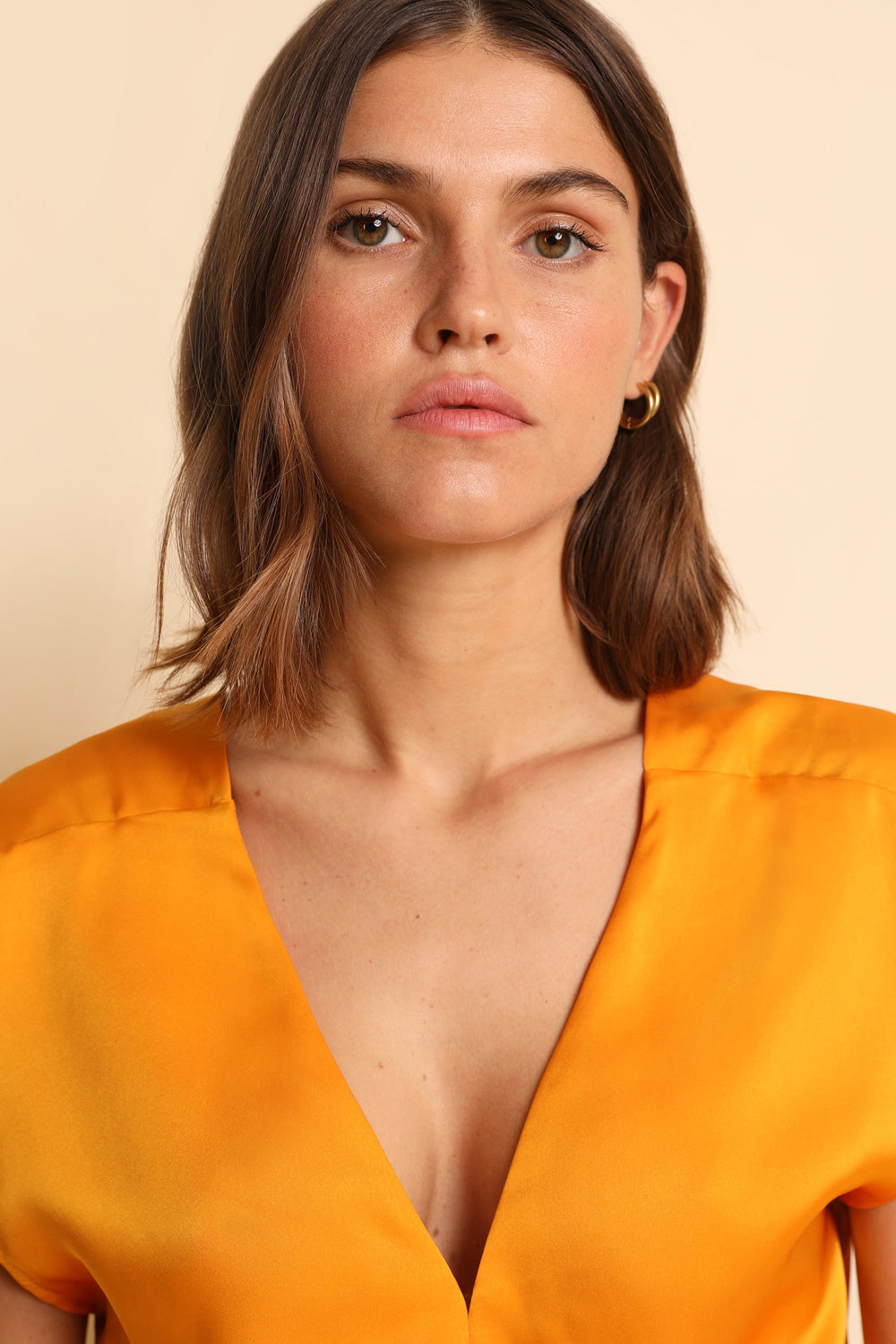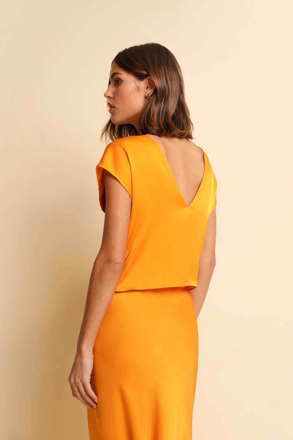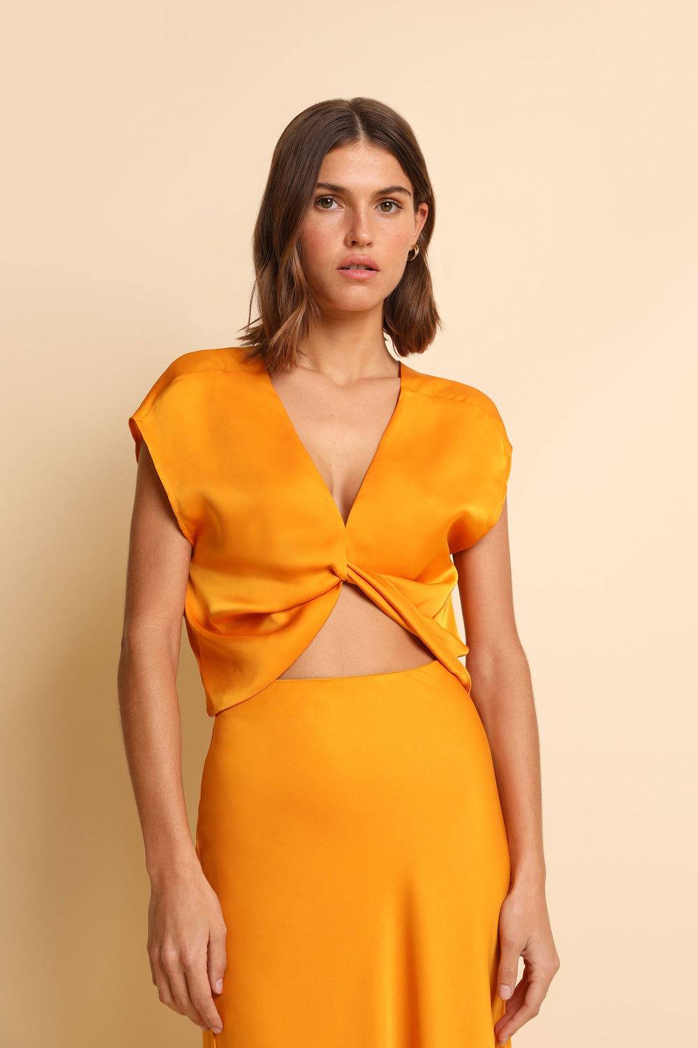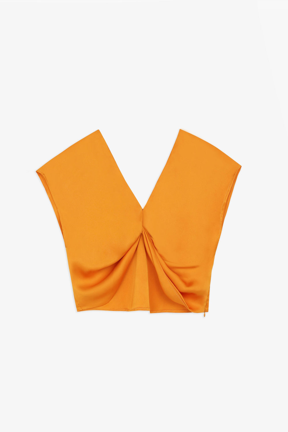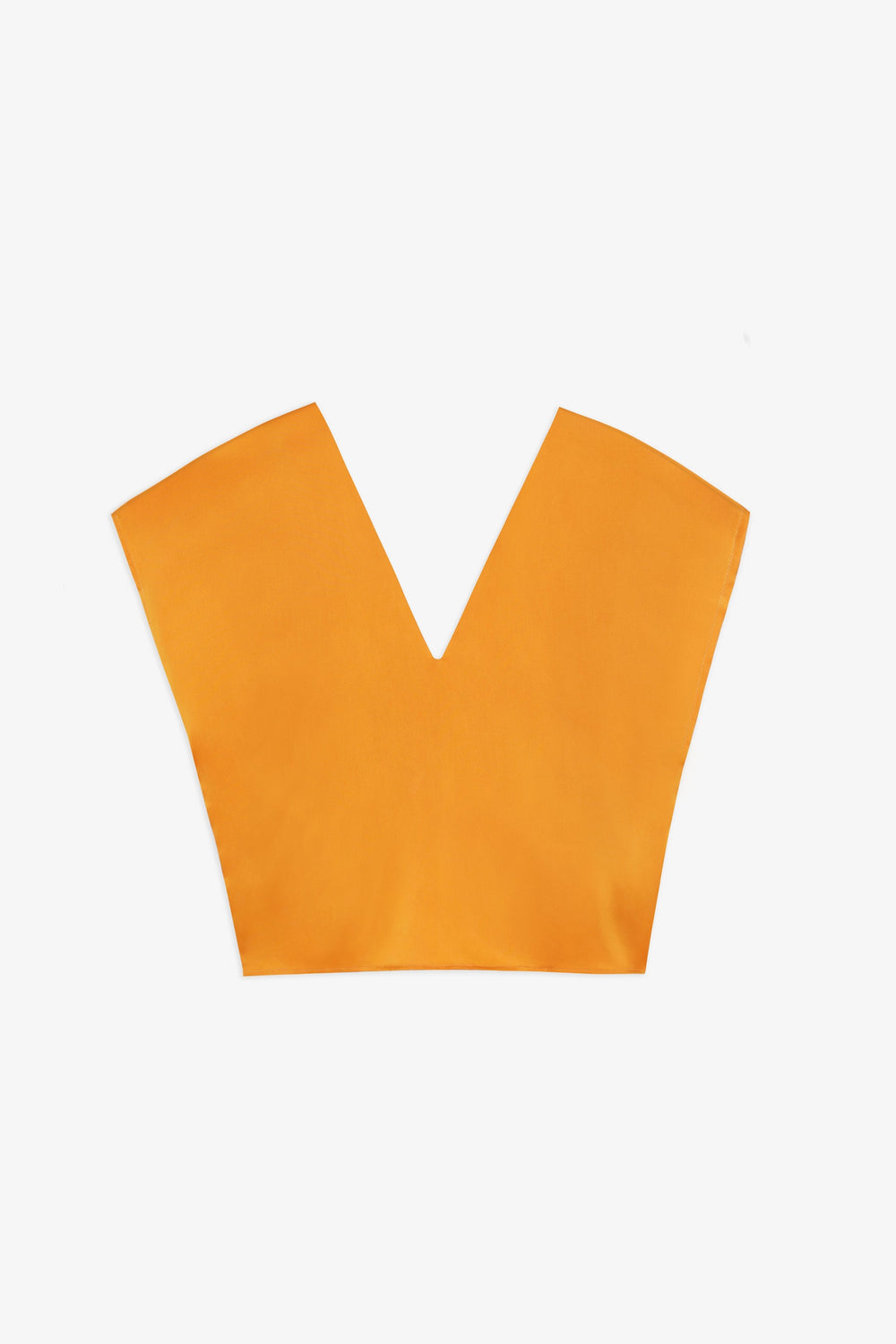 Cropped satin top made from recycled polyester. Reversible front and back, sleeveless design and knot detail.