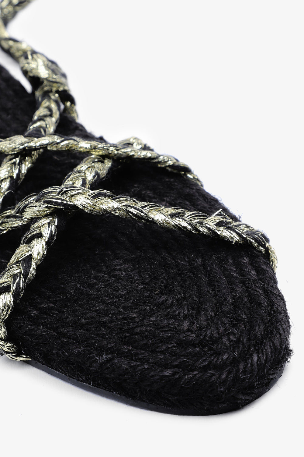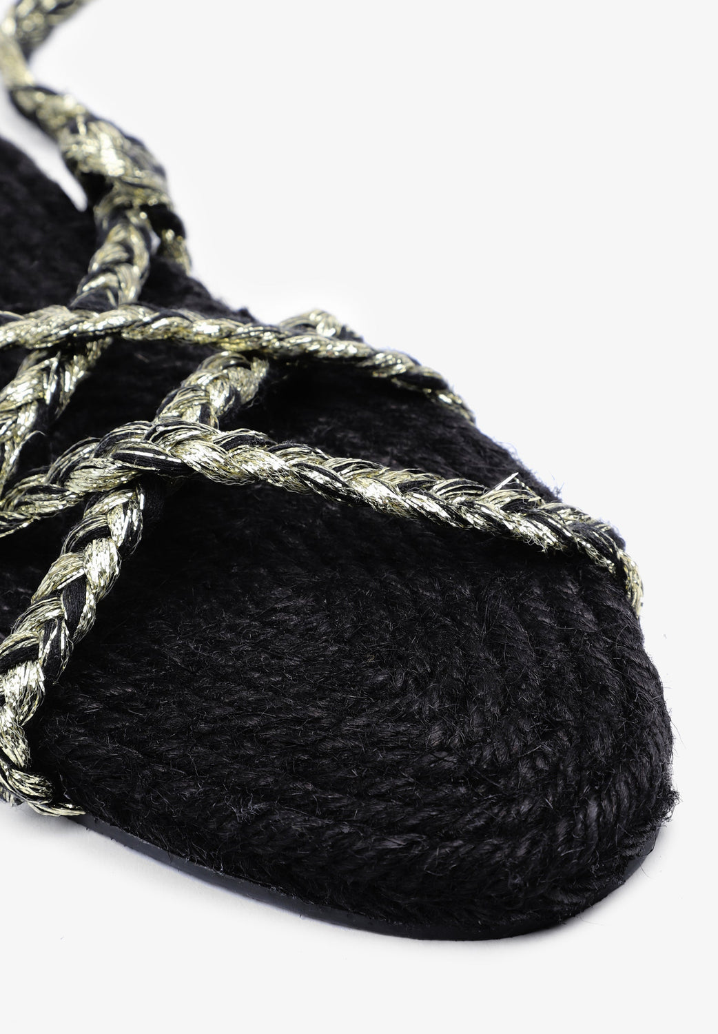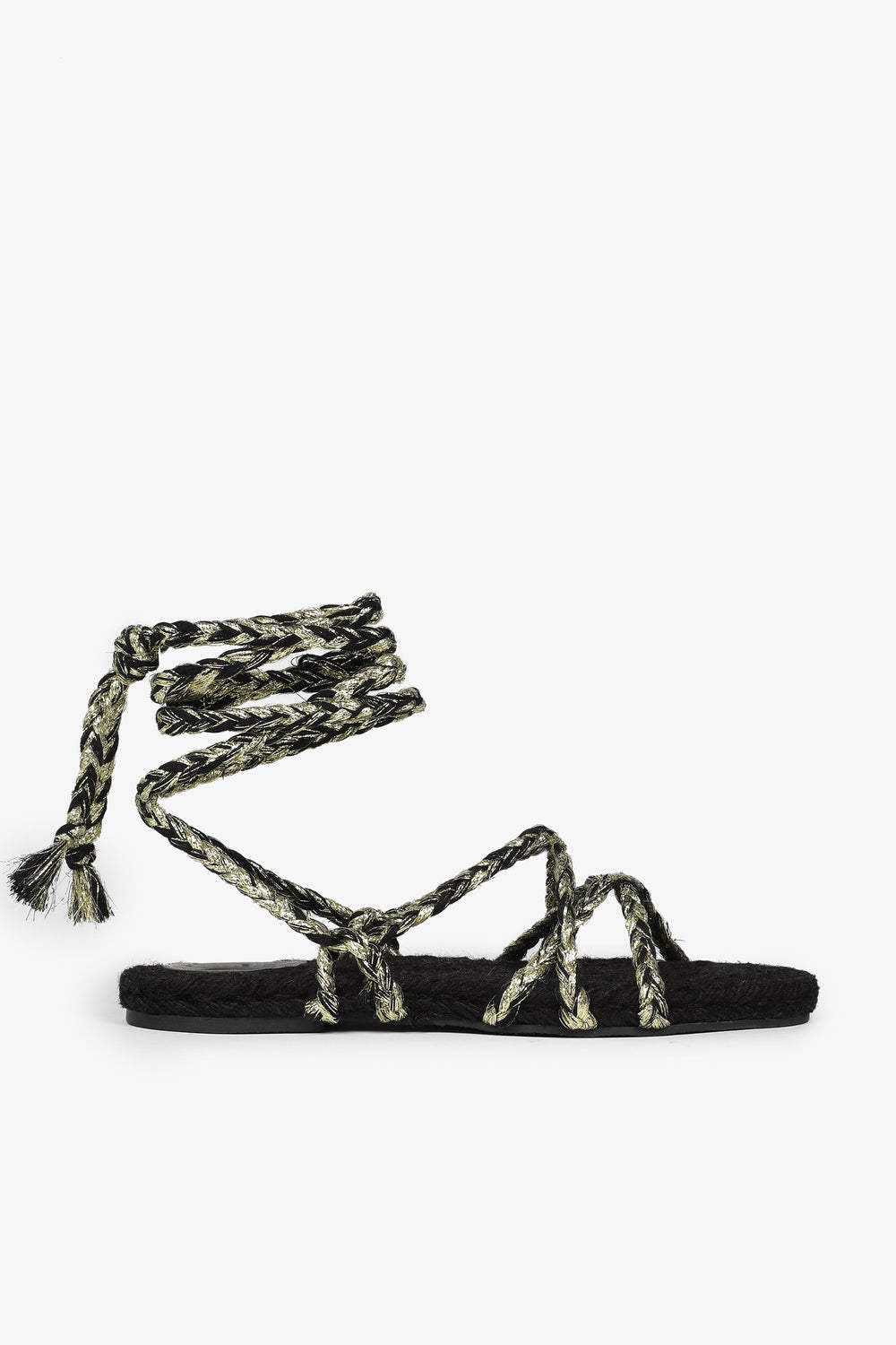 Flat sandals made with metallic nylon cords and jute insole Braided cord tie fastening and rubber sole.