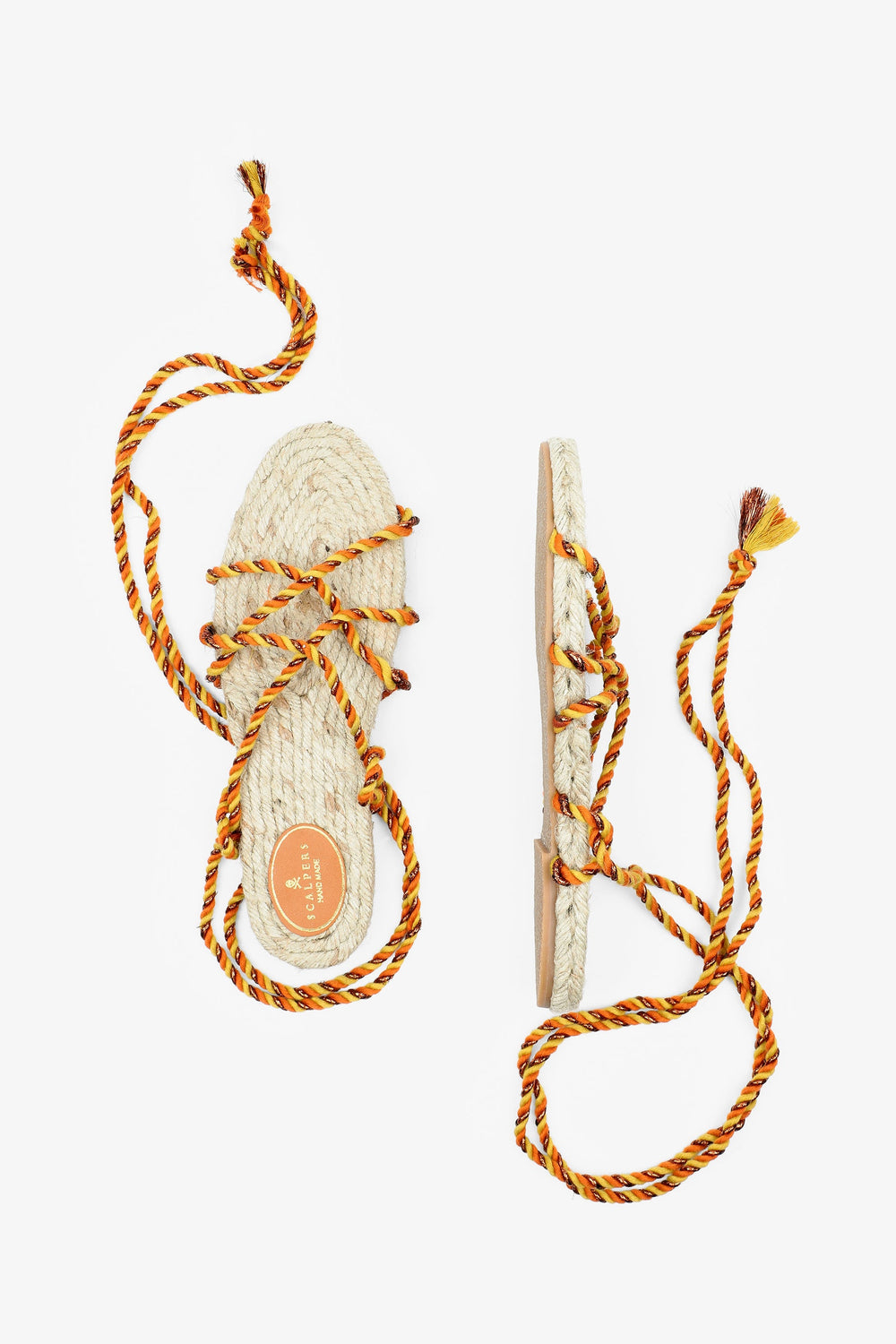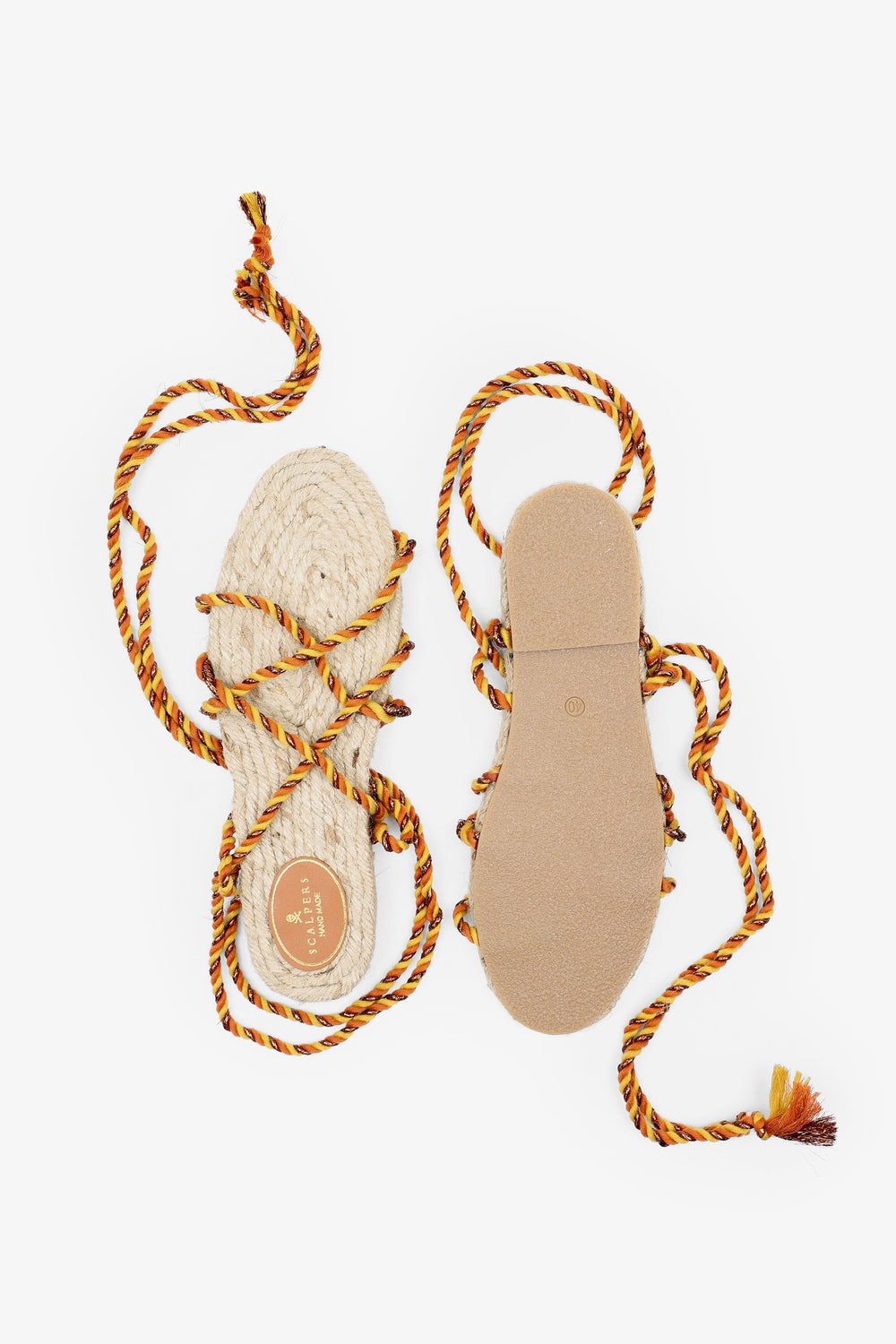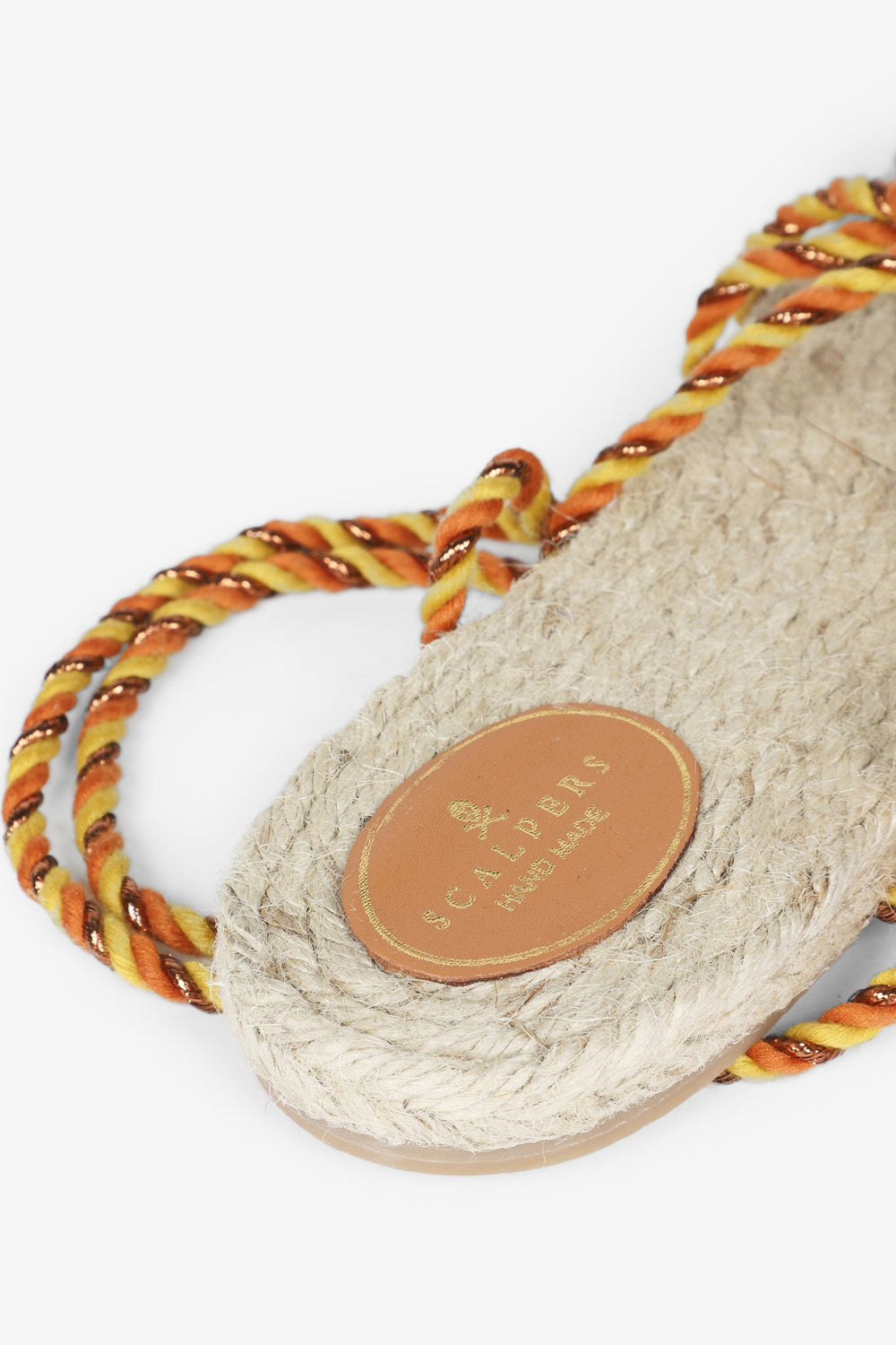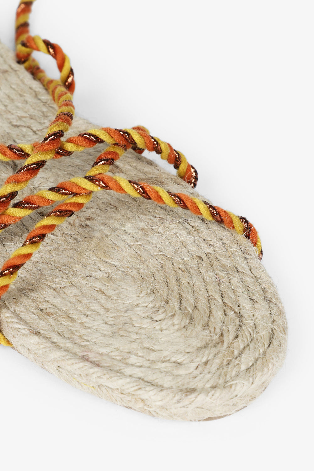 Flat sandals made with metallic nylon cords and jute insole Braided cord tie fastening and rubber sole.
