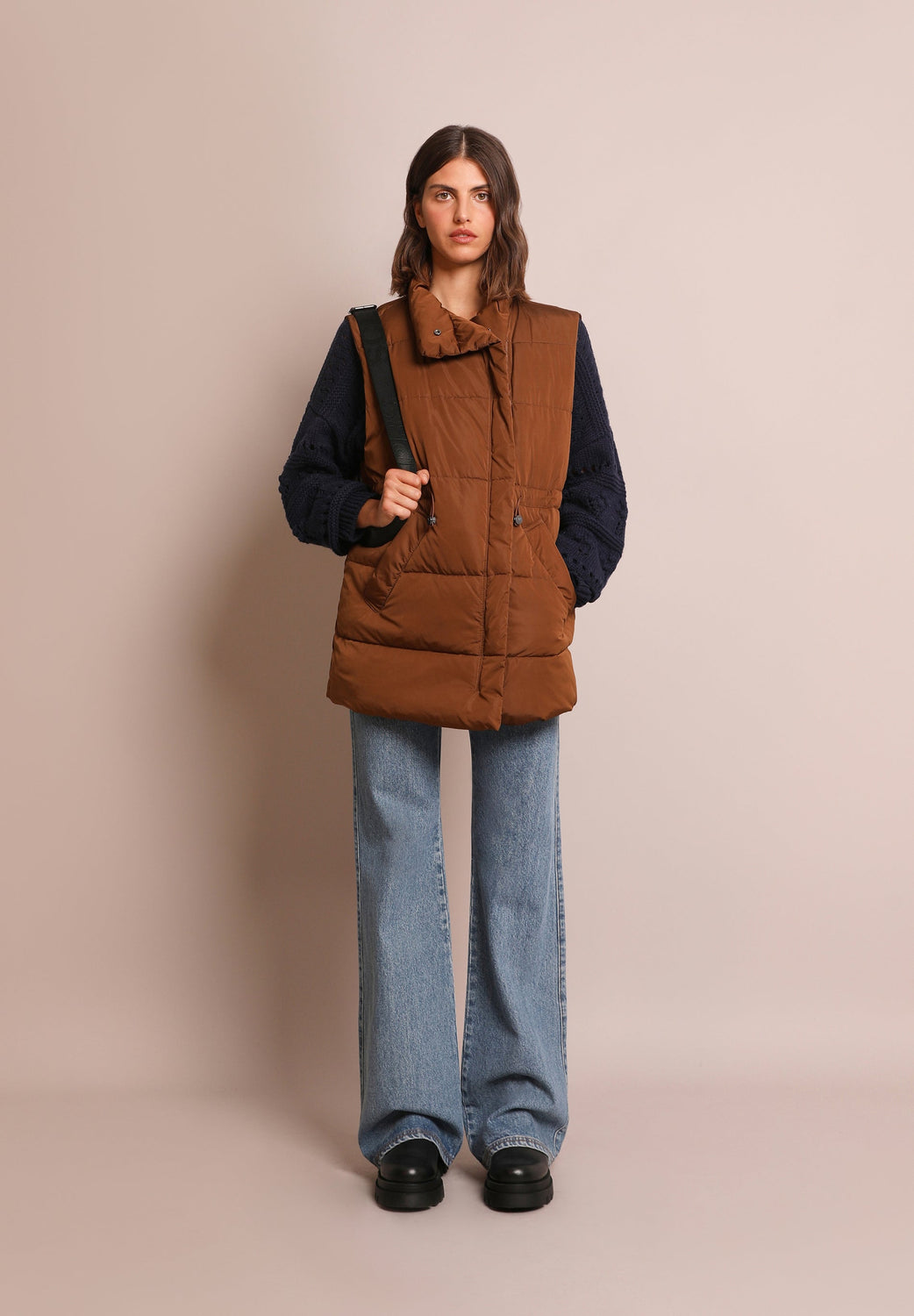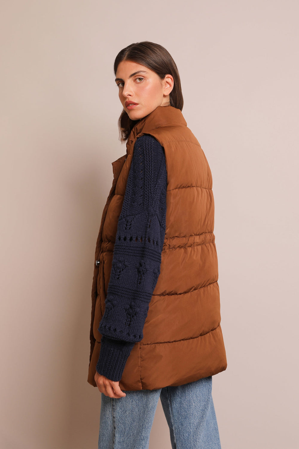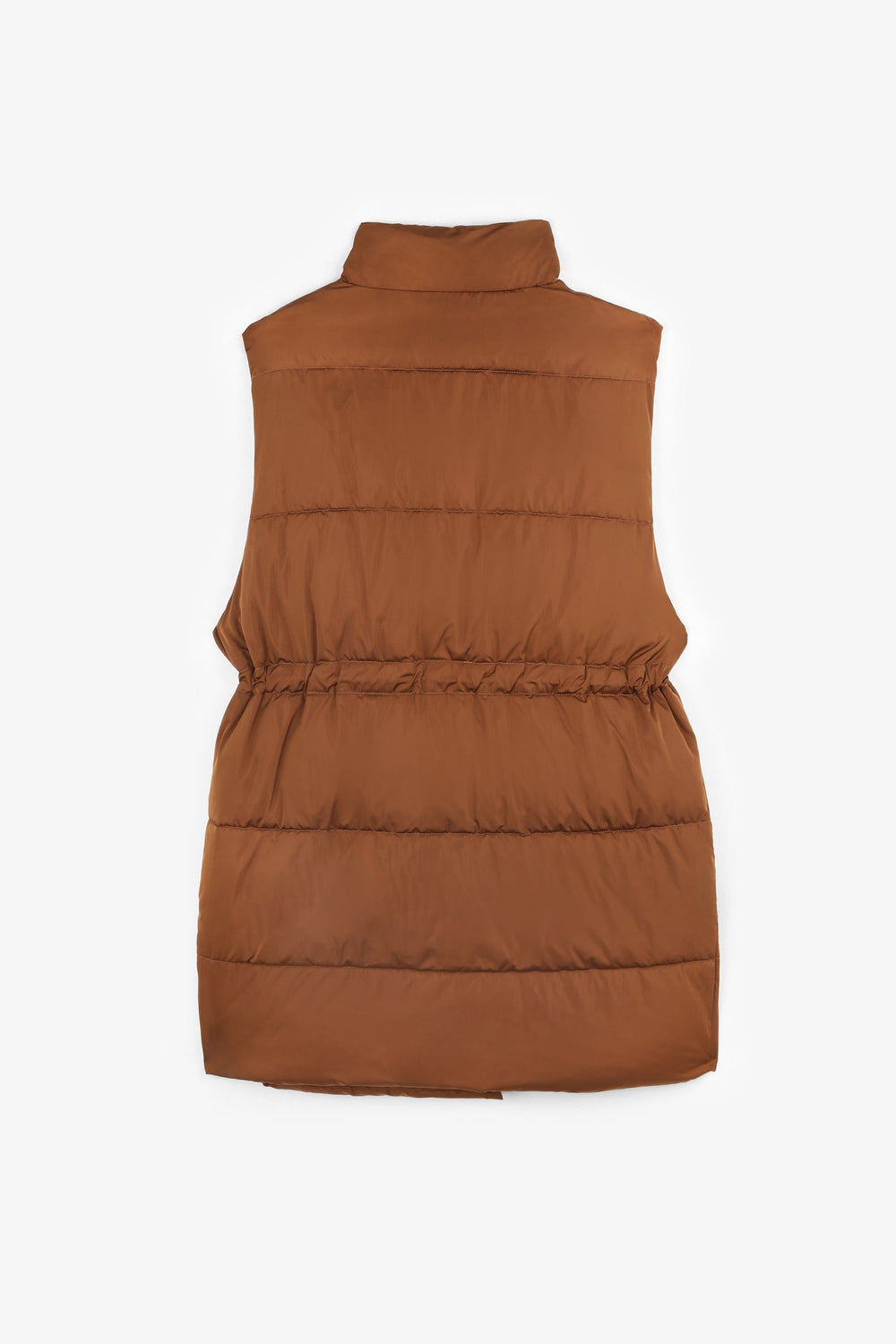 Mid-length quilted gilet made of technical fabric. Regular fit, with adjustable waist, zip and snap button fastening and high collar. Side pockets.