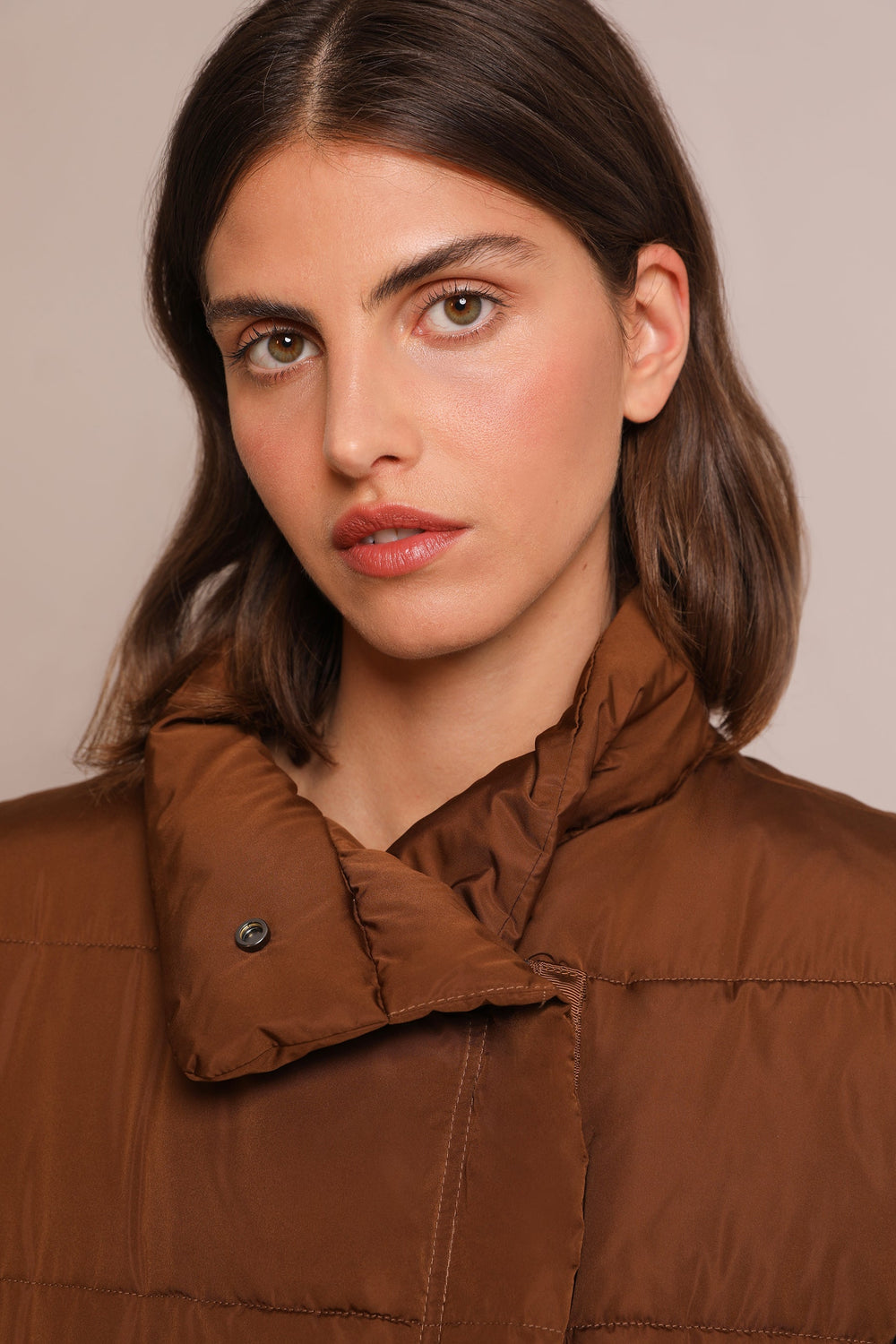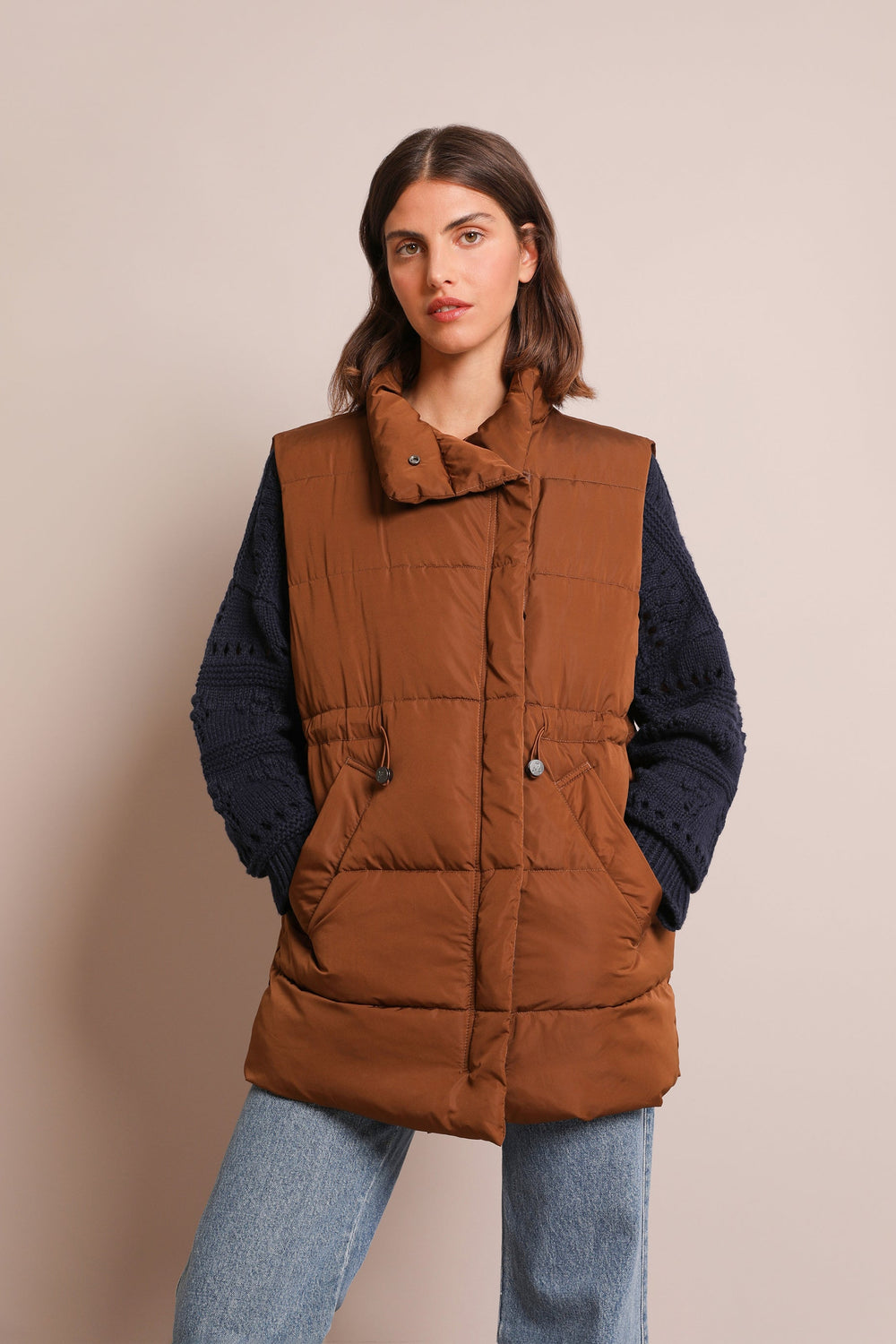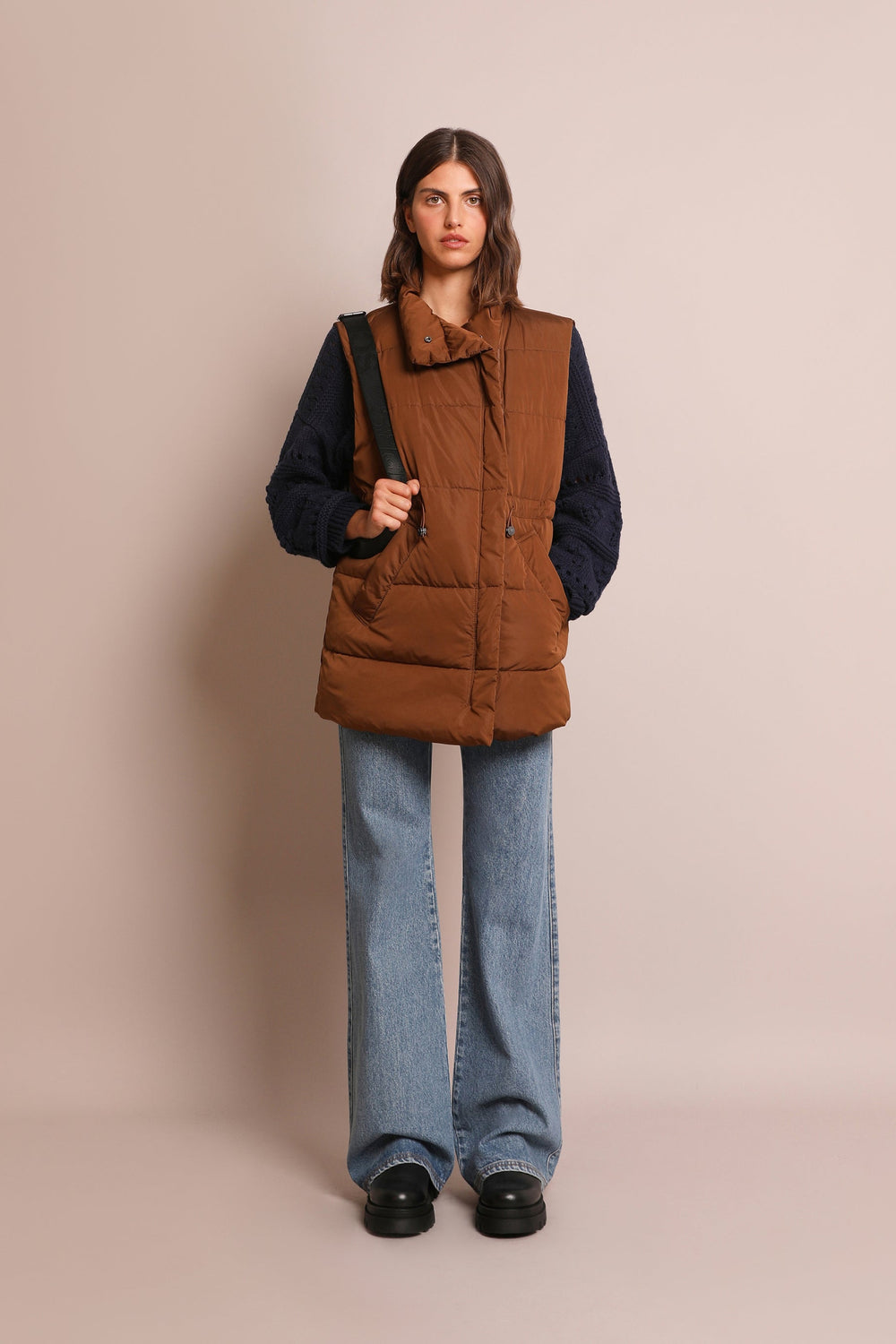 Mid-length quilted gilet made of technical fabric. Regular fit, with adjustable waist, zip and snap button fastening and high collar. Side pockets.