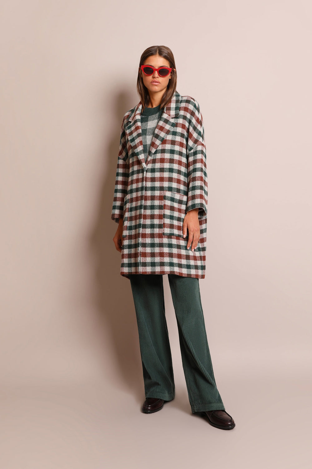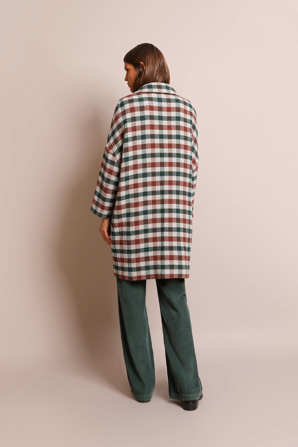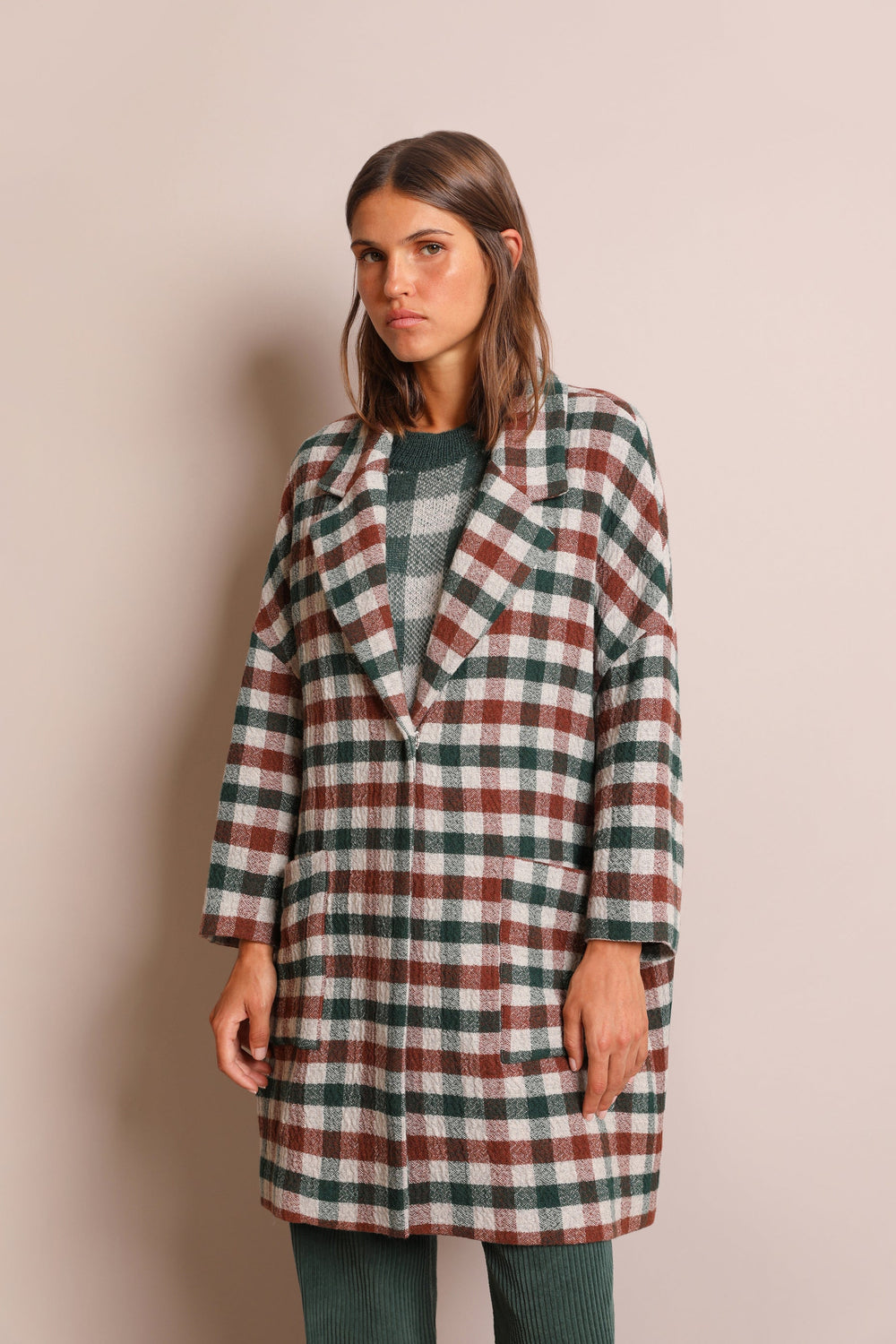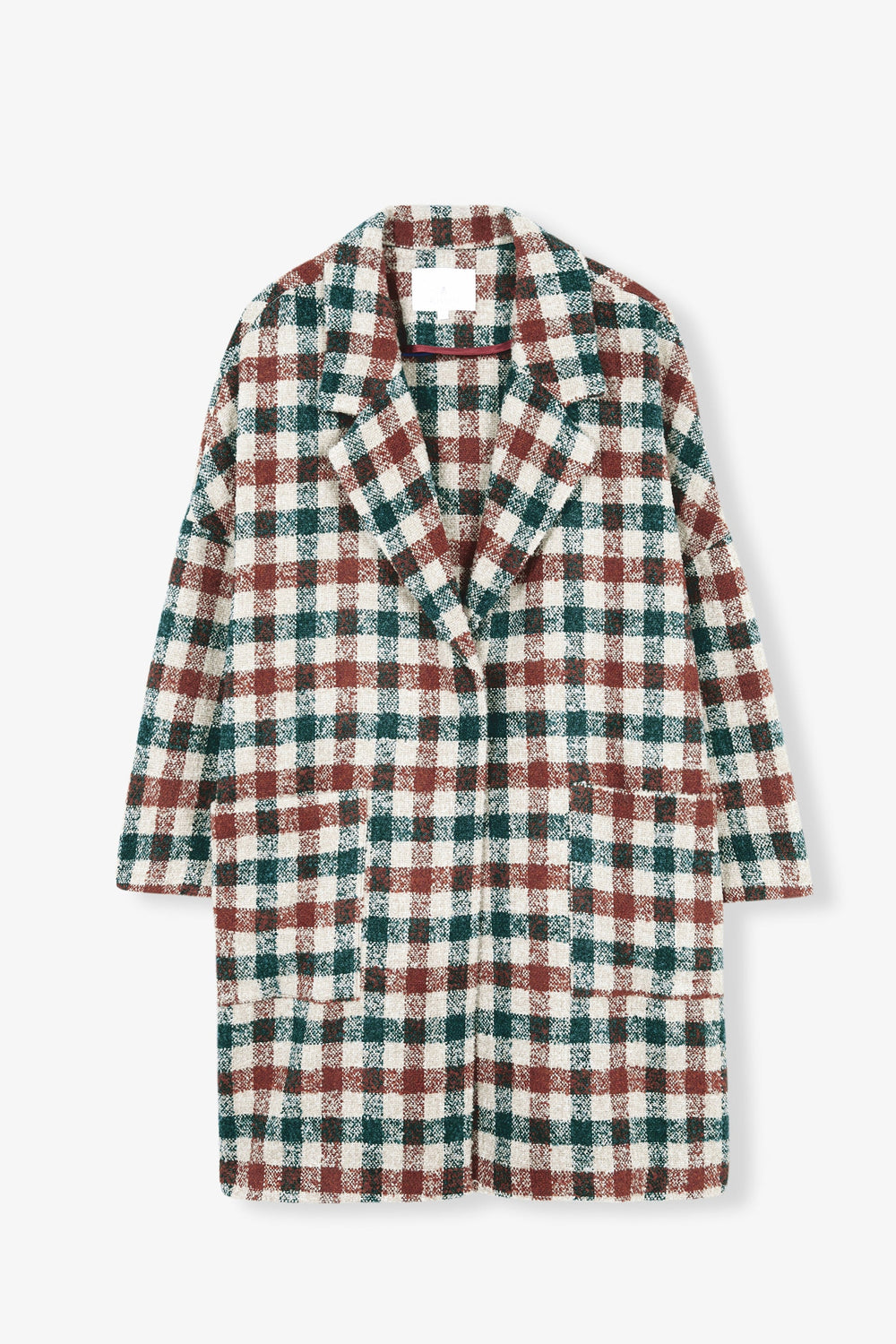 Check cloth midi coat made of a wool and cotton blend. Regular fit, notched lapel collar and snap button fastening. Long sleeves and patch pockets.