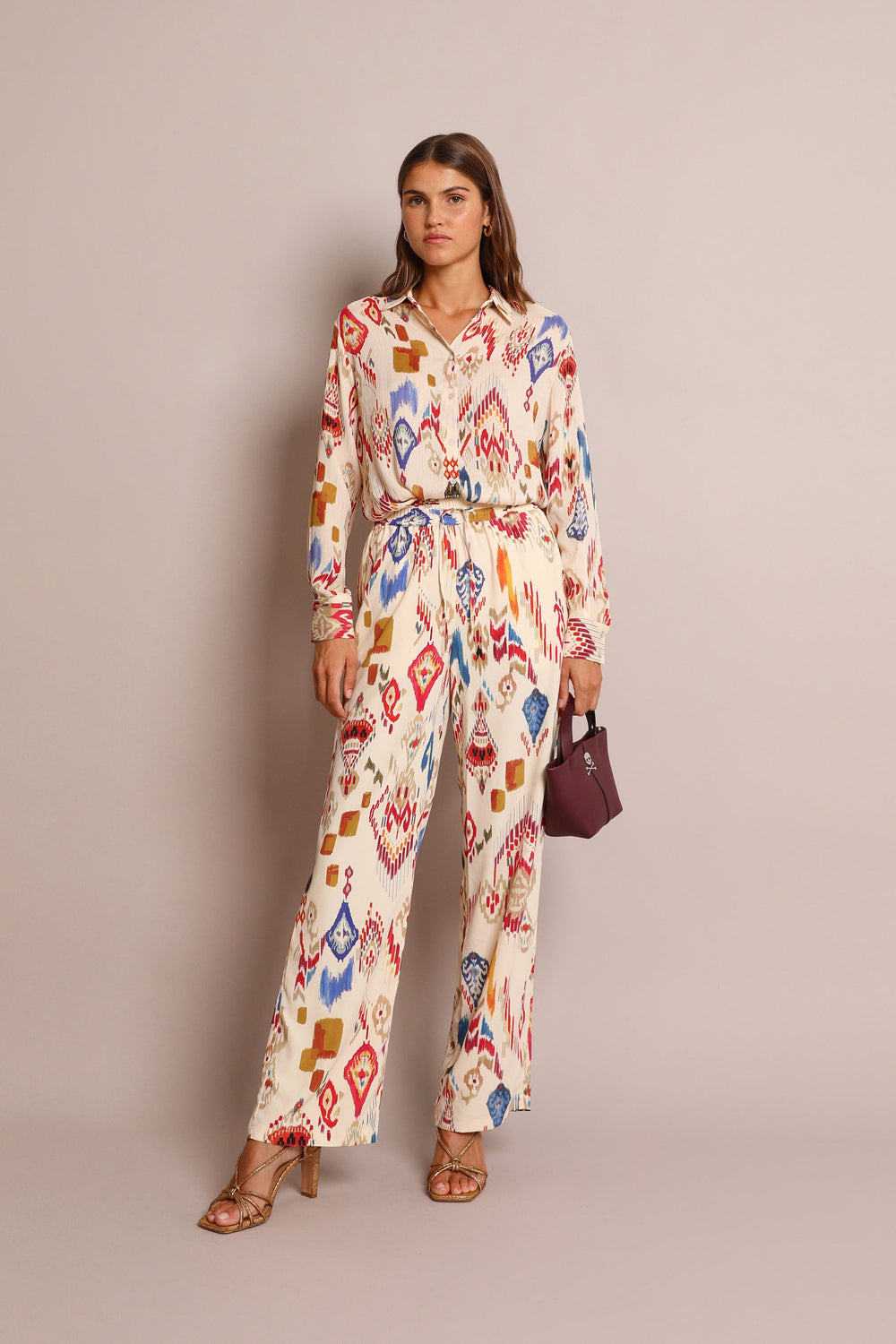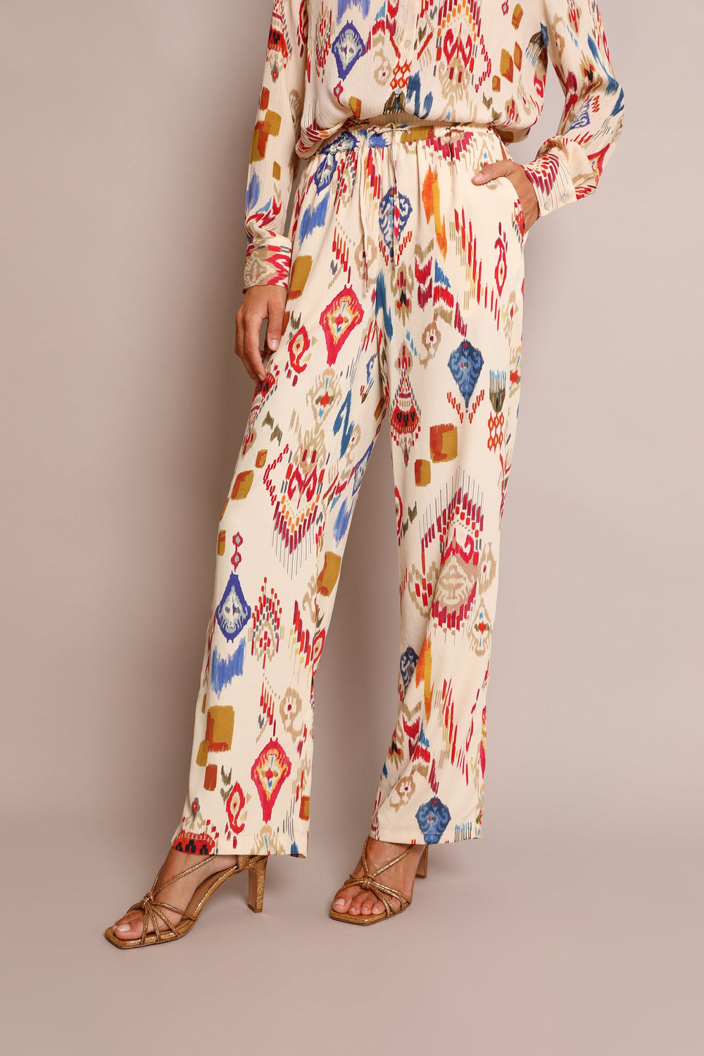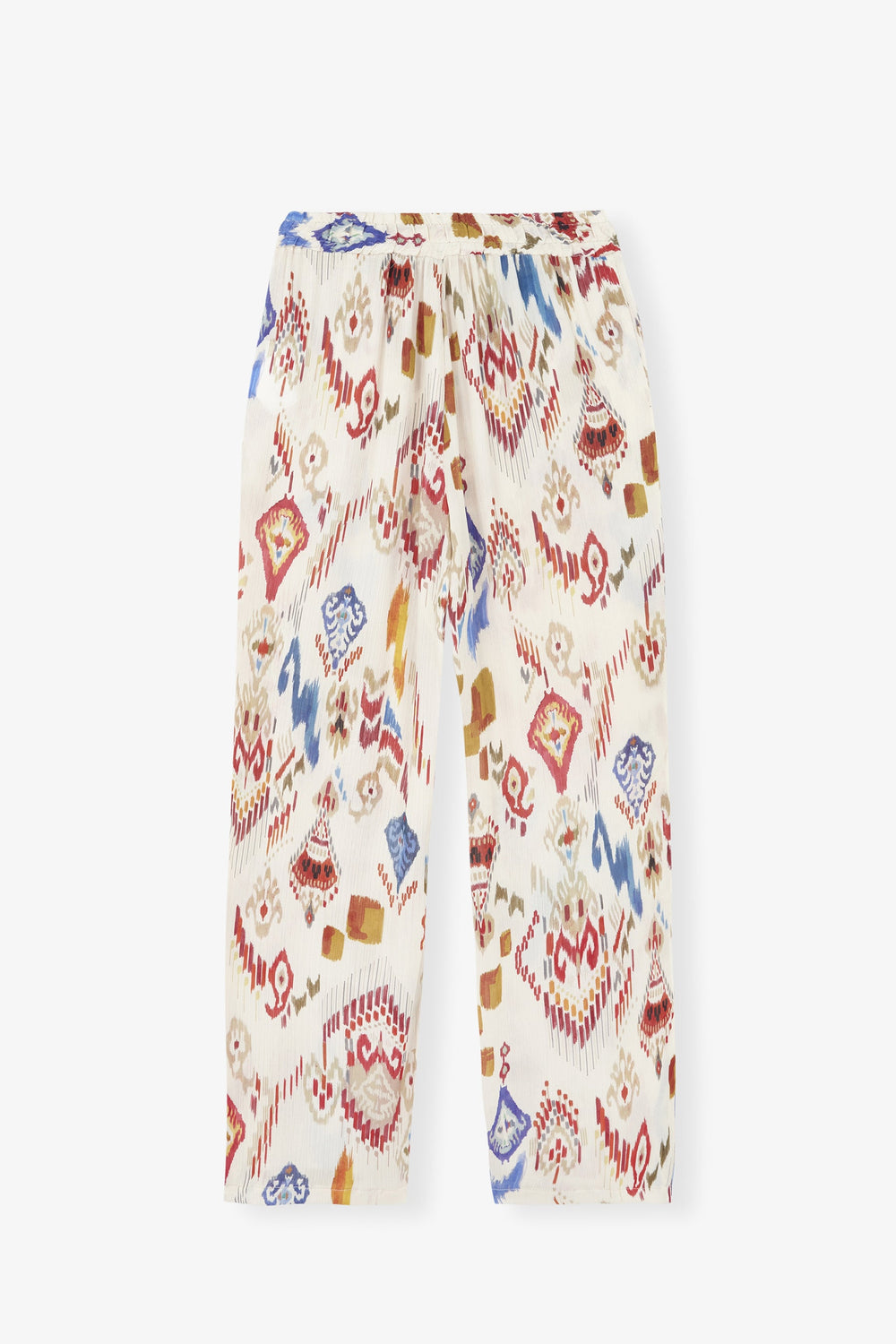 Printed trousers. Made from loose-fitting fabric, regular fit, side pockets, elasticated waistband and bow fastening.