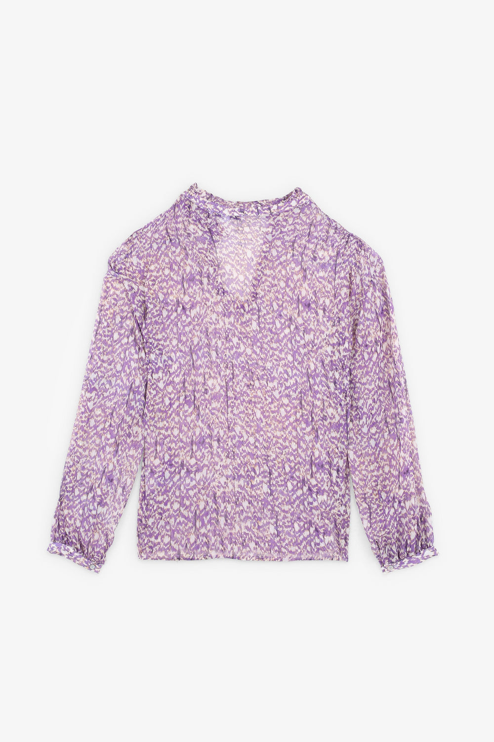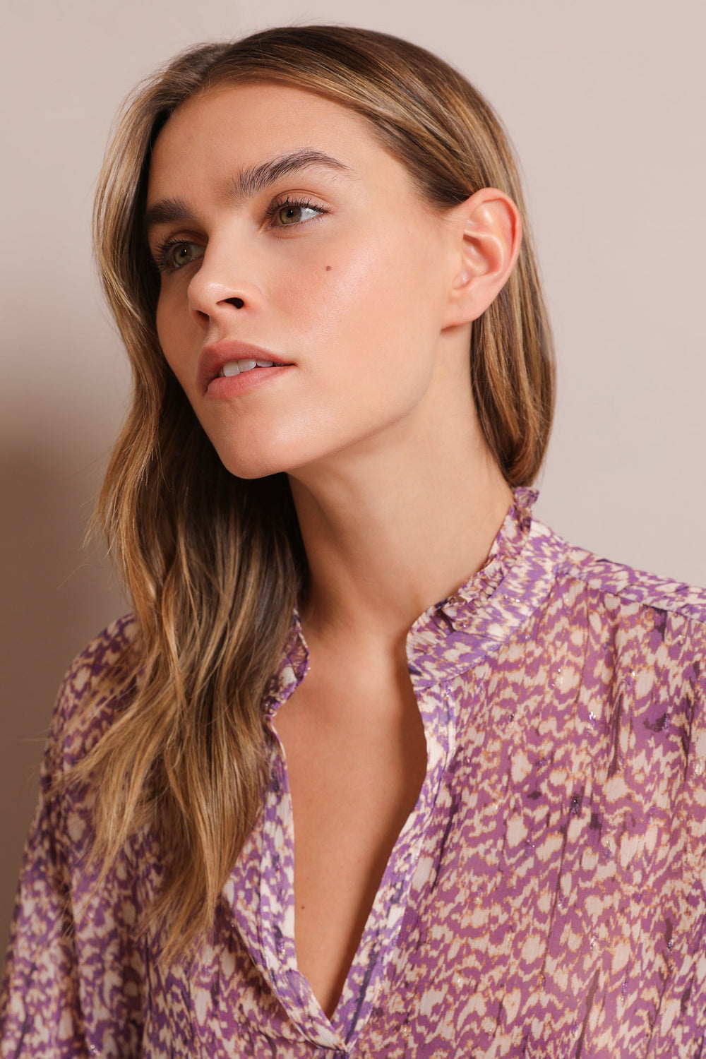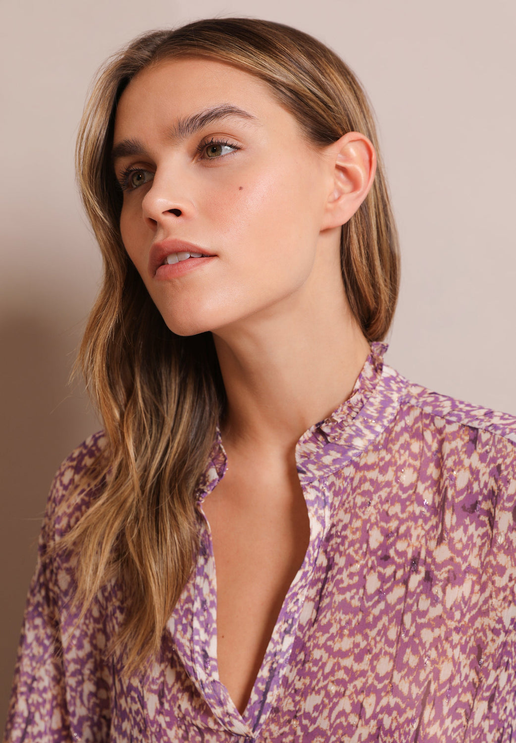 Blouse with metallic print. Made from flowing fabric with metallic thread, V-neck and long balloon sleeves with cuffs.